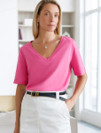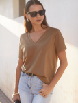Облегающая футболка с V-образным вырезом в цвете "шардоне" создаст утонченный образ. Идеальная базовая модель для вашего гардероба! Глубокий V-образный вырез подчеркивает линию шеи и зрительно удлиняет силуэт. Футболка выполнена из хлопка с добавлением эластана, которая мягко облегает контуры тела, подчеркивая достоинства фигуры. Универсальный вариант для создания стильных повседневных образов.
