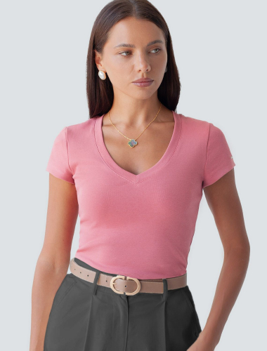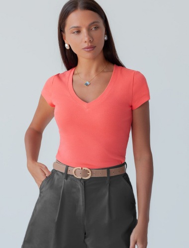 Облегающая футболка с V-образным вырезом террактового цвета создаст утонченный образ. Идеальная базовая модель для вашего гардероба! Глубокий V-образный вырез подчеркивает линию шеи и зрительно удлиняет силуэт. Футболка выполнена из хлопка с добавлением эластана, которая мягко облегает контуры тела, подчеркивая достоинства фигуры. Универсальный вариант для создания стильных повседневных образов.