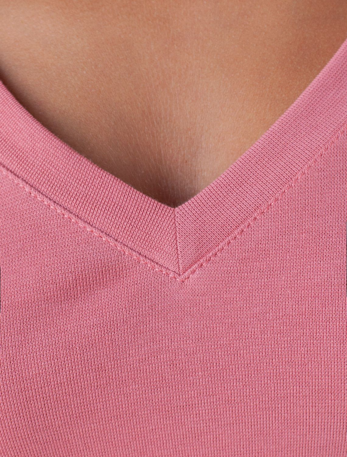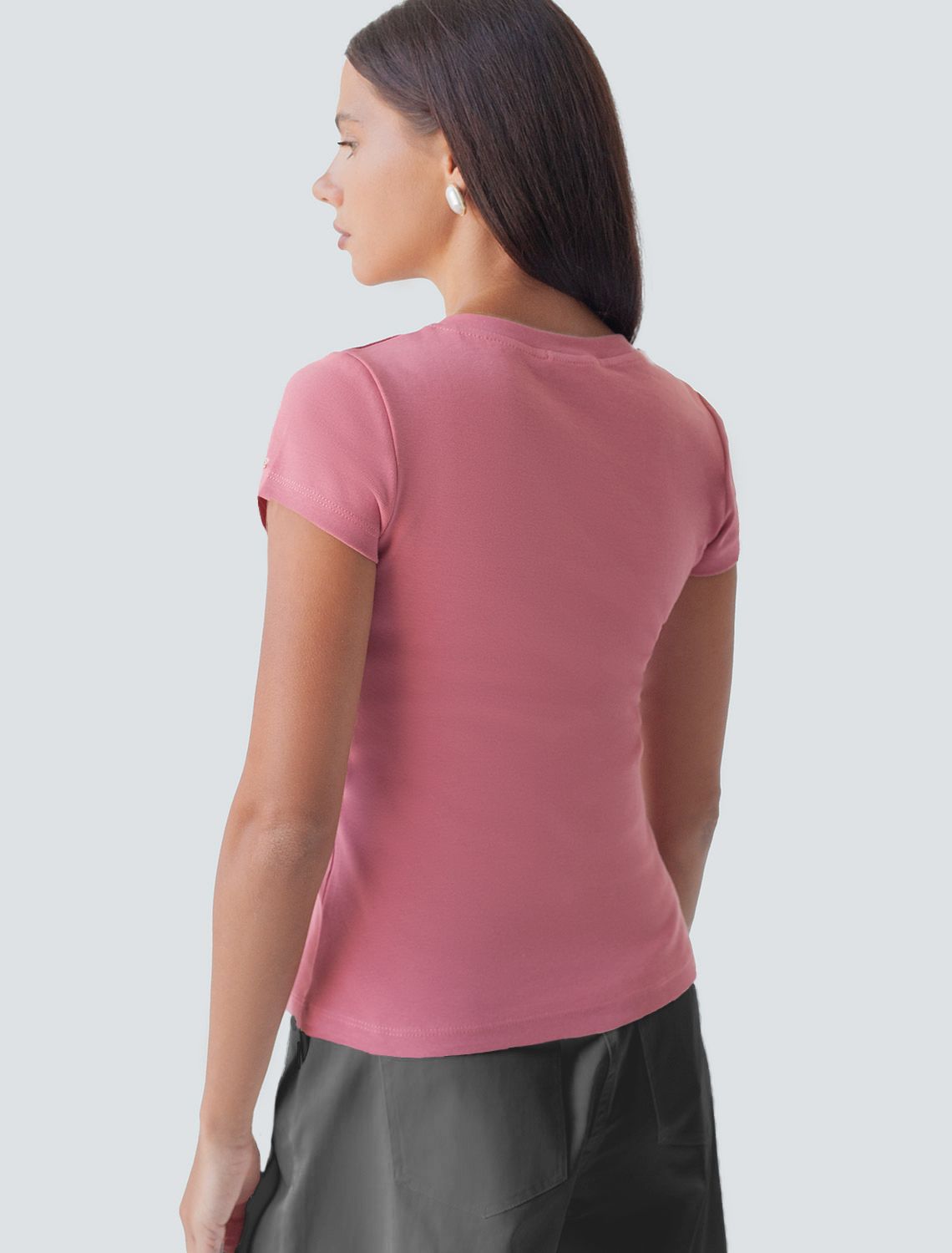 Облегающая футболка с V-образным вырезом оттенка "туманная роза" создаст утонченный образ. Идеальная базовая модель для вашего гардероба! Глубокий V-образный вырез подчеркивает линию шеи и зрительно удлиняет силуэт. Футболка выполнена из хлопка с добавлением эластана, которая мягко облегает контуры тела, подчеркивая достоинства фигуры. Универсальный вариант для создания стильных повседневных образов.