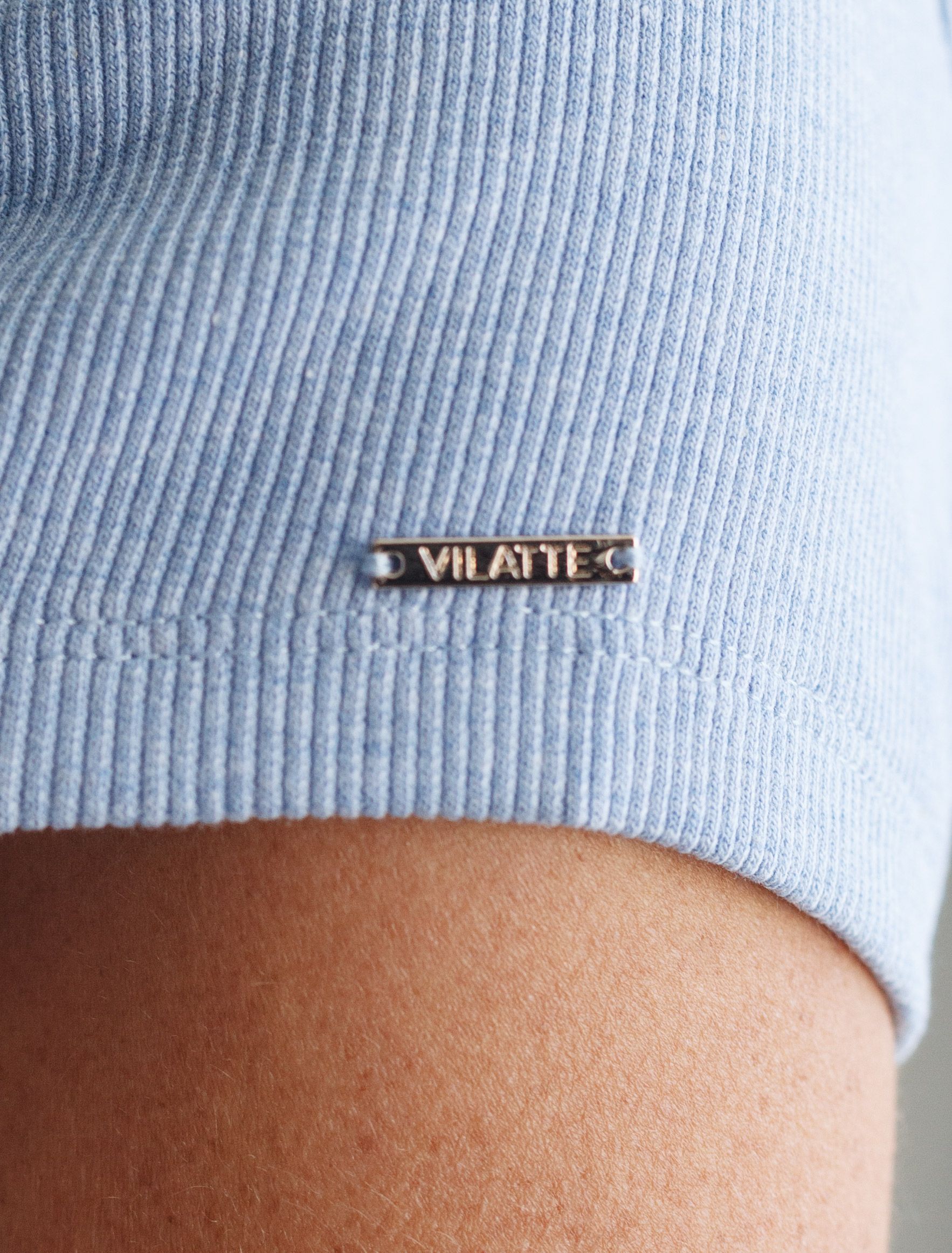 Стильная облегающая футболка в цвете голубой меланж с V-образным вырезом сшита из плотного хлопкового трикотажа в рубчик с добавлением эластана, что гарантирует комфортную посадку по фигуре. V-вырез подчеркивает линию декольте, добавляя образу нотку элегантности. Практичная модель, которая не деформируется после стирок и сочетается с любым стилем одежды - от кэжуал до смарт-кэжуал.