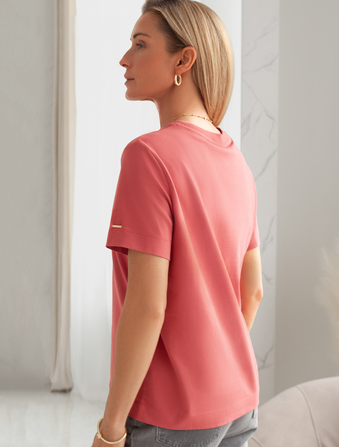 Базовая однотонная футболка из премиального хлопка. Горловина выполнена из рибаны в тон изделия, Добавление эластана в состав изделия способствует формоустойчивости. Самое высокое качество хлопковых волокон обеспечивает комфорт в любое время года. Идеально держит форму и сохраняет внешний вид в течение долговременного использования. Универсальная базовая вещь для ваших стилистических решений. Изделие дополнено металлическим логотипом бренда на рукаве. терракота