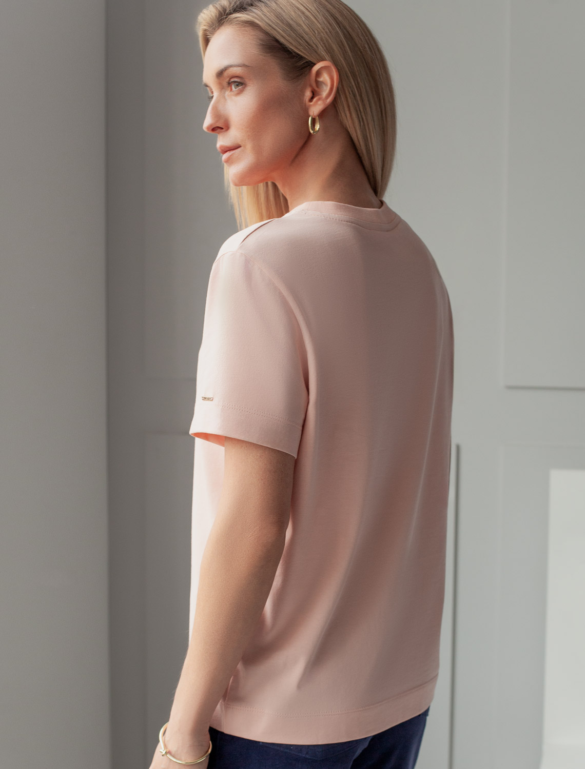 Базовая однотонная футболка из премиального хлопка. Горловина выполнена из рибаны в тон изделия, Добавление эластана в состав изделия способствует формоустойчивости. Самое высокое качество хлопковых волокон обеспечивает комфорт в любое время года. Идеально держит форму и сохраняет внешний вид в течение долговременного использования. Универсальная базовая вещь для ваших стилистических решений. Изделие дополнено металлическим логотипом бренда на рукаве. пудра