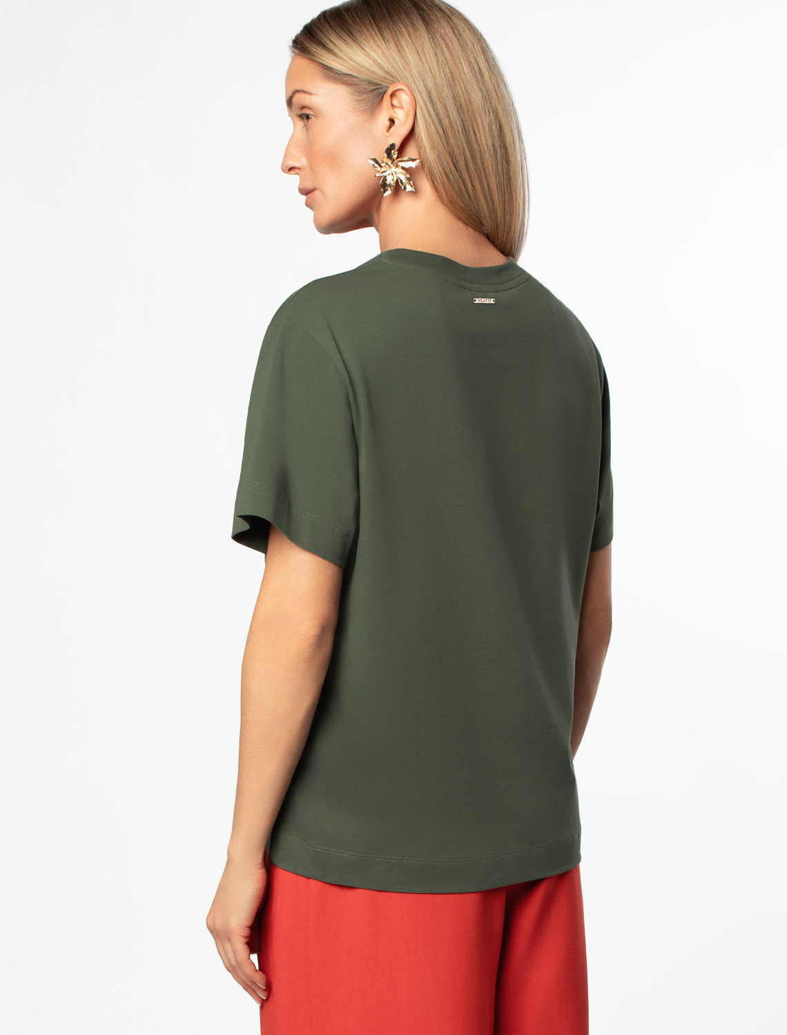 Перевод принта: Strawberries, sweet summer days, 100% organic - клубника, сладкие летние дни, 100% натуральноь. Футболка выполнена из премиального хлопка с эластаном. Авторский принт нанесен красками с устойчивым покрытием. Модель среднего объема легко впишется в повседневные аутфиты и добавит акцента в образы. Эластичный материал гарантирует комфорт и формоустойчивость. Изделие дополнено металлическим логотипом бренда. т.оливковый_клубника