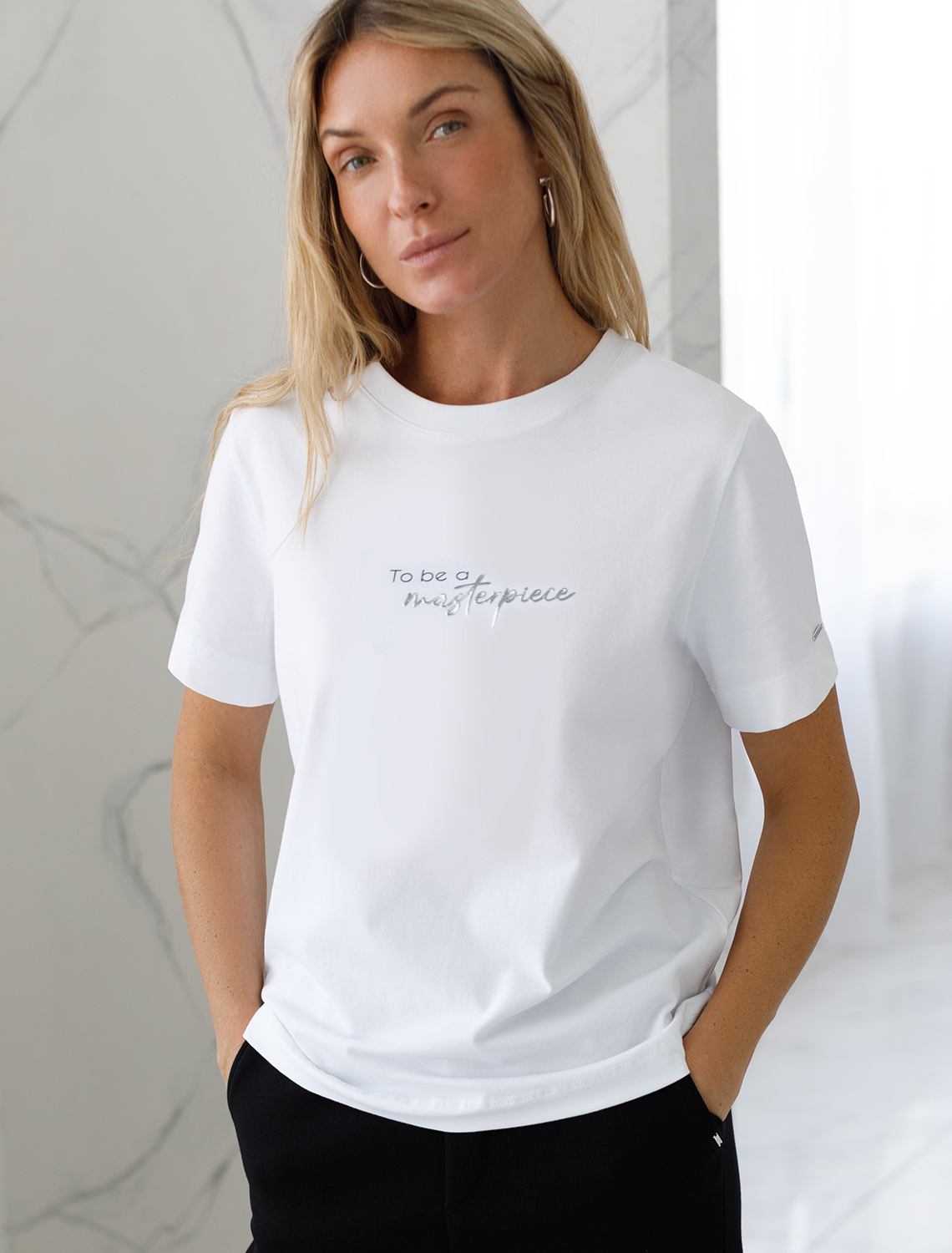 Футболка выполнена из премиального хлопка. Авторский принт нанесен фактурными красками с устойчивым покрытием. Наличие эластана в составе гарантирует комфорт и формоустойчивость. Изделие дополнено фирменным металлическим логотипом бренда. белый_masterpiece