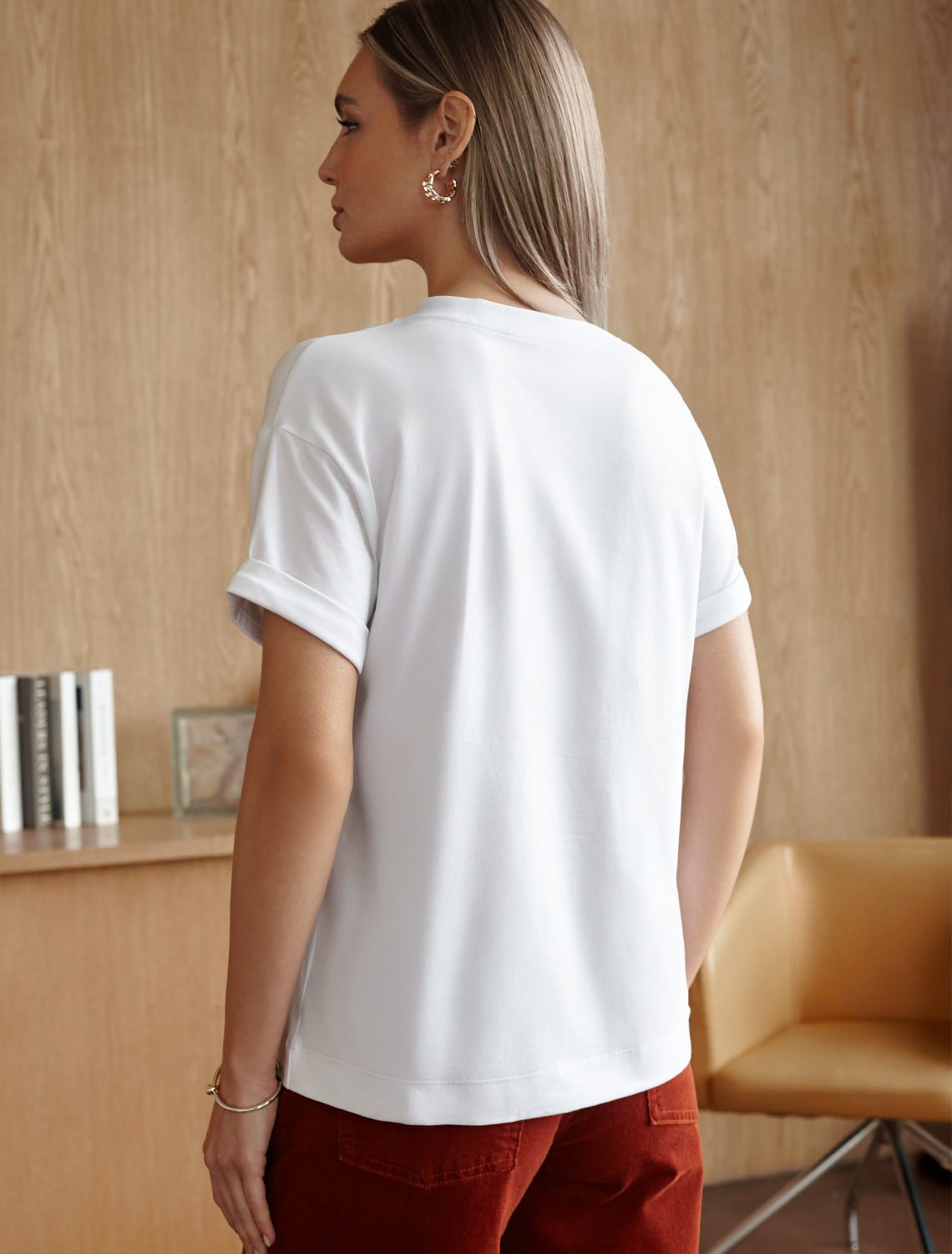 Футболка из премиального хлопка, высокое качество хлопковых волокон обеспечивает комфорт в любое время года. Горловина выполнена из рибаны в тон изделия, Рукава с подворотами и золотистым логотипом бренда. Авторский принт нанесен фактурными красками с устойчивым покрытием. За счет эластана в составе идеально держит форму и сохраняет внешний вид в течение долговременного использования. Универсальная вещь для ваших стилистических решений. белый_create