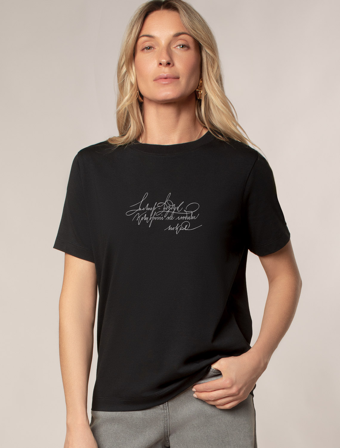 Футболка выполнена из премиального хлопка. Авторский принт нанесен фактурными красками с устойчивым покрытием. Наличие эластана в составе гарантирует комфорт и формоустойчивость. Изделие дополнено фирменным металлическим логотипом бренда.