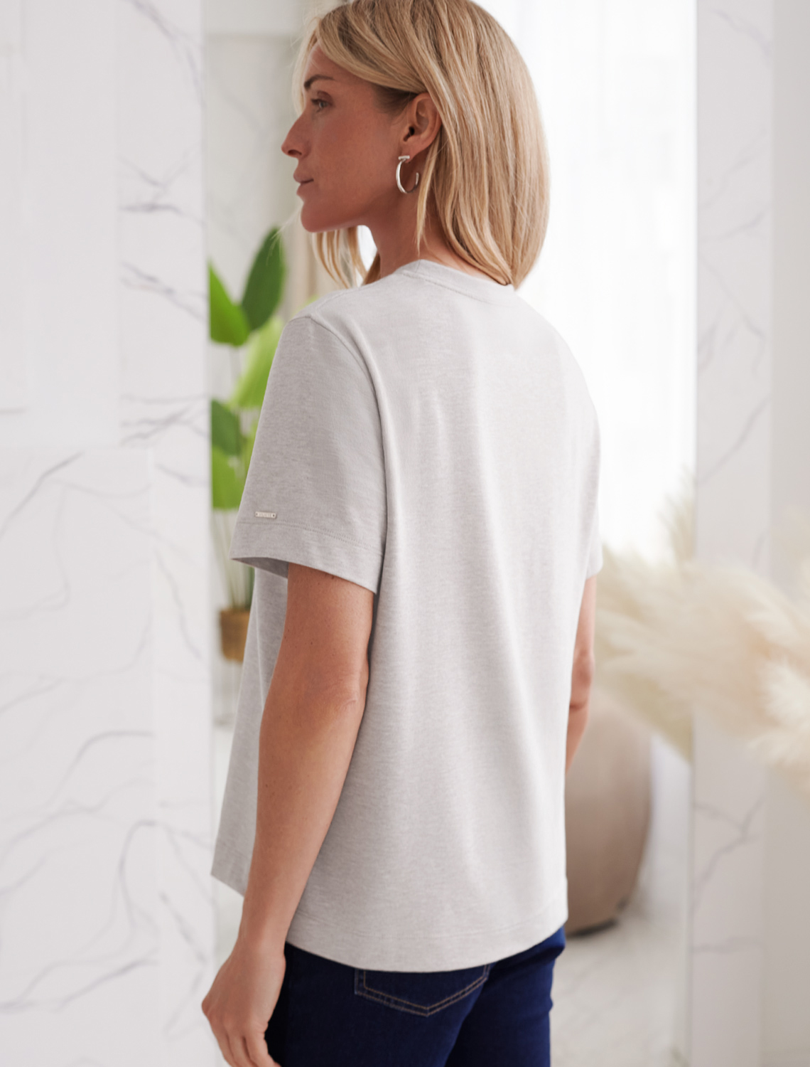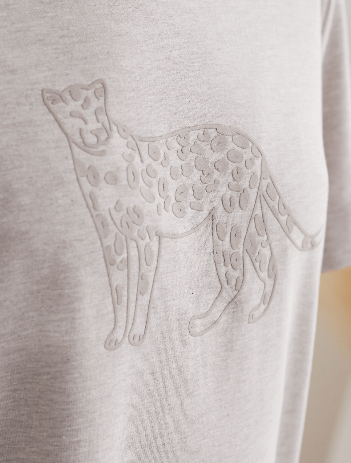 Футболка выполнена из премиального хлопка.Принт "леопард" нанесен фактурными красками с устойчивым покрытием. Наличие эластана в составе гарантирует комфорт и формоустойчивость. Изделие дополнено фирменным металлическим логотипом бренда. кофейный меланж_леопард