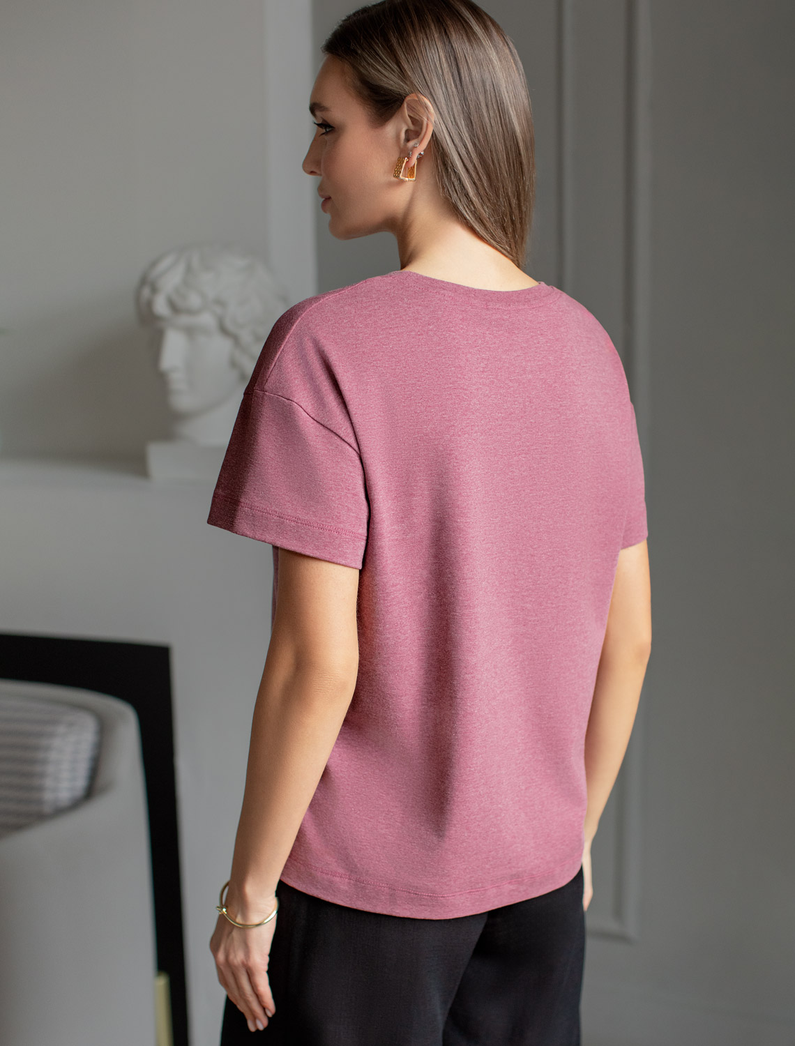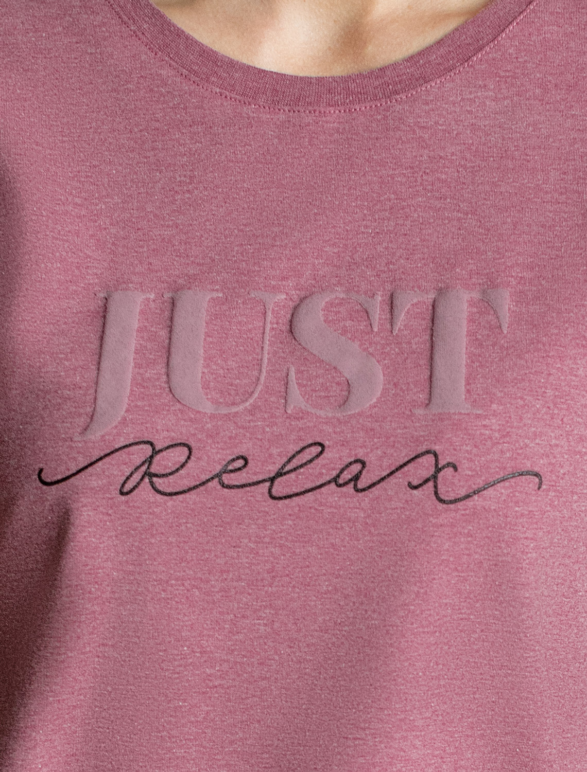 Футболка выполнена из премиального хлопка с авторским принтом. Just relax – «Просто расслабься» Свободная модель дополнена двумя вертикальными рельефами, заканчивающиеся разрезами. Мягкий эластичный хлопковый трикотаж гарантирует исключительный комфорт и уют дома. Идеально сочетается в костюме с брюками D44.131 темно-розовый меланж_just relax