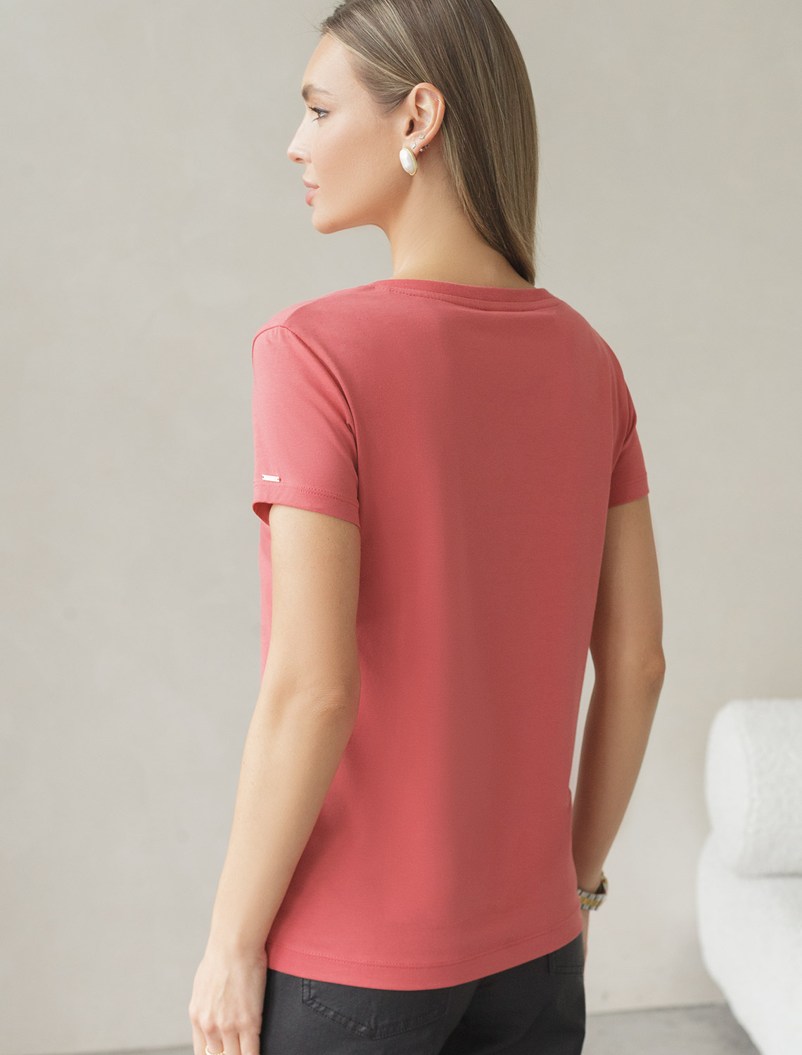 Однотонная футболка с V-образным вырезом выполнена из премиального хлопка. Добавление эластана в состав изделия способствует формоустойчивости. Самое высокое качество длинноволокнистых хлопковых волокон обеспечивает комфорт в любое время года.Универсальная базовая будет уместна не только в повседневном образе с денимом, но и в офисе с нестрогим дресс-кодом, в паре с брюками и жакетом. терракота