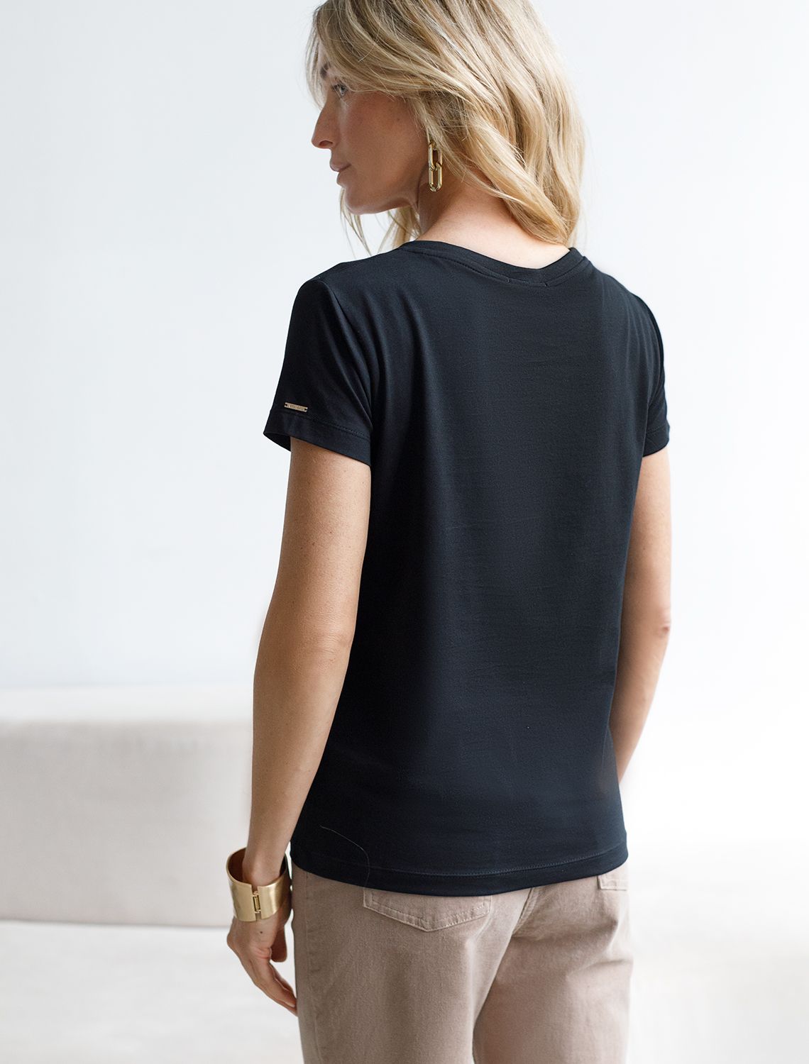 Однотонная футболка с V-образным вырезом выполнена из премиального хлопка. Добавление эластана в состав изделия способствует формоустойчивости. Самое высокое качество длинноволокнистых хлопковых волокон обеспечивает комфорт в любое время года.Универсальная базовая будет уместна не только в повседневном образе с денимом, но и в офисе с нестрогим дресс-кодом, в паре с брюками и жакетом.