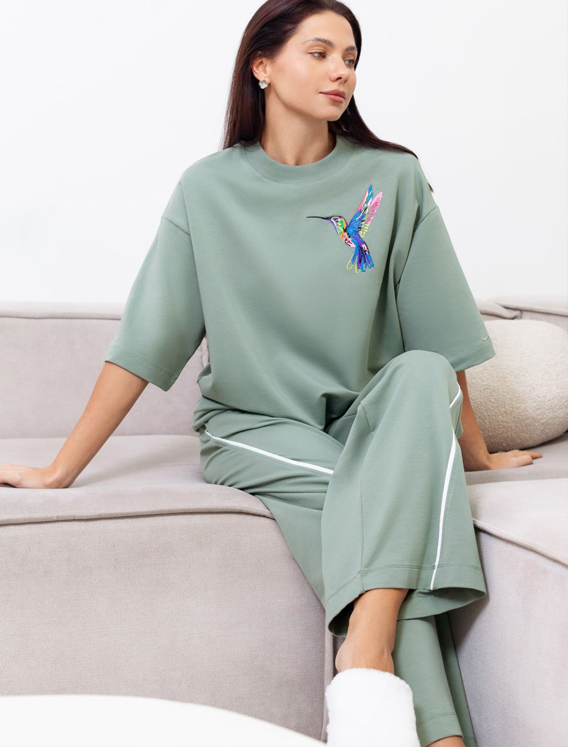 Футболка выполнена из эластичного футера двухнитки, дополнена акцентной вышивкой на груди. Модель свободного кроя, по низу изделия дополнена хлопковым шнуром с металлической фурнитурой. Изделие сочетается в костюме с шортами D48.010, брюками D44.135 и D44.137