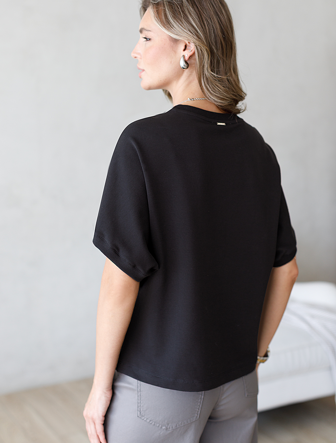 Футболка с рукавами регланами выполнена из эластичного футера двухнитки. Свободная модель со спущенной линией плеча легко поможет составить образы в расслабленном стиле. Сочетается в костюме с брюками D44.135, D44.136 и юбкой D46.034. Наличие эластана в составе изделия гарантирует абсолютный комфорт и формоустойчивость. черный
