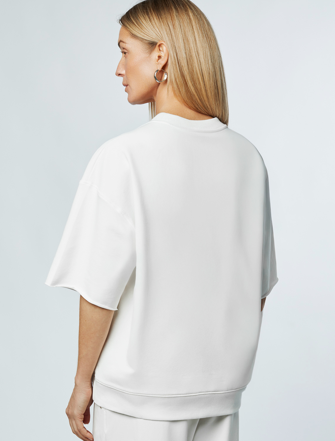 Футболка свободного кроя со спущенным плечом выполнена из футера двухнитки с эластаном. Лаконичный принт нанесен фактурной краской. Эластичный материал гарантирует комфорт и формоустойчивость. Сочетается в костюме с брюками D44.138, D44.139 и шортами D48.008. Изделие дополнено металлическим логотипом бренда. молочный