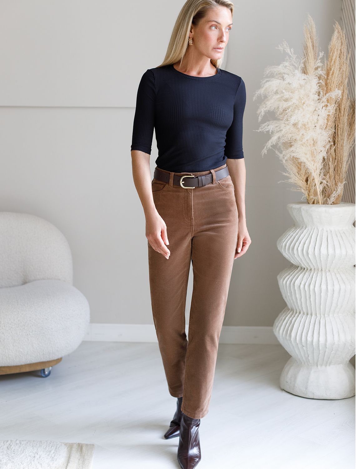 Футболка выполнена из фактурного трикотажа в широкий рубчик. Модель идеально сидит по фигуре не сковывая движения. Хлопковый трикотаж поддерживает оптимальную температуру тела, поэтому в изделии будет комфортно в течении всего дня. Наличие эластана в составе гарантирует формоустойчивости. Базовая модель впишется в любой гардероб.