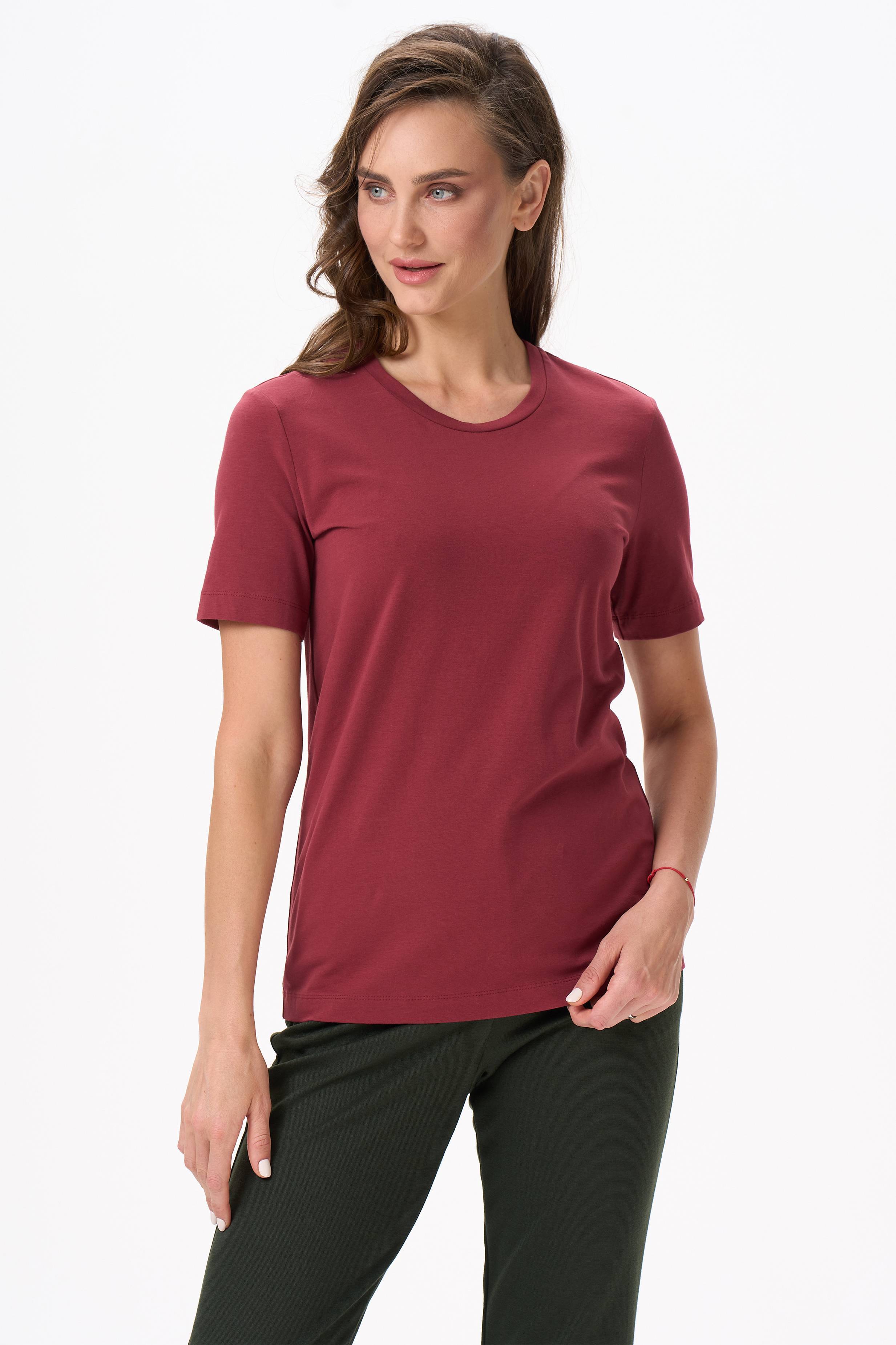 Футболка с втачным коротким рукавом выполнена из хлопкового полотна с эластаном качества пенье. Круглый вырез горловины. Рост модели на фото 177