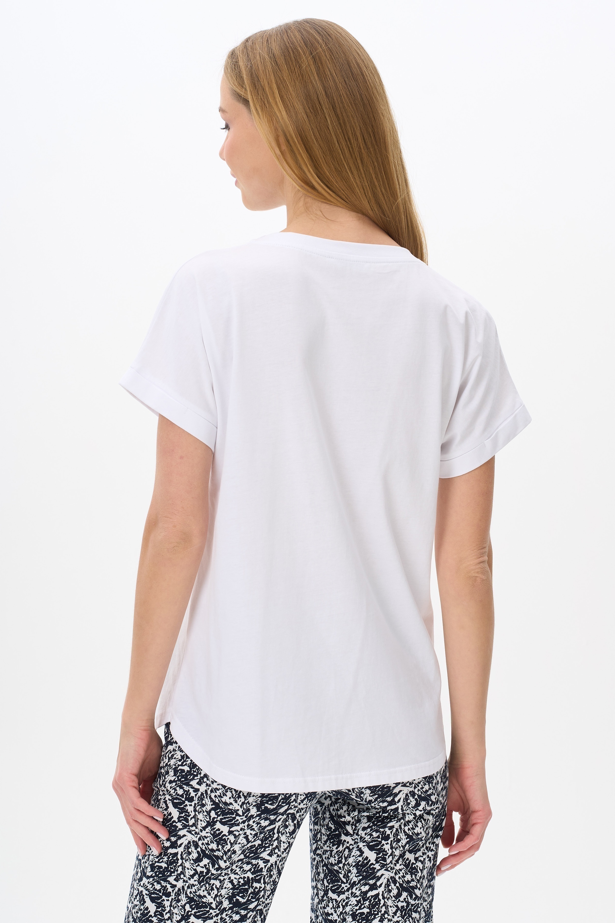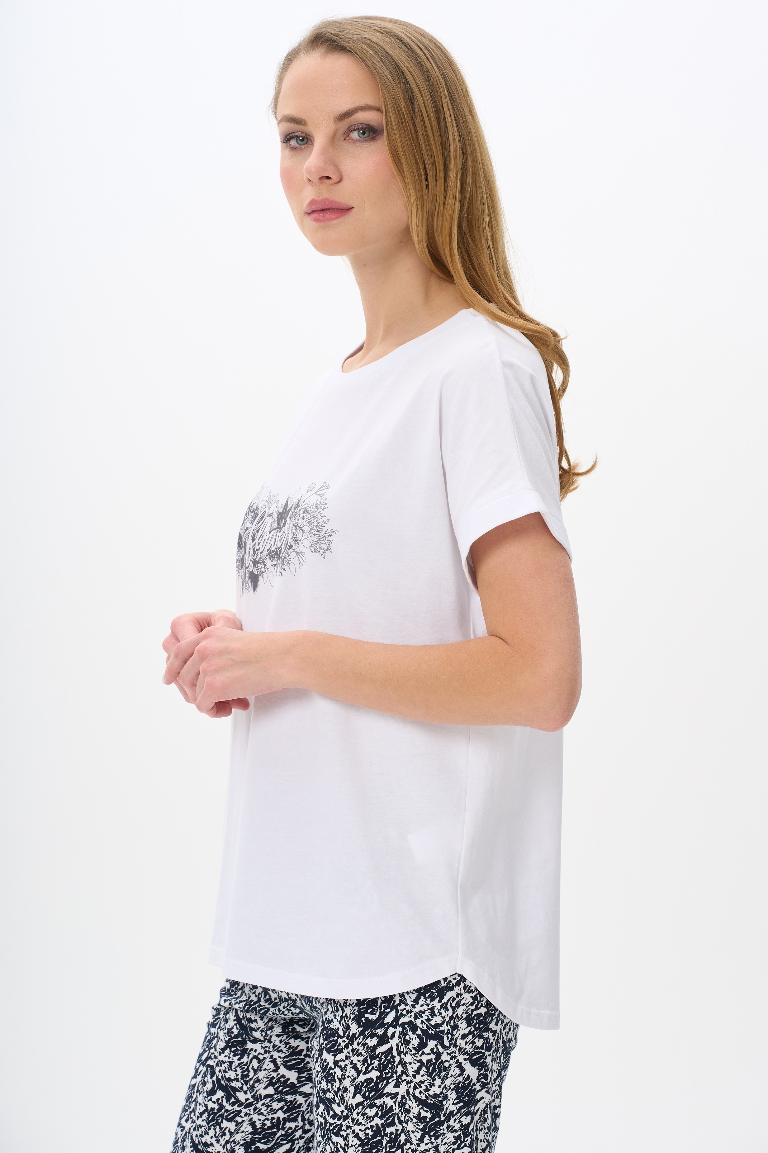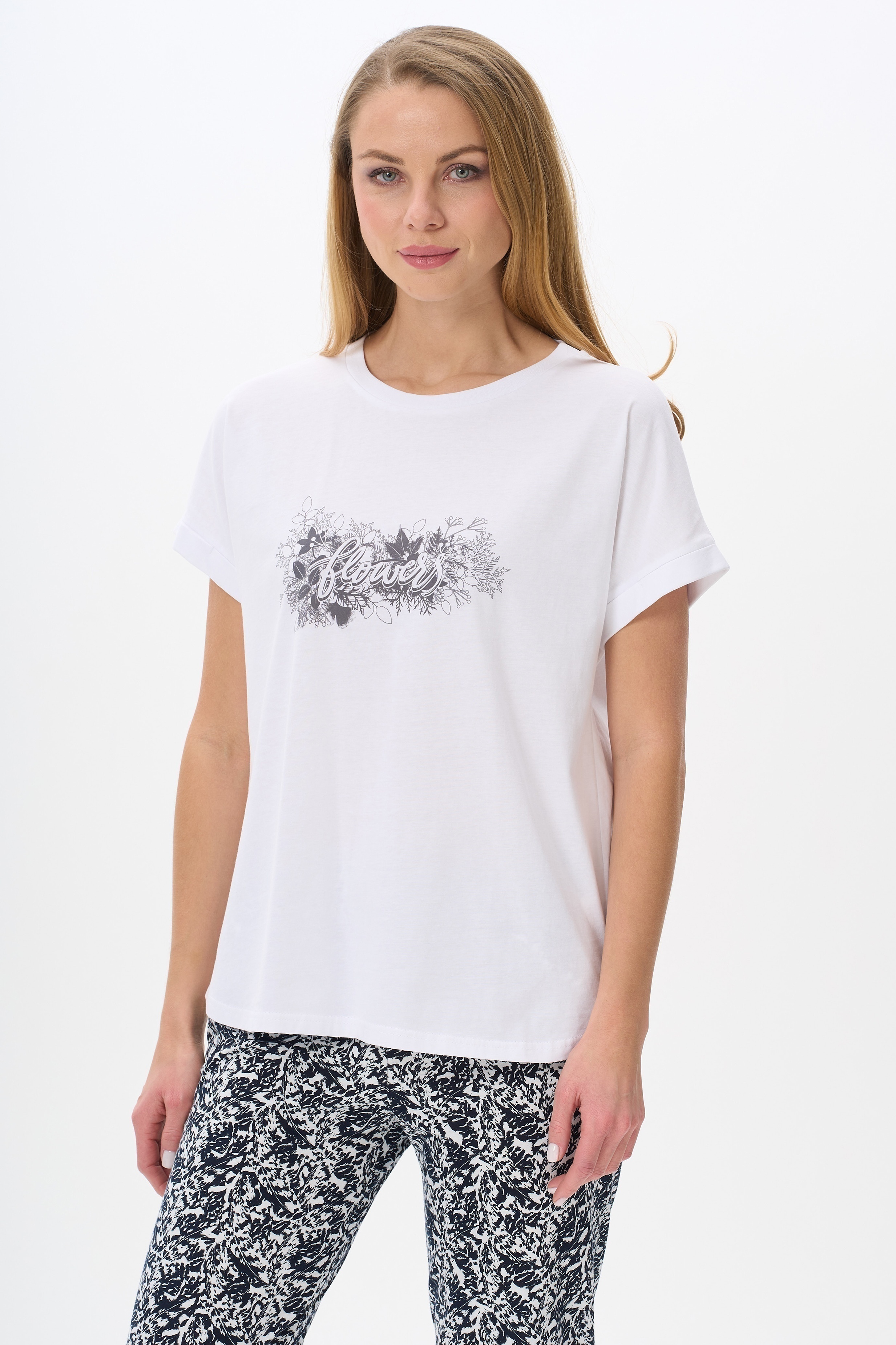 Футболка с принтом, выполнена из хлопкового полотна. Круглый вырез горловины, цельнокроеные короткие рукава с отворотами, фигурная линия низа. Рост модели на фото 177.