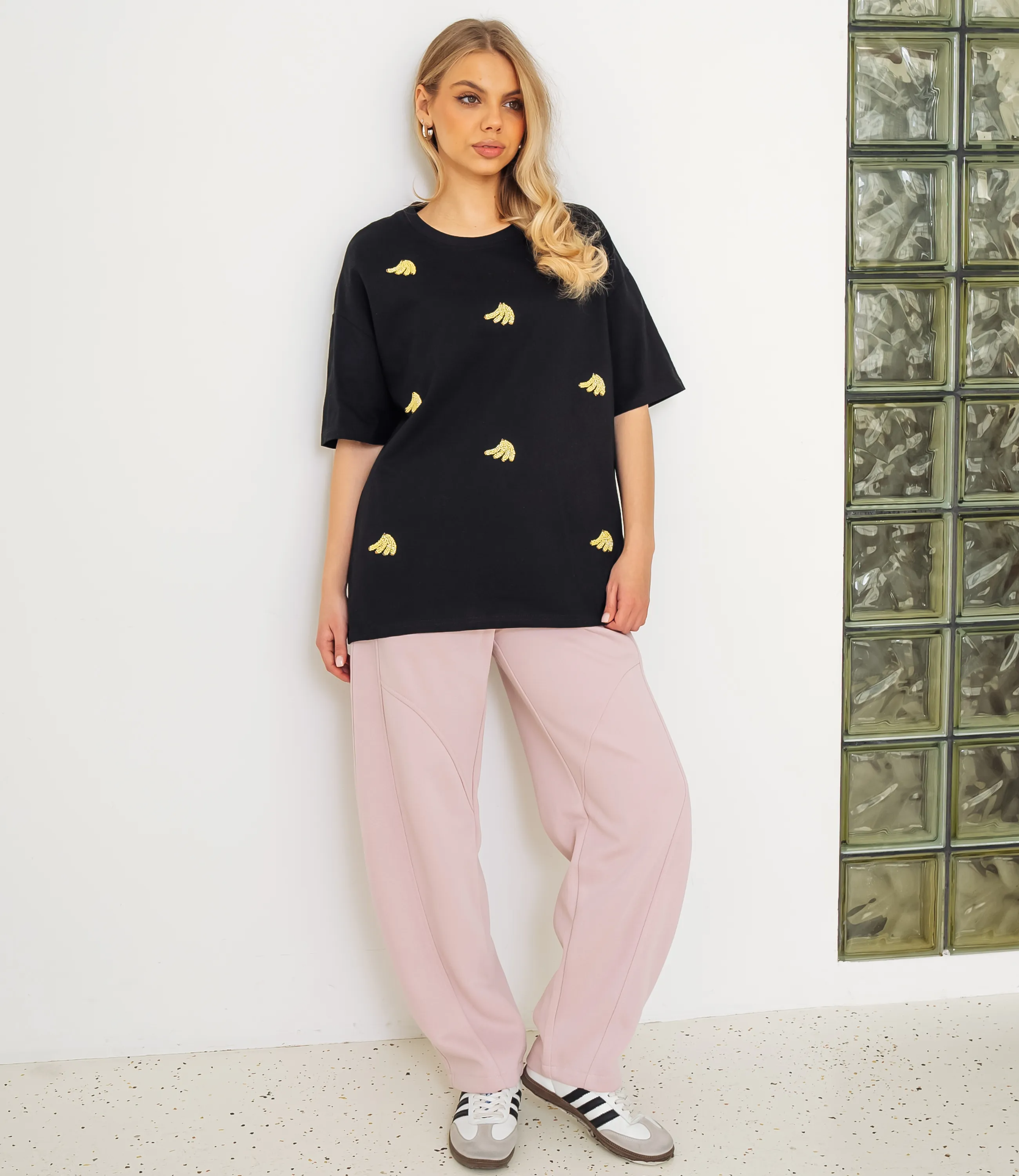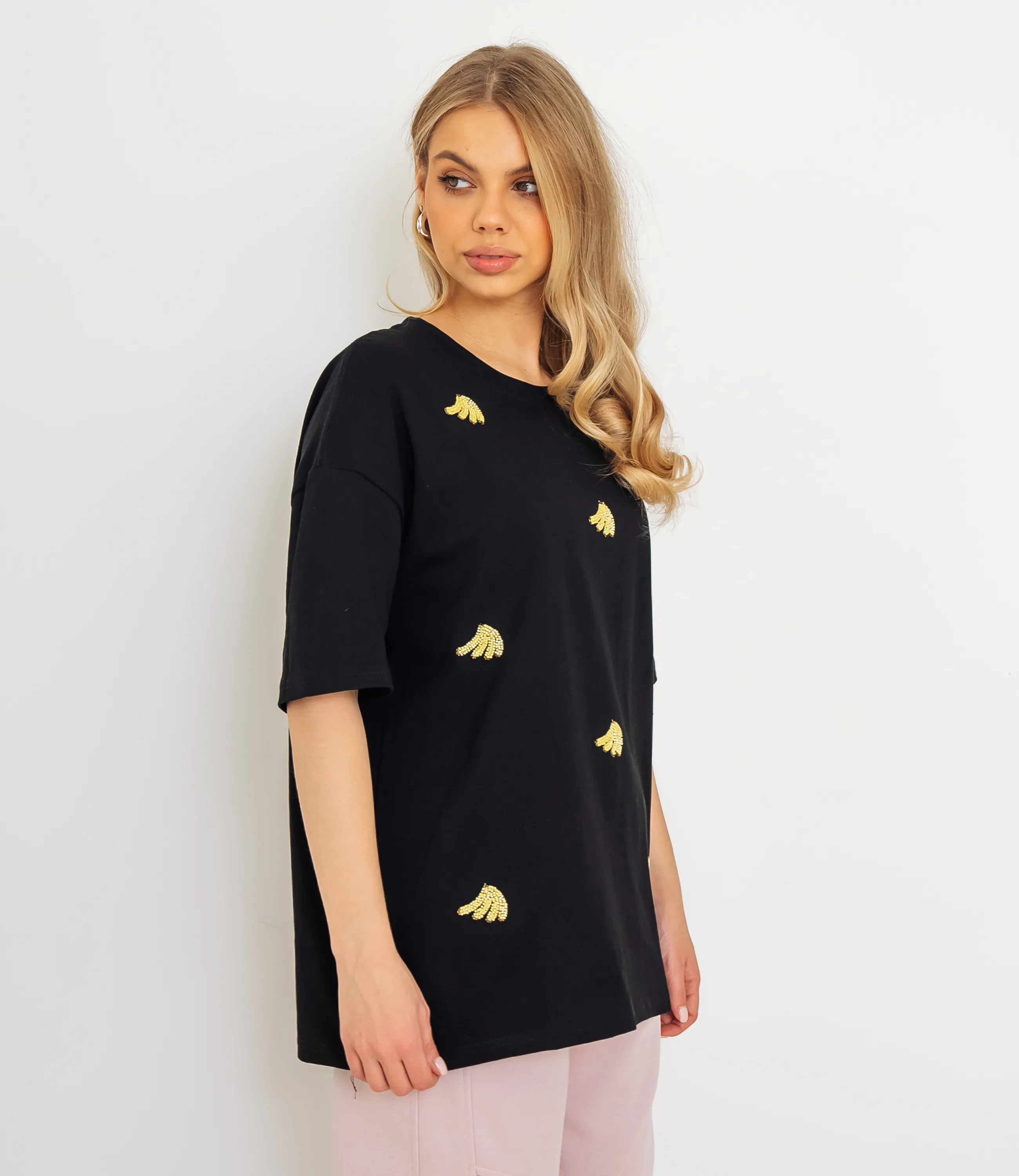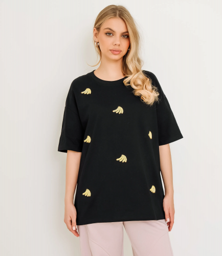 Эта футболка — прекрасный выбор для вашего магазина, предлагая стильный и универсальный дизайн, который станет отличным дополнением к гардеробу ваших клиентов. Футболка свободного прямого кроя из мягкого трикотажа с круглым вырезом, удлинённой спинкой, опущенной линией плеча и короткими рукавами, аккуратно подшитыми двойной строчкой, без застёжек, с мелким повторяющимся высшитым бисером рисунком в виде мини-бананов. Выполненная из 95% хлопок и 5% спандекс, футболка обеспечивает отличное качество и приятные тактильные ощущения. Независимо от сезона, она станет любимым элементом в гардеробе ваших клиентов. На странице сайта доступна таблица размеров, что позволит вашим покупателям легко найти подходящий вариант. Установленная цена делает эту футболку доступной для широкой аудитории, что обеспечит вам высокий уровень продаж.