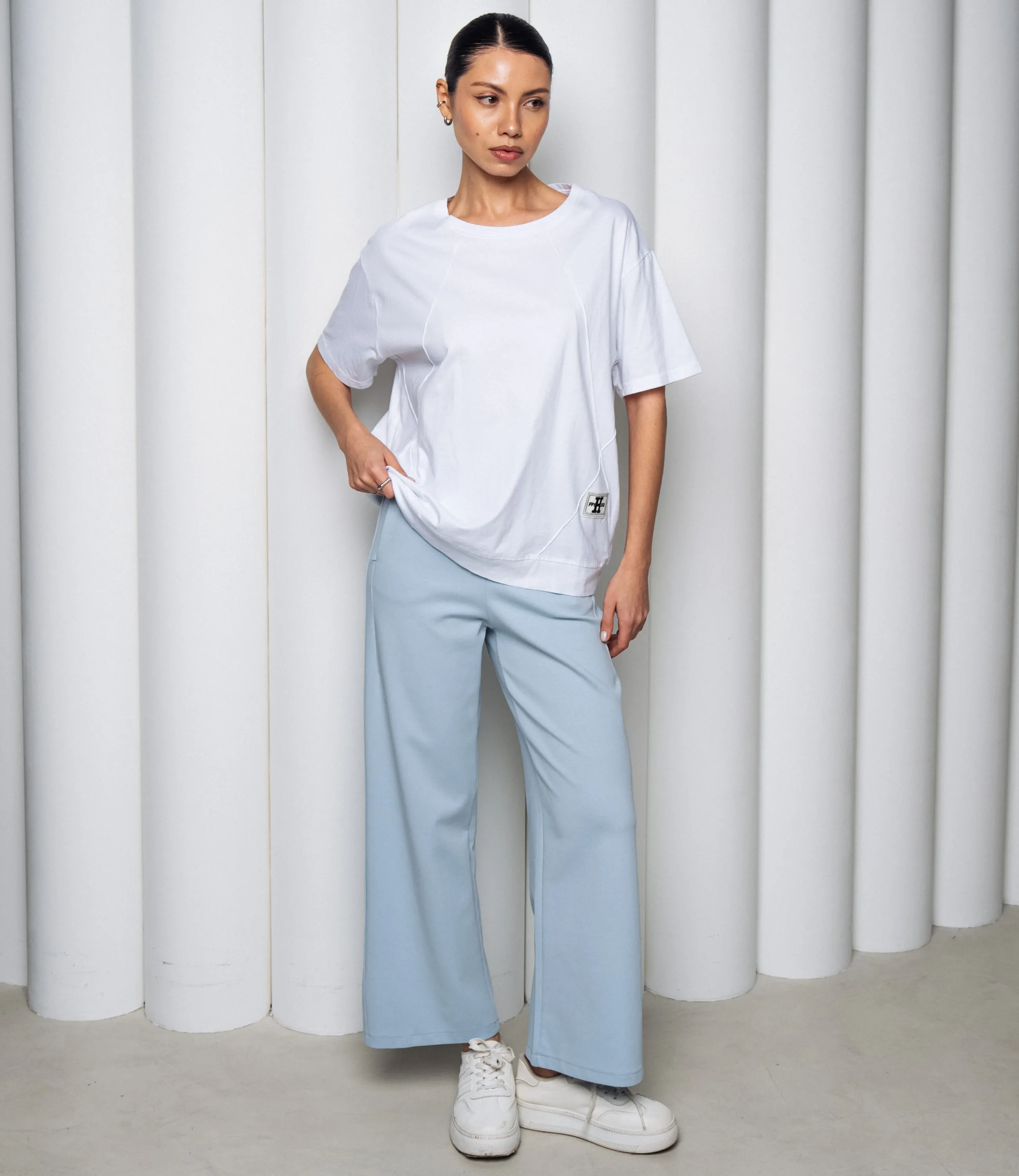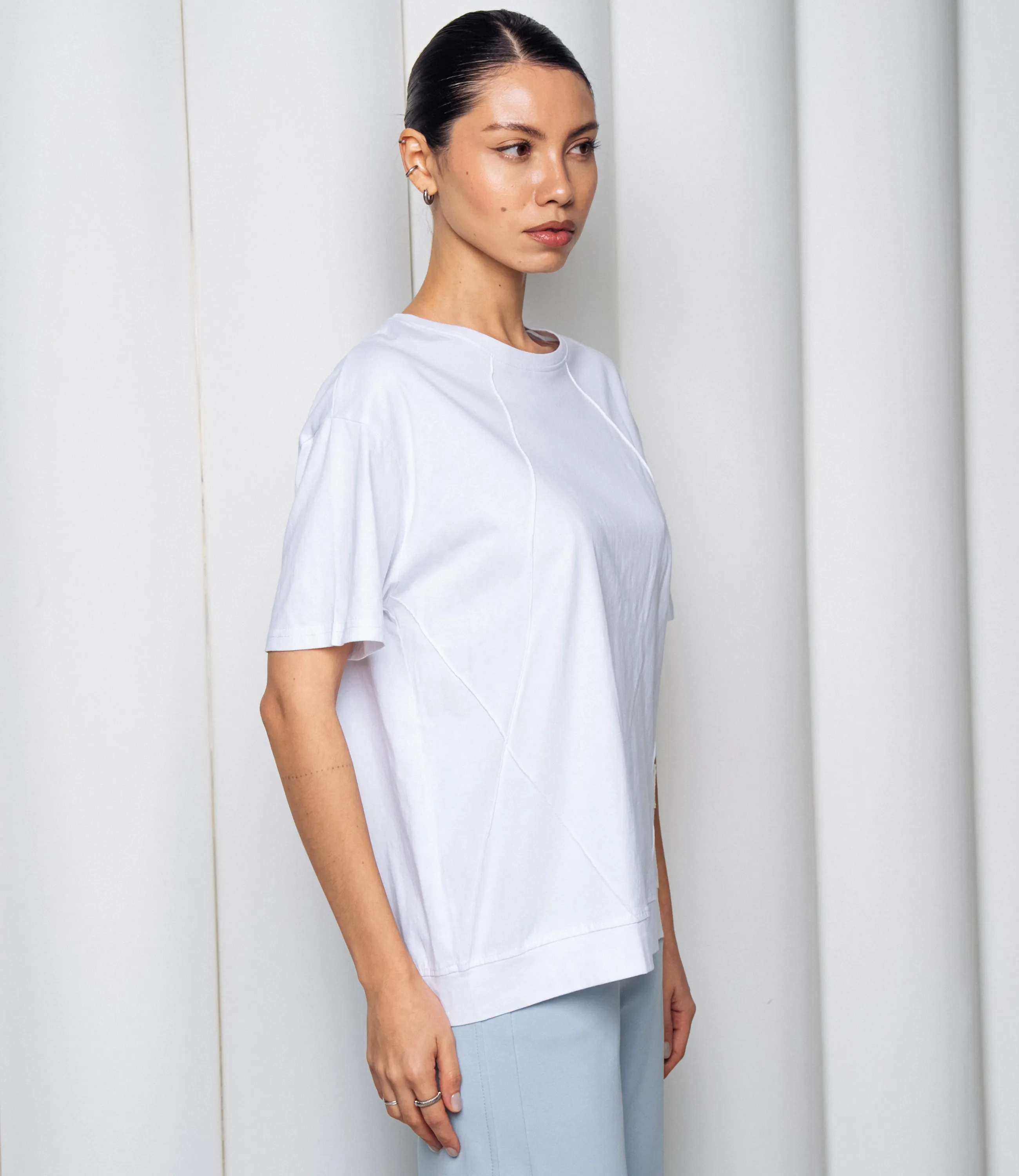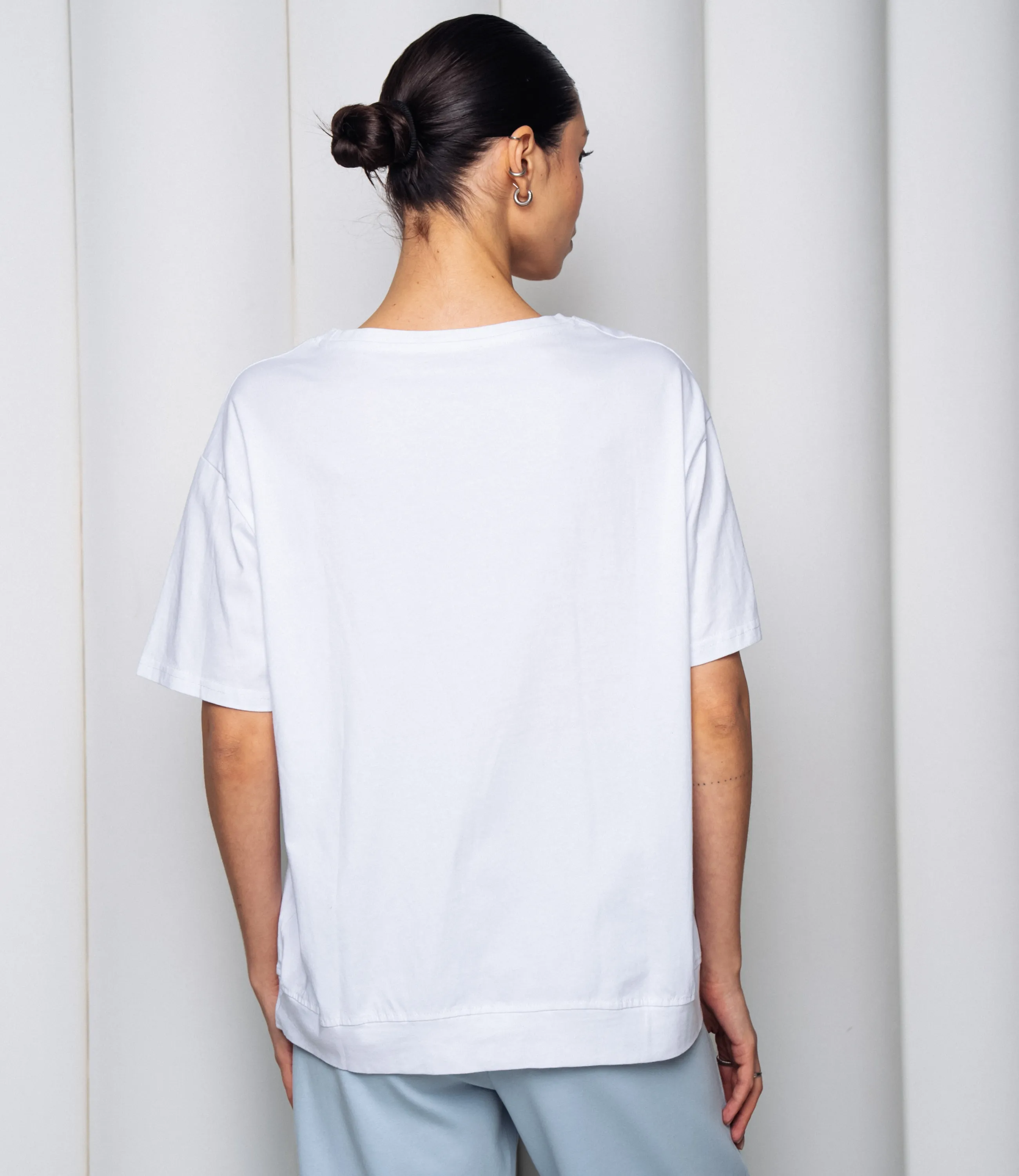 Эта футболка — прекрасный выбор для вашего магазина, предлагая стильный и универсальный дизайн, который станет отличным дополнением к гардеробу ваших клиентов.Футболка свободного кроя с круглым вырезом, короткими рукавами средней длины до середины плеча; плечевые швы слегка опущены, рукава с простым однородным подгибом; линия плеч и боков плавно спадающая, создаёт расслабленную посадку по всему торсу; длина до средней линии бёдер с прямым низом, по боковому шву небольшая нашивка-ярлык у подола спереди; ткань однотонная, плотная и плотной полотняной структуры, держит форму, с минимальным блеском и ровной текстурой; швы простые, без декоративной отделки, воротник обработан плоской планкой той же ткани; общая стилистика минималистичная, повседневная, универсальная. Выполненная из 80% хлопка, 20% полиэстера, футболка обеспечивает отличное качество и приятные тактильные ощущения. Независимо от сезона, она станет любимым элементом в гардеробе ваших клиентов. На странице сайта доступна таблица размеров, что позволит вашим покупателям легко найти подходящий вариант. Установленная цена делает эту футболку доступной для широкой аудитории, что обеспечит вам высокий уровень продаж. Рост модели: 164, параметры: 83-61-89.