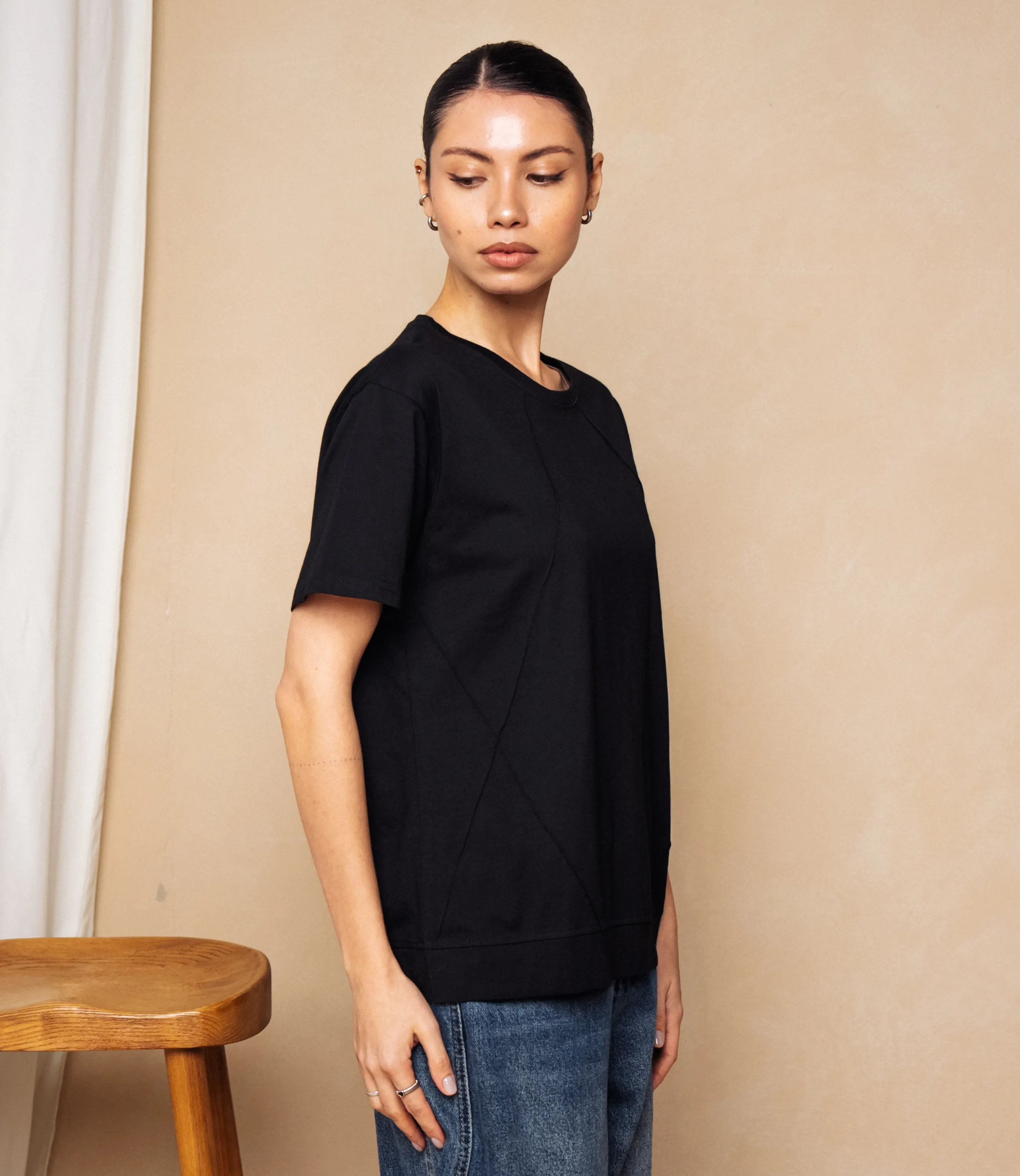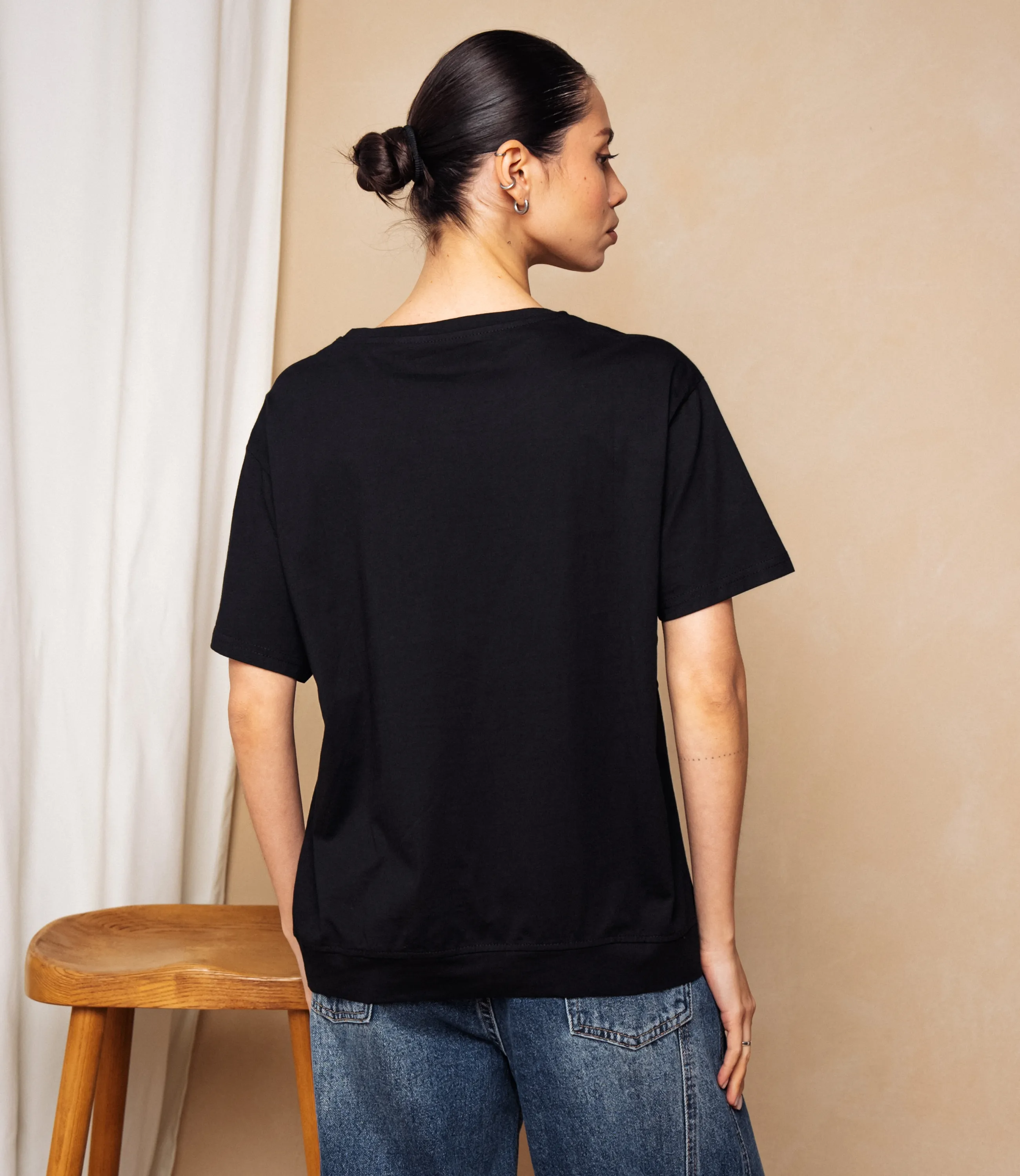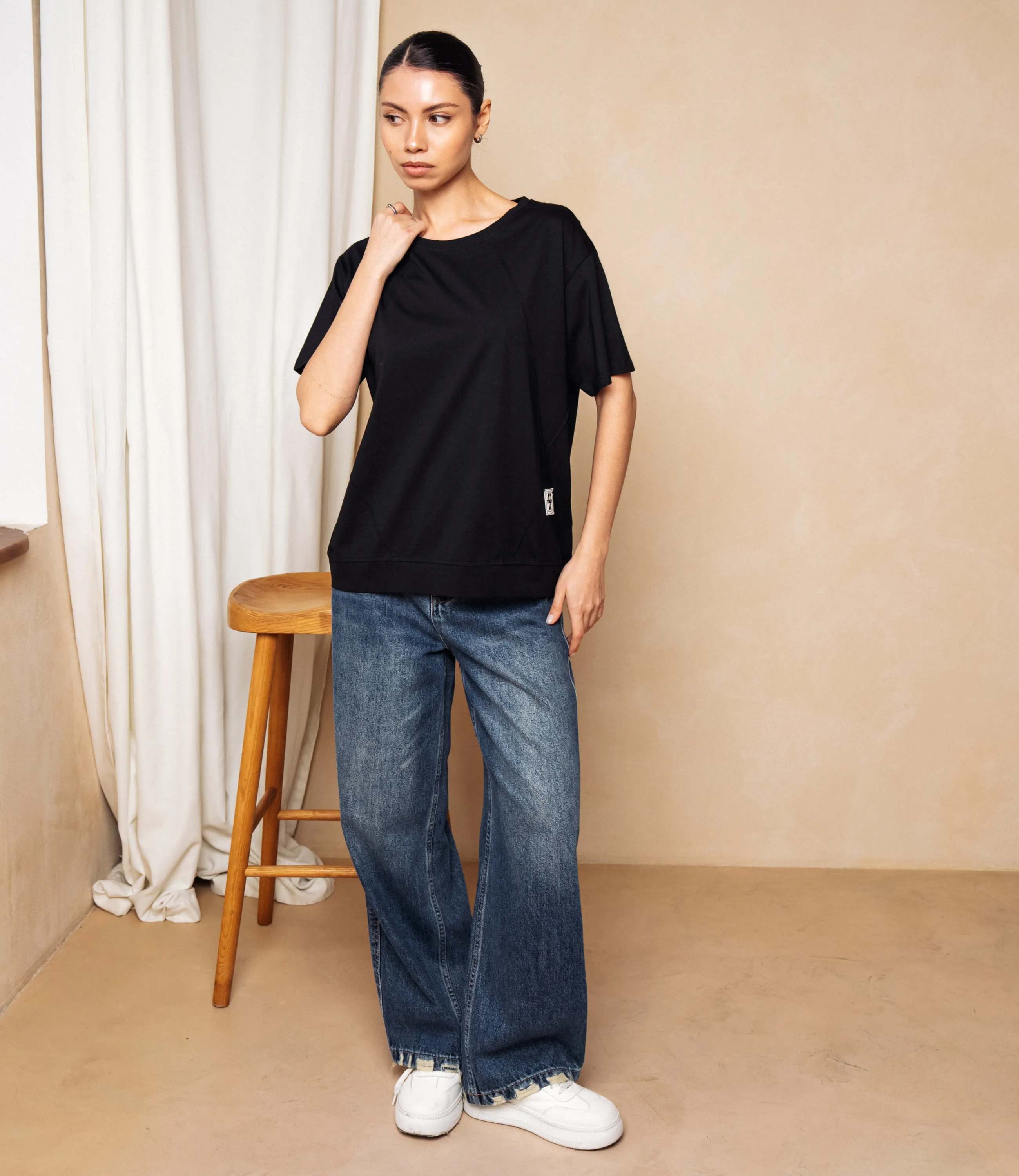 Эта футболка — прекрасный выбор для вашего магазина, предлагая стильный и универсальный дизайн, который станет отличным дополнением к гардеробу ваших клиентов.Футболка свободного кроя с круглым вырезом, короткими рукавами средней длины до середины плеча; плечевые швы слегка опущены, рукава с простым однородным подгибом; линия плеч и боков плавно спадающая, создаёт расслабленную посадку по всему торсу; длина до средней линии бёдер с прямым низом, по боковому шву небольшая нашивка-ярлык у подола спереди; ткань однотонная, плотная и плотной полотняной структуры, держит форму, с минимальным блеском и ровной текстурой; швы простые, без декоративной отделки, воротник обработан плоской планкой той же ткани; общая стилистика минималистичная, повседневная, универсальная. Выполненная из 80% хлопка, 20% полиэстера, футболка обеспечивает отличное качество и приятные тактильные ощущения. Независимо от сезона, она станет любимым элементом в гардеробе ваших клиентов. На странице сайта доступна таблица размеров, что позволит вашим покупателям легко найти подходящий вариант. Установленная цена делает эту футболку доступной для широкой аудитории, что обеспечит вам высокий уровень продаж. Рост модели: 164, параметры: 83-61-89.