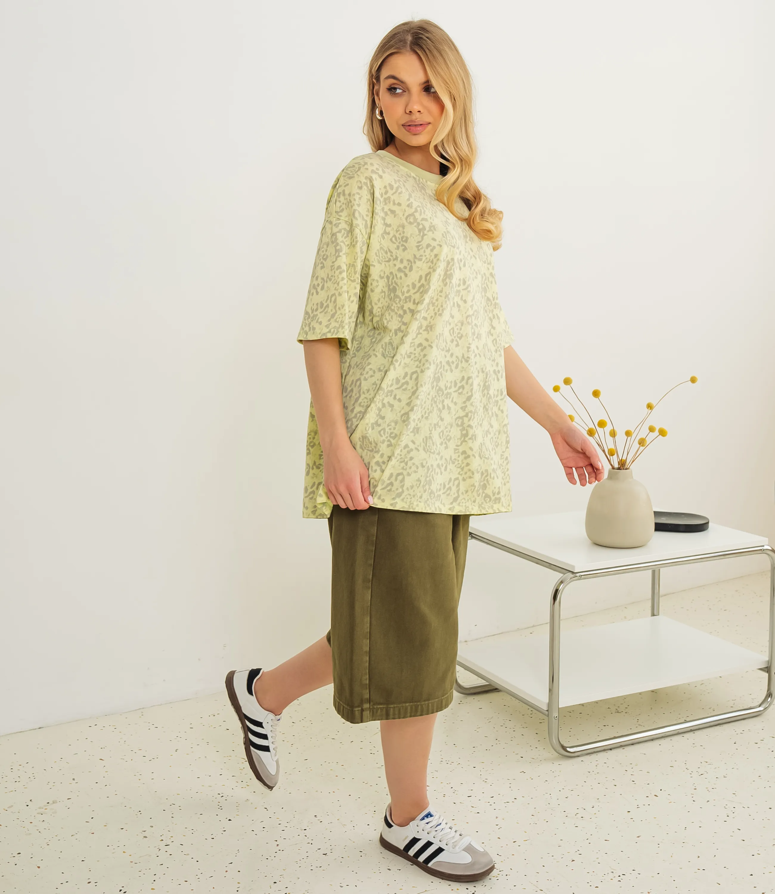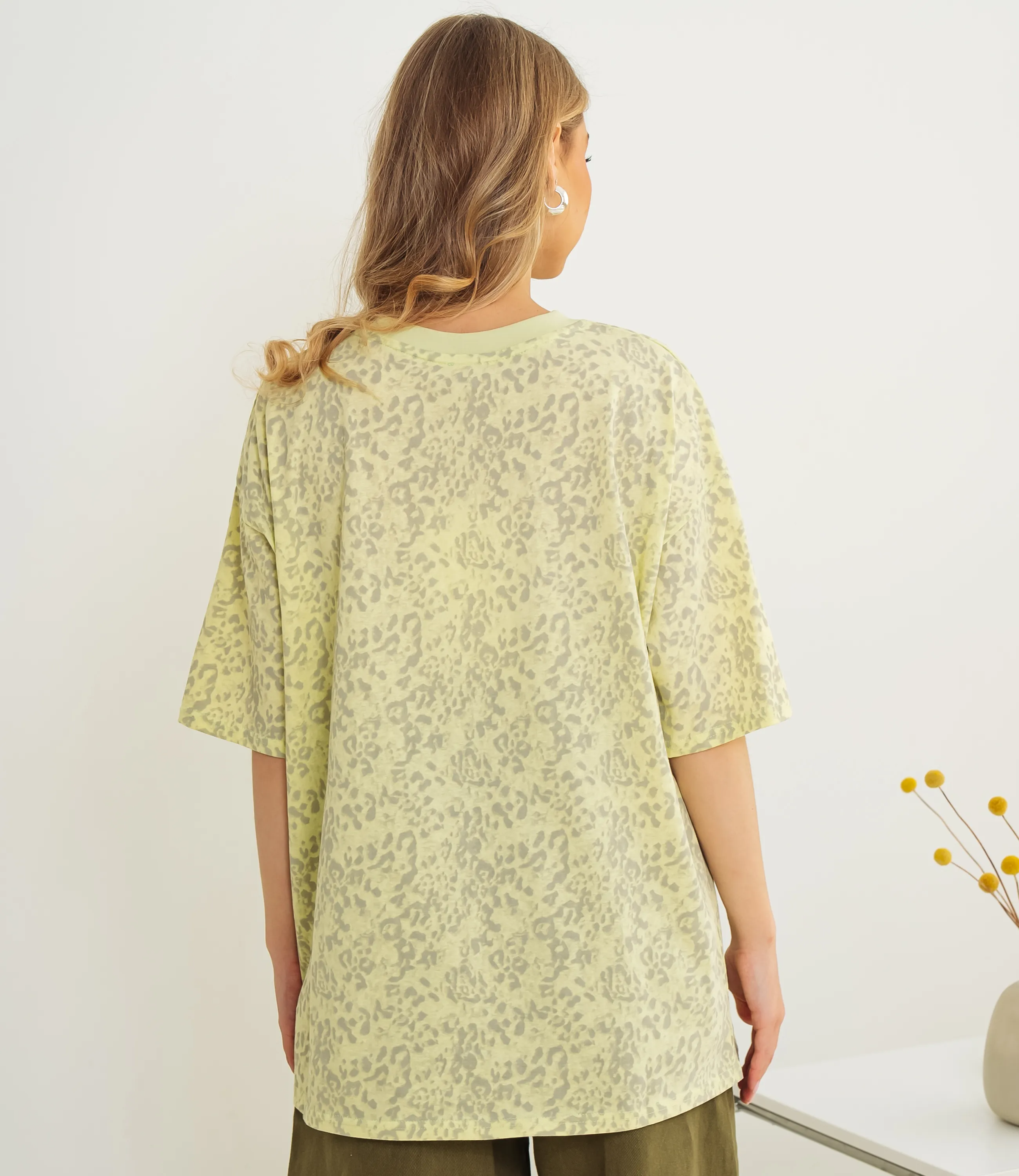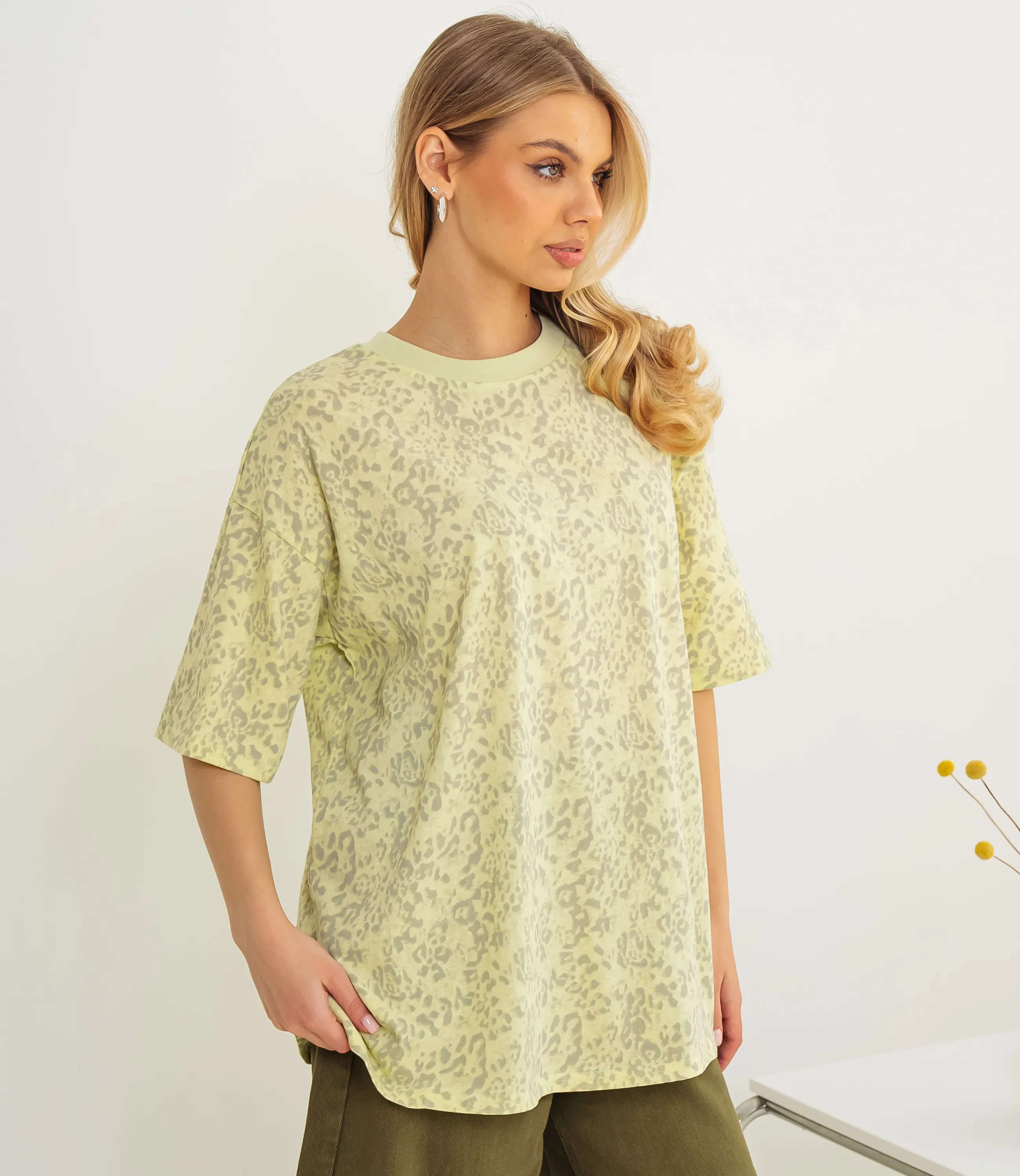 Эта футболка — прекрасный выбор для вашего магазина, предлагая стильный и универсальный дизайн, который станет отличным дополнением к гардеробу ваших клиентов. Свободная удлинённая футболка с опущенной линией плеча и прямым силуэтом из мягкого трикотажа средней плотности. Круглый вырез, короткие рукава, длина до бёдер, двойная подгибка, без застёжек. Поверхность с мелким размытым абстрактно-животным принтом. Комфортная, подходит для повседневных и многослойных образов. Выполненная из 100% хлопок, футболка обеспечивает отличное качество и приятные тактильные ощущения. Независимо от сезона, она станет любимым элементом в гардеробе ваших клиентов. На странице сайта доступна таблица размеров, что позволит вашим покупателям легко найти подходящий вариант. Установленная цена делает эту футболку доступной для широкой аудитории, что обеспечит вам высокий уровень продаж.
