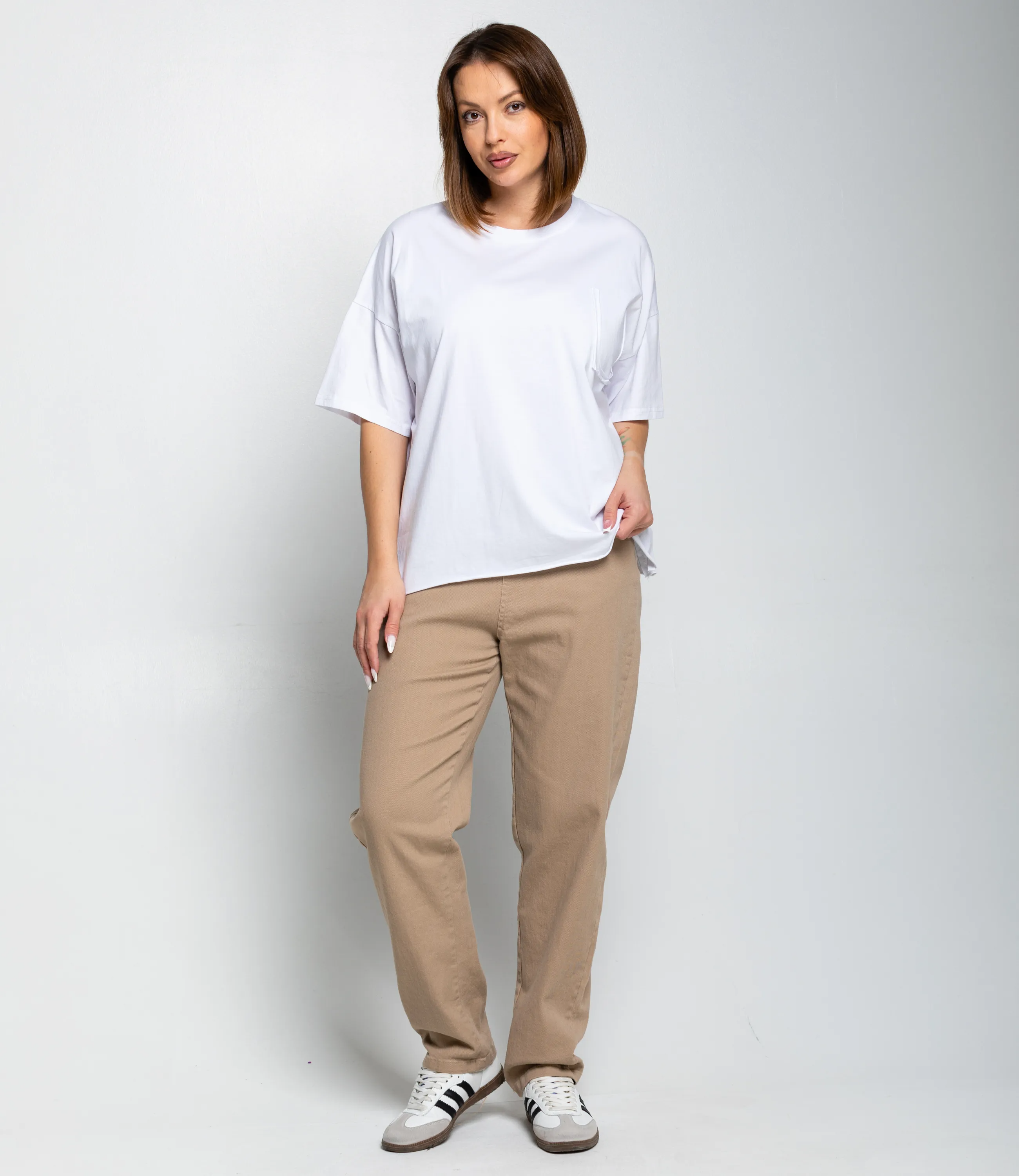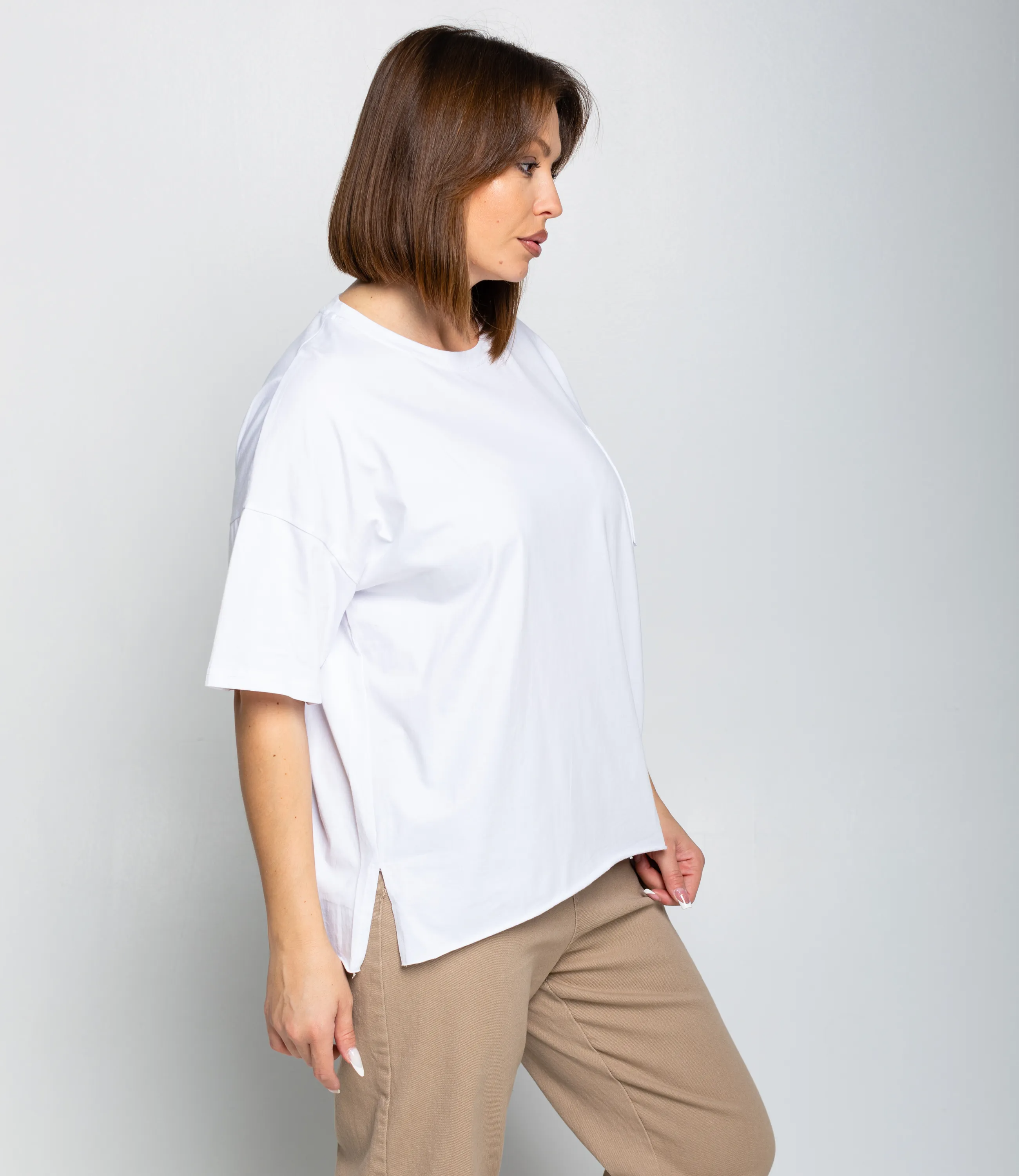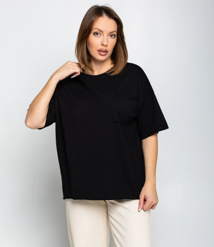 Эта футболка — прекрасный выбор для вашего магазина, предлагая стильный и универсальный дизайн, который станет отличным дополнением к гардеробу ваших клиентов. Футболка — свободный, прямой крой с короткими рукавами примерно до локтя, высокая круглая горловина с плотной окантовкой, плечевые швы слегка спущены для расслабленного силуэта, длина чуть ниже талии с прямым подолом, на груди небольшая накладная кармашка с аккуратным швом, швы ровные и незаметные, материал мягкий и гладкий без выраженной текстуры, плотность средняя — достаточно плотная, чтобы не просвечивать, но с лёгкой драпировкой, рукава со свободным объёмом, внутренняя обработка горловины аккуратная. Выполненная из ткани с 80% хлопка, 20% полиэстер, футболка обеспечивает отличное качество и приятные тактильные ощущения. Независимо от сезона, она станет любимым элементом в гардеробе ваших клиентов. На странице сайта доступна таблица размеров, что позволит вашим покупателям легко найти подходящий вариант. Установленная цена делает эту футболку доступной для широкой аудитории, что обеспечит вам высокий уровень продаж.