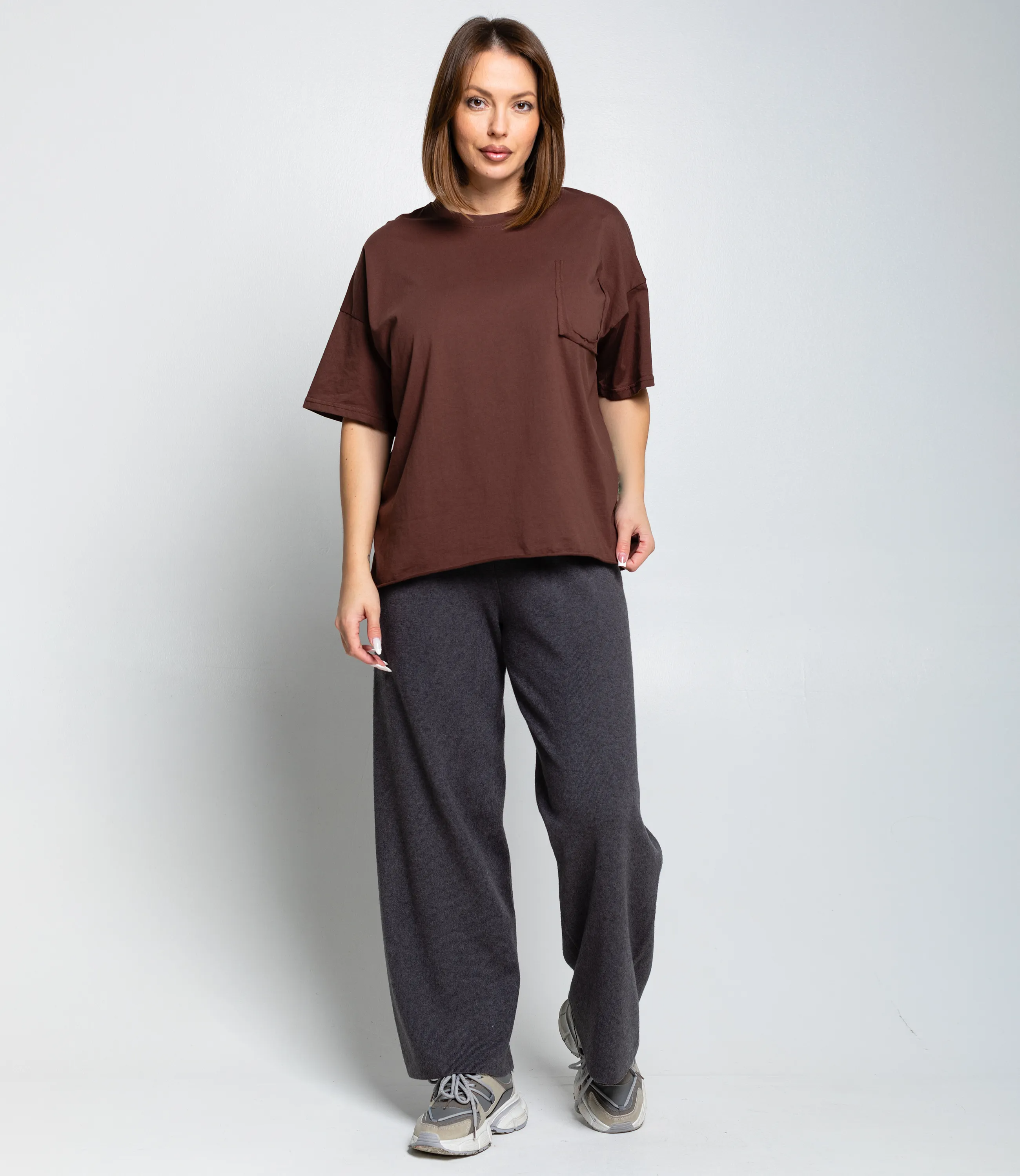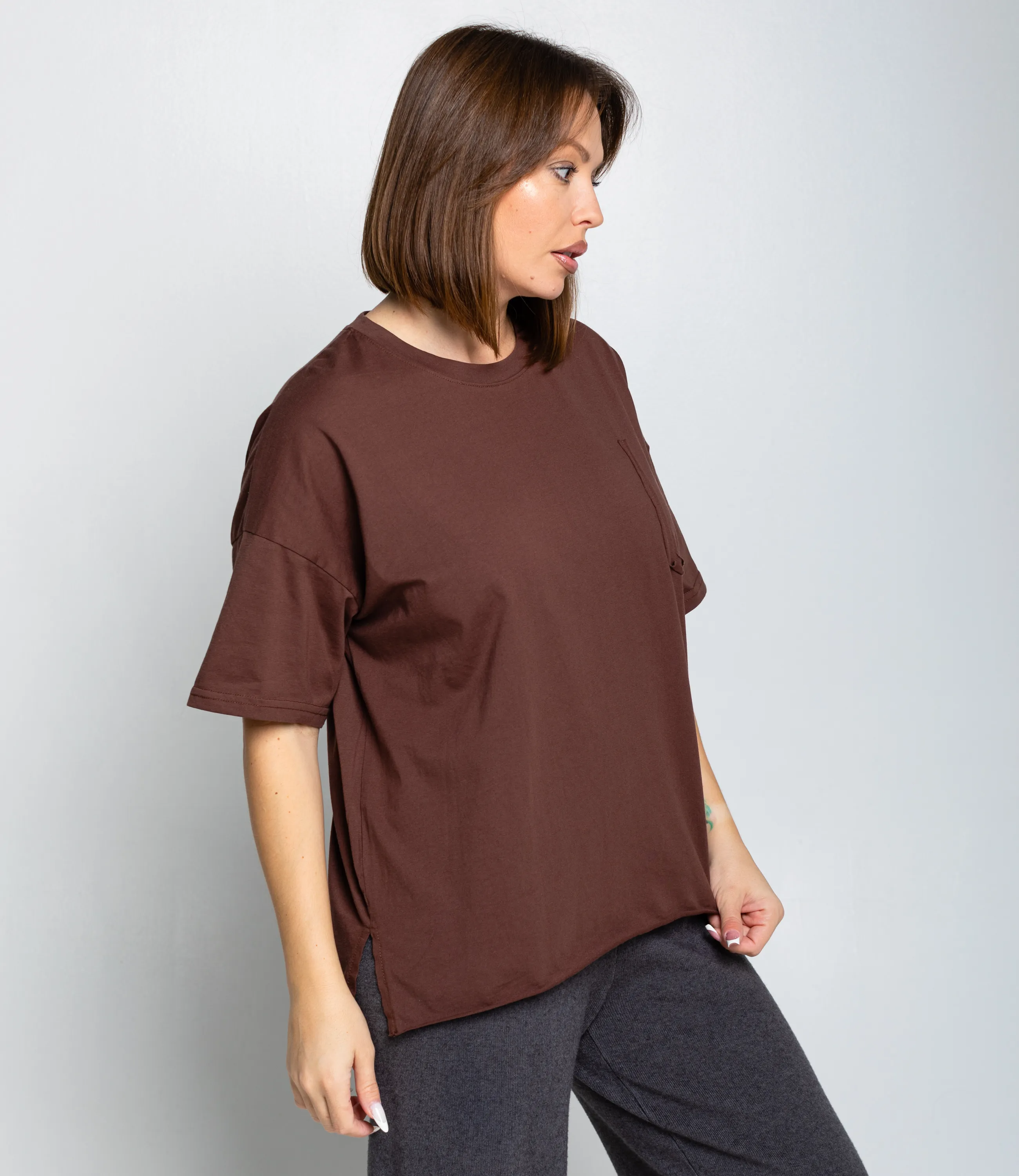 Эта футболка — прекрасный выбор для вашего магазина, предлагая стильный и универсальный дизайн, который станет отличным дополнением к гардеробу ваших клиентов. Футболка — свободный, прямой крой с короткими рукавами примерно до локтя, высокая круглая горловина с плотной окантовкой, плечевые швы слегка спущены для расслабленного силуэта, длина чуть ниже талии с прямым подолом, на груди небольшая накладная кармашка с аккуратным швом, швы ровные и незаметные, материал мягкий и гладкий без выраженной текстуры, плотность средняя — достаточно плотная, чтобы не просвечивать, но с лёгкой драпировкой, рукава со свободным объёмом, внутренняя обработка горловины аккуратная. Выполненная из ткани с 80% хлопка, 20% полиэстер, футболка обеспечивает отличное качество и приятные тактильные ощущения. Независимо от сезона, она станет любимым элементом в гардеробе ваших клиентов. На странице сайта доступна таблица размеров, что позволит вашим покупателям легко найти подходящий вариант. Установленная цена делает эту футболку доступной для широкой аудитории, что обеспечит вам высокий уровень продаж.