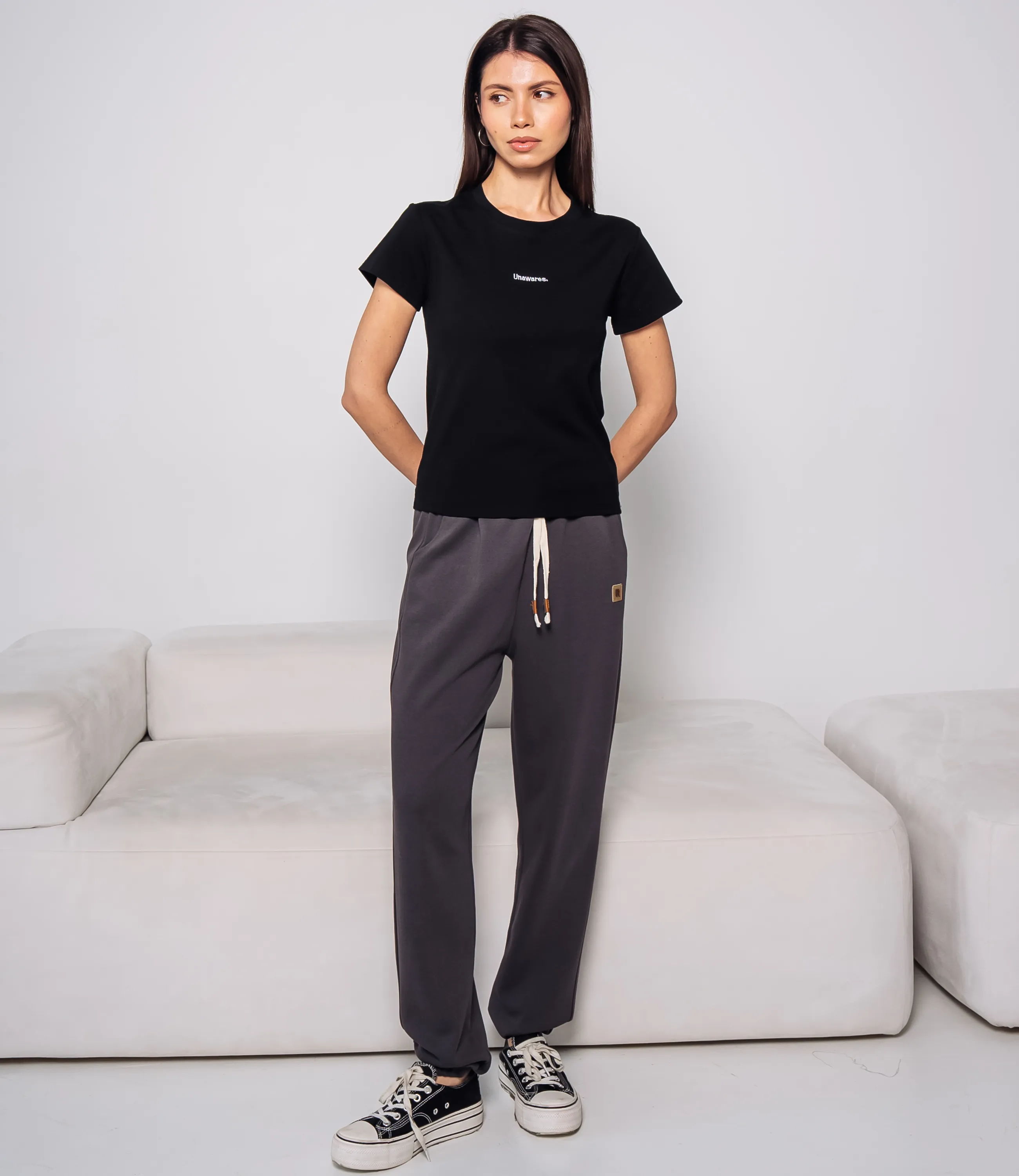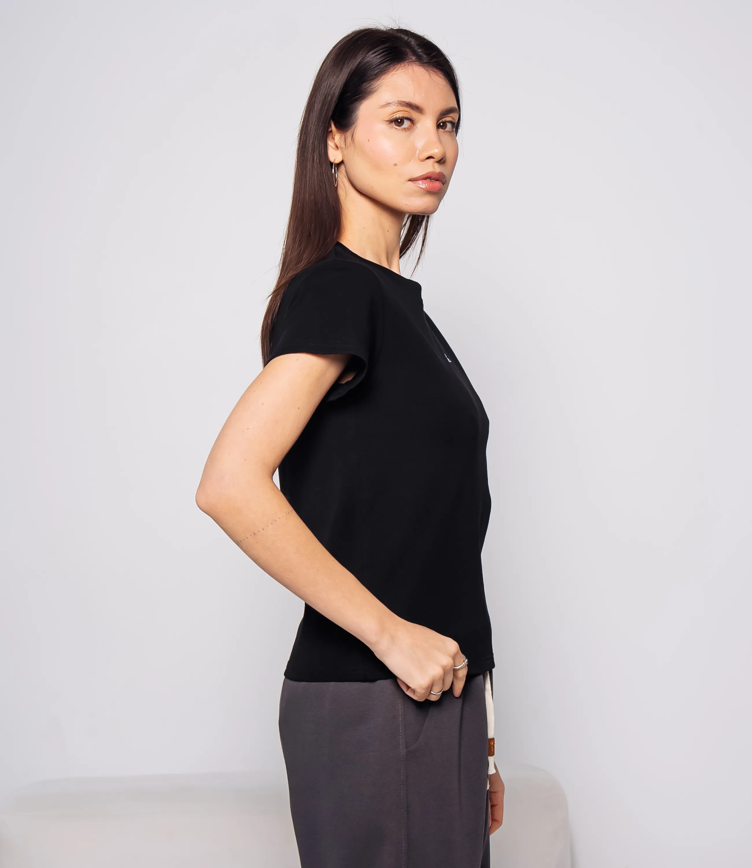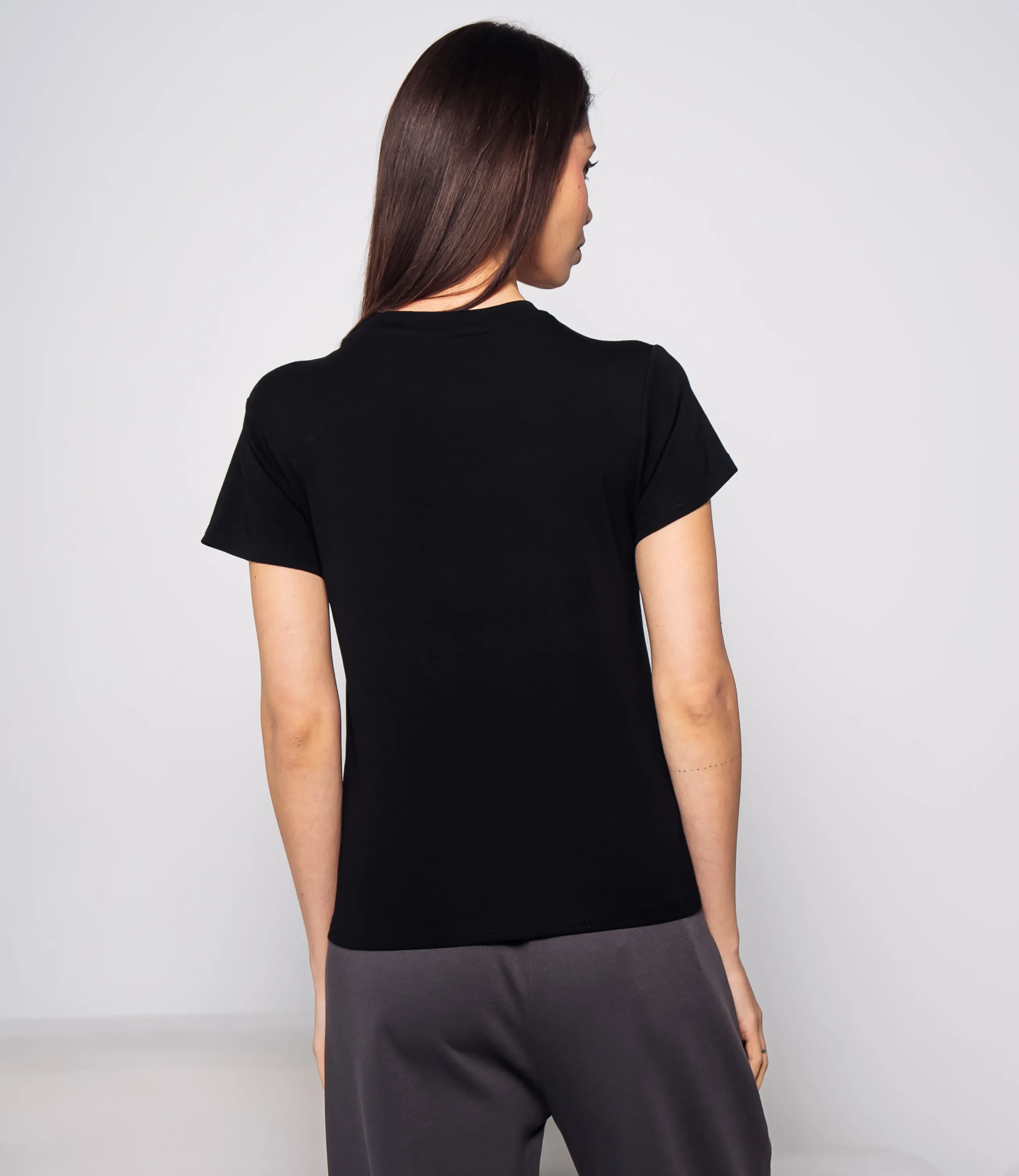 Эта футболка — прекрасный выбор для вашего магазина, предлагая стильный и универсальный дизайн, который станет отличным дополнением к гардеробу ваших клиентов. Футболка приталенного классического кроя с круглым вырезом горловины и короткими рукавами до середины плеча. посадка облегающая по корпусу с естественным прилеганием, длина до линии бедер, низ прямой с простой подгибкой; на передней части в центре груди небольшая надпись в лаконичном шрифте, композиция минималистичная. Выполненная из ткани с 95% хлопка, 5% спандекса, футболка обеспечивает отличное качество и приятные тактильные ощущения. Независимо от сезона, она станет любимым элементом в гардеробе ваших клиентов. На странице сайта доступна таблица размеров, что позволит вашим покупателям легко найти подходящий вариант. Установленная цена делает эту футболку доступной для широкой аудитории, что обеспечит вам высокий уровень продаж. Рост модели: 164, параметры: 83-61-89.
