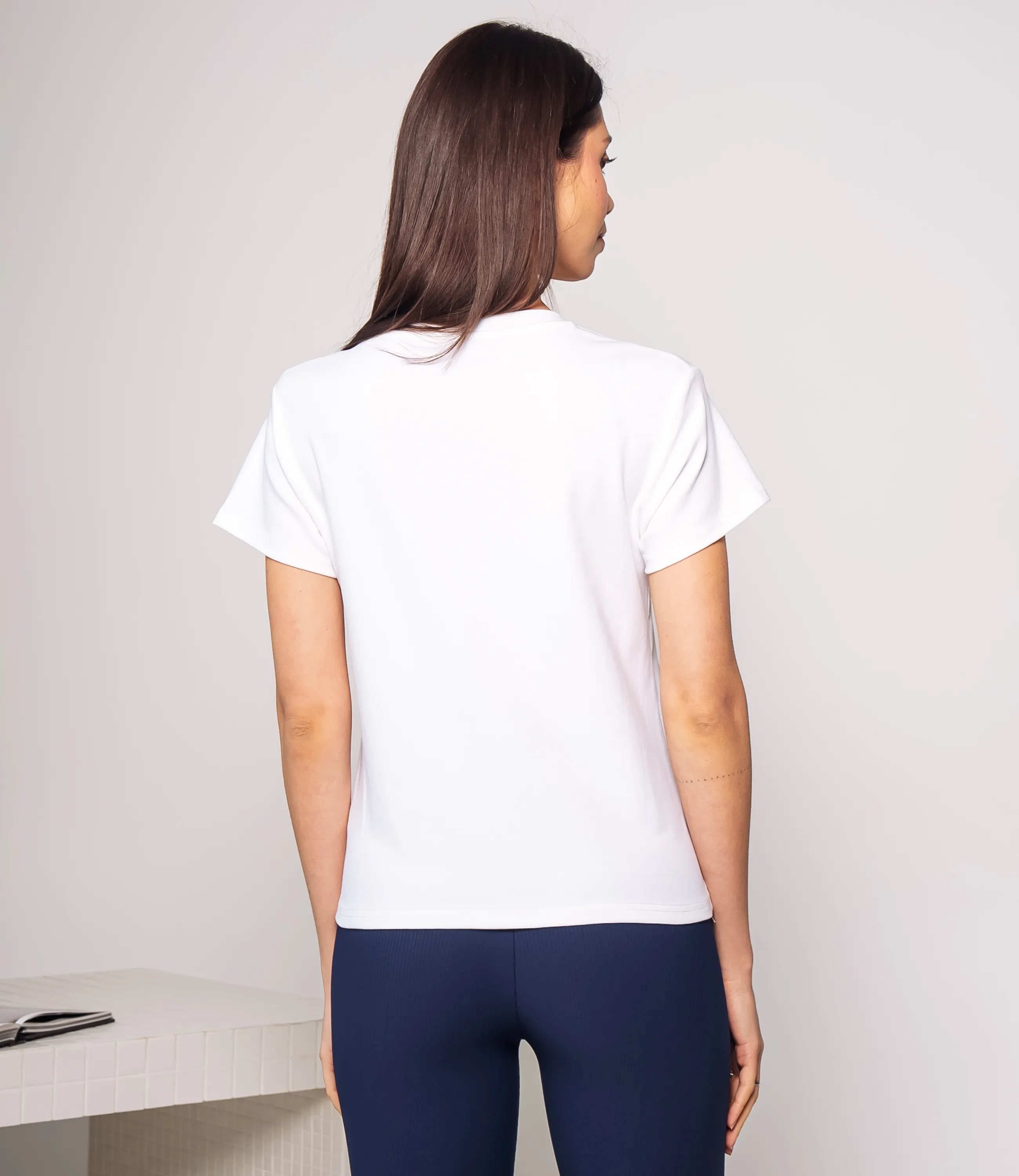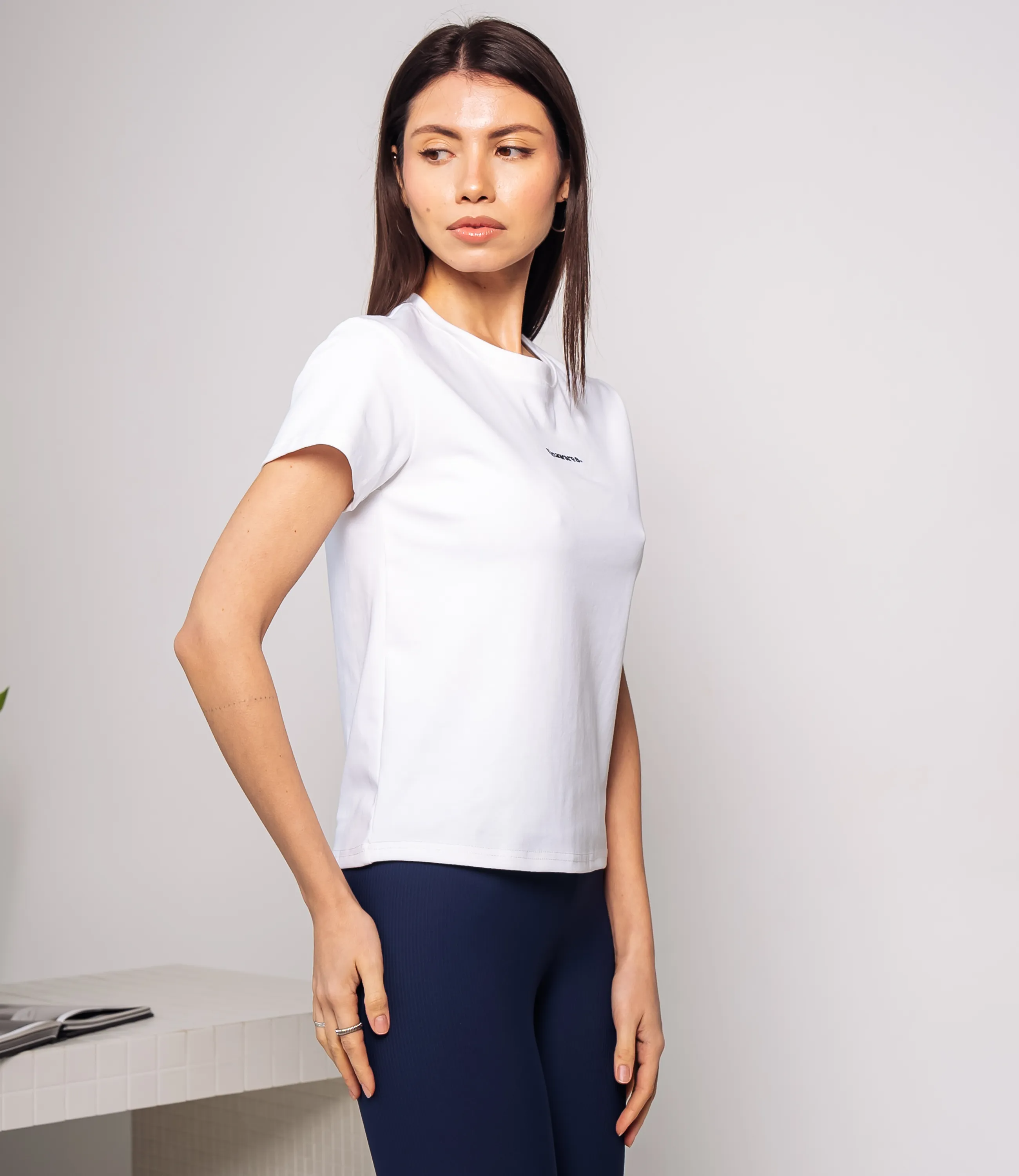 Эта футболка — прекрасный выбор для вашего магазина, предлагая стильный и универсальный дизайн, который станет отличным дополнением к гардеробу ваших клиентов. Футболка приталенного классического кроя с круглым вырезом горловины и короткими рукавами до середины плеча. посадка облегающая по корпусу с естественным прилеганием, длина до линии бедер, низ прямой с простой подгибкой; на передней части в центре груди небольшая надпись в лаконичном шрифте, композиция минималистичная. Выполненная из ткани с 95% хлопка, 5% спандекса, футболка обеспечивает отличное качество и приятные тактильные ощущения. Независимо от сезона, она станет любимым элементом в гардеробе ваших клиентов. На странице сайта доступна таблица размеров, что позволит вашим покупателям легко найти подходящий вариант. Установленная цена делает эту футболку доступной для широкой аудитории, что обеспечит вам высокий уровень продаж. Рост модели: 164, параметры: 83-61-89.