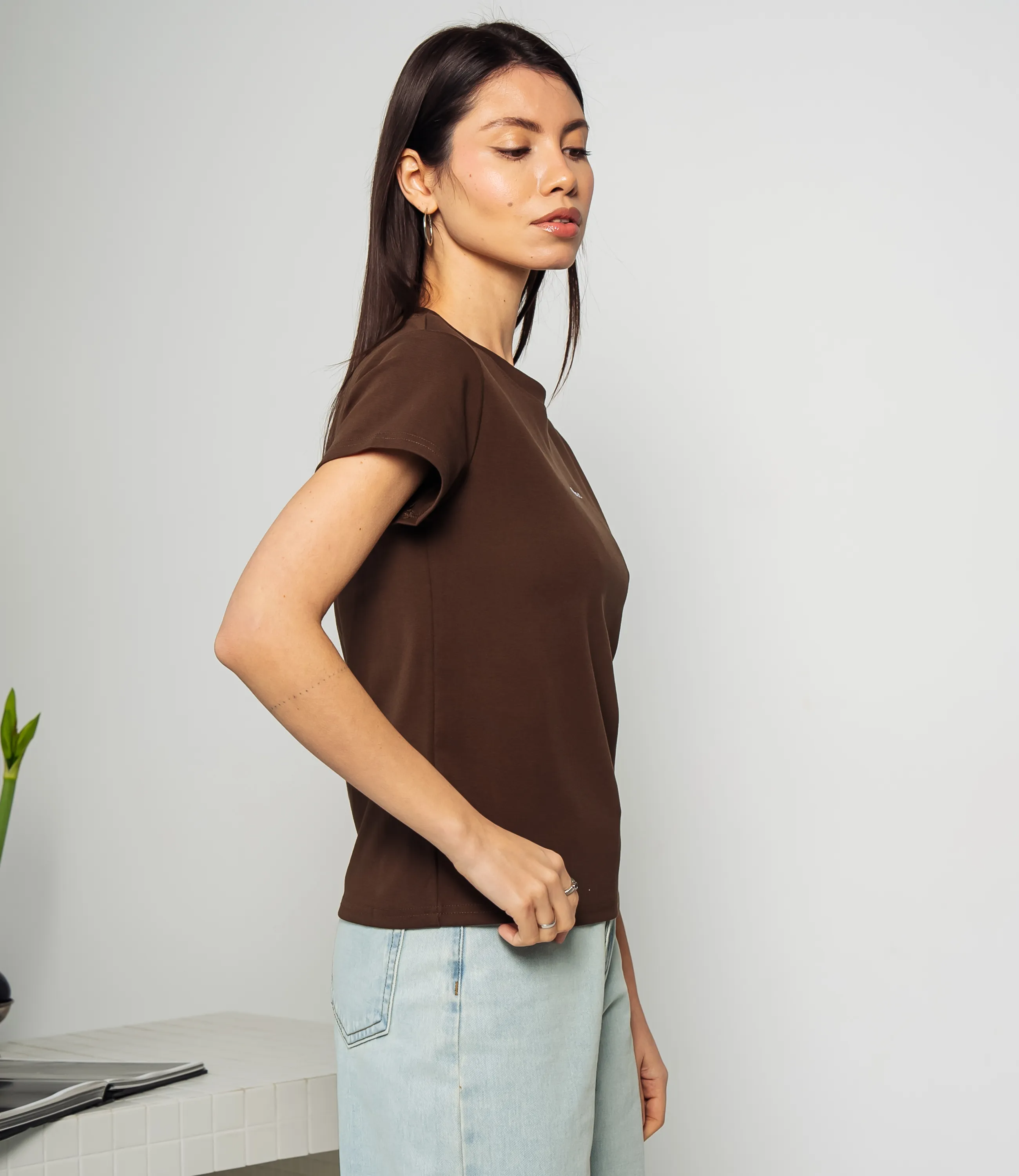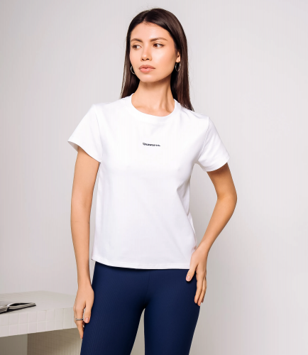 Эта футболка — прекрасный выбор для вашего магазина, предлагая стильный и универсальный дизайн, который станет отличным дополнением к гардеробу ваших клиентов. Футболка приталенного классического кроя с круглым вырезом горловины и короткими рукавами до середины плеча. посадка облегающая по корпусу с естественным прилеганием, длина до линии бедер, низ прямой с простой подгибкой; на передней части в центре груди небольшая надпись в лаконичном шрифте, композиция минималистичная. Выполненная из ткани с 95% хлопка, 5% спандекса, футболка обеспечивает отличное качество и приятные тактильные ощущения. Независимо от сезона, она станет любимым элементом в гардеробе ваших клиентов. На странице сайта доступна таблица размеров, что позволит вашим покупателям легко найти подходящий вариант. Установленная цена делает эту футболку доступной для широкой аудитории, что обеспечит вам высокий уровень продаж. Рост модели: 164, параметры: 83-61-89.