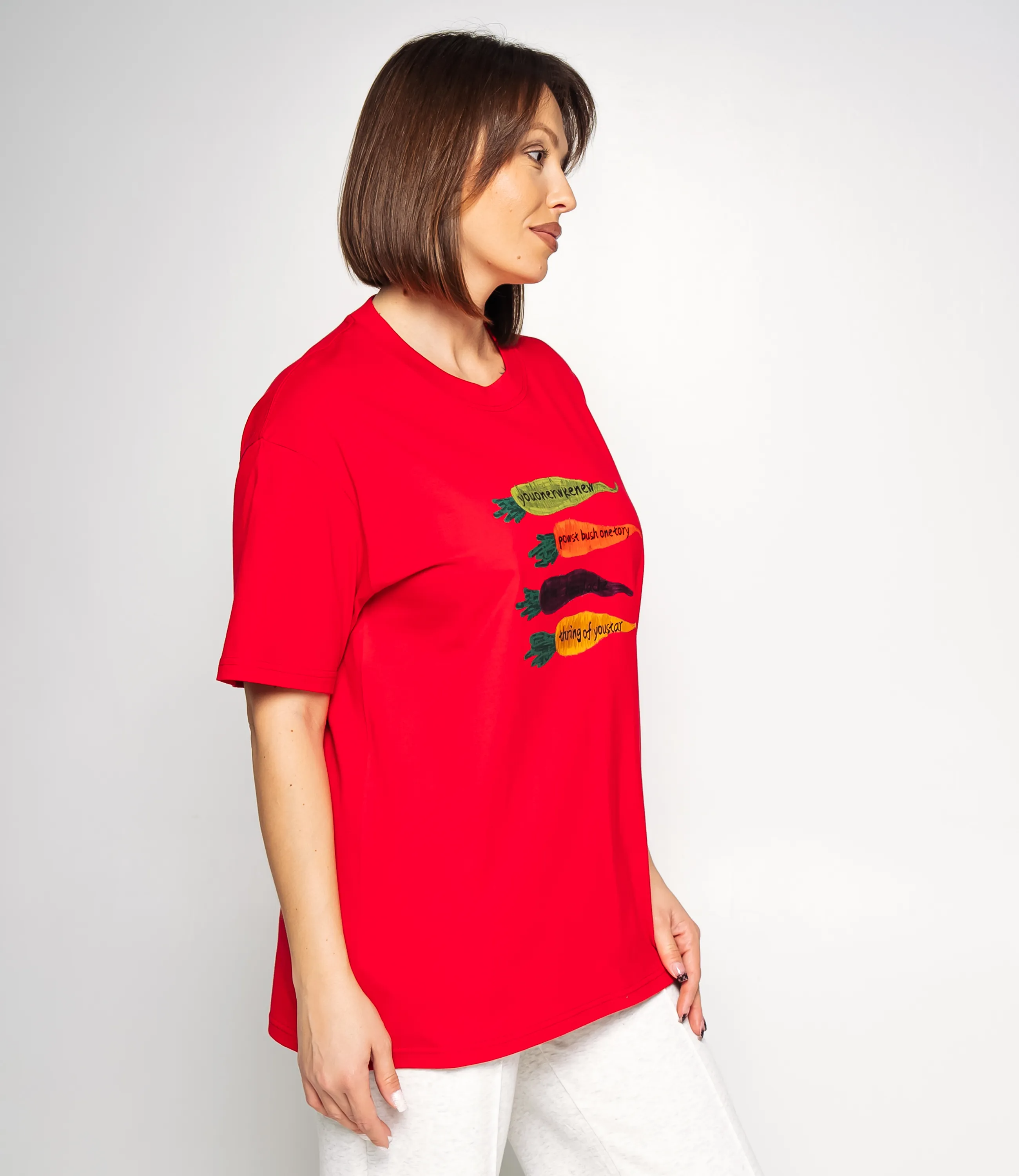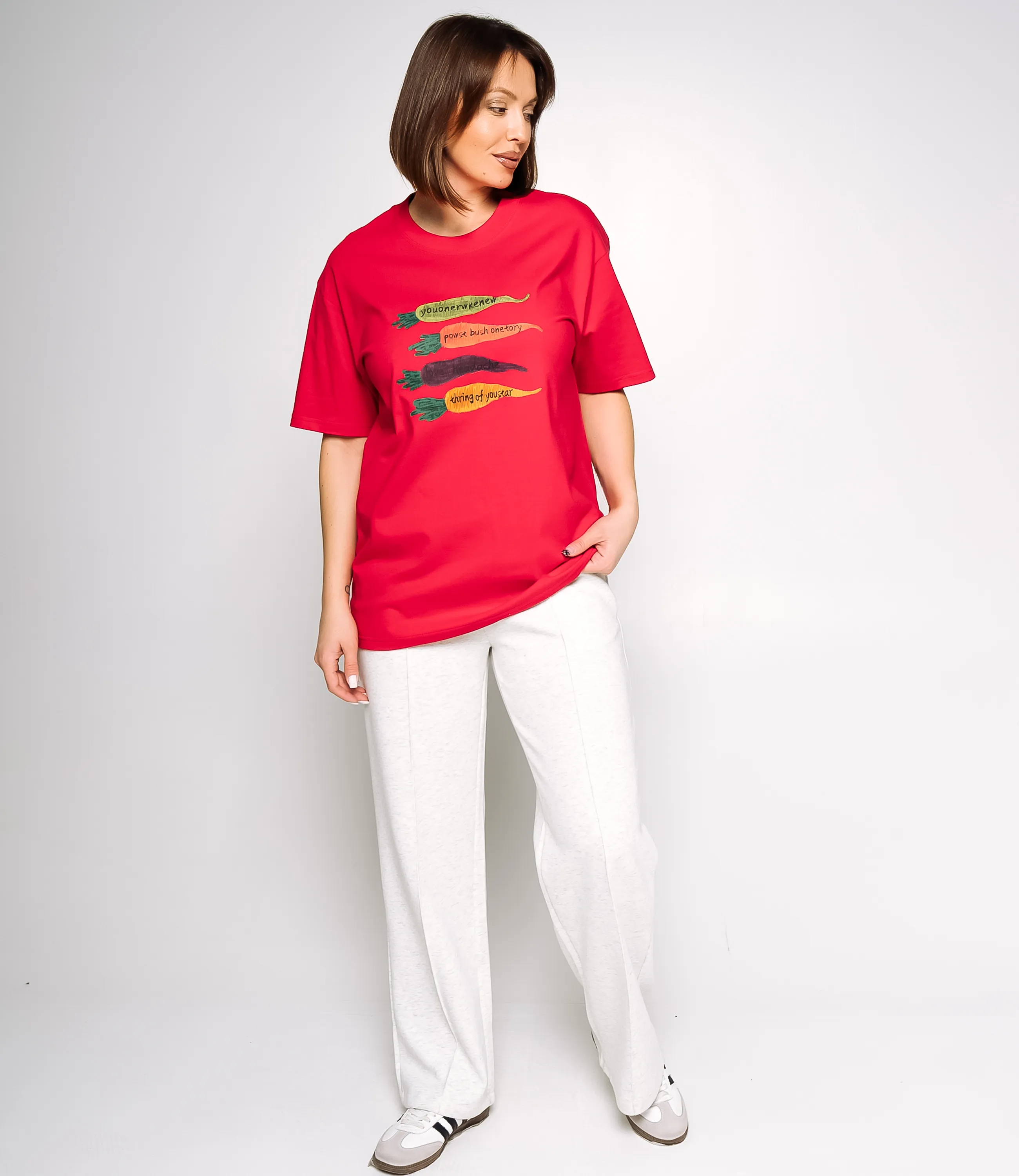 Эта футболка — прекрасный выбор для вашего магазина, предлагая стильный и универсальный дизайн, который станет отличным дополнением к гардеробу ваших клиентов. Свободная футболка с круглым вырезом и короткими рукавами, чуть удлинённым прямым силуэтом из гладкого трикотажа средней плотности, с опущенными плечевыми швами, простроченным краем горловины и прямым подолом; на груди центрированный плоский принт из четырёх продолговатых овощных мотивов с рукописным текстом. Выполненная из 100% хлопок, футболка обеспечивает отличное качество и приятные тактильные ощущения. Независимо от сезона, она станет любимым элементом в гардеробе ваших клиентов. На странице сайта доступна таблица размеров, что позволит вашим покупателям легко найти подходящий вариант. Установленная цена делает эту футболку доступной для широкой аудитории, что обеспечит вам высокий уровень продаж.