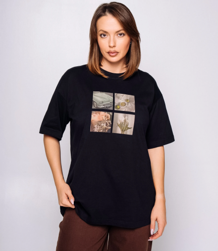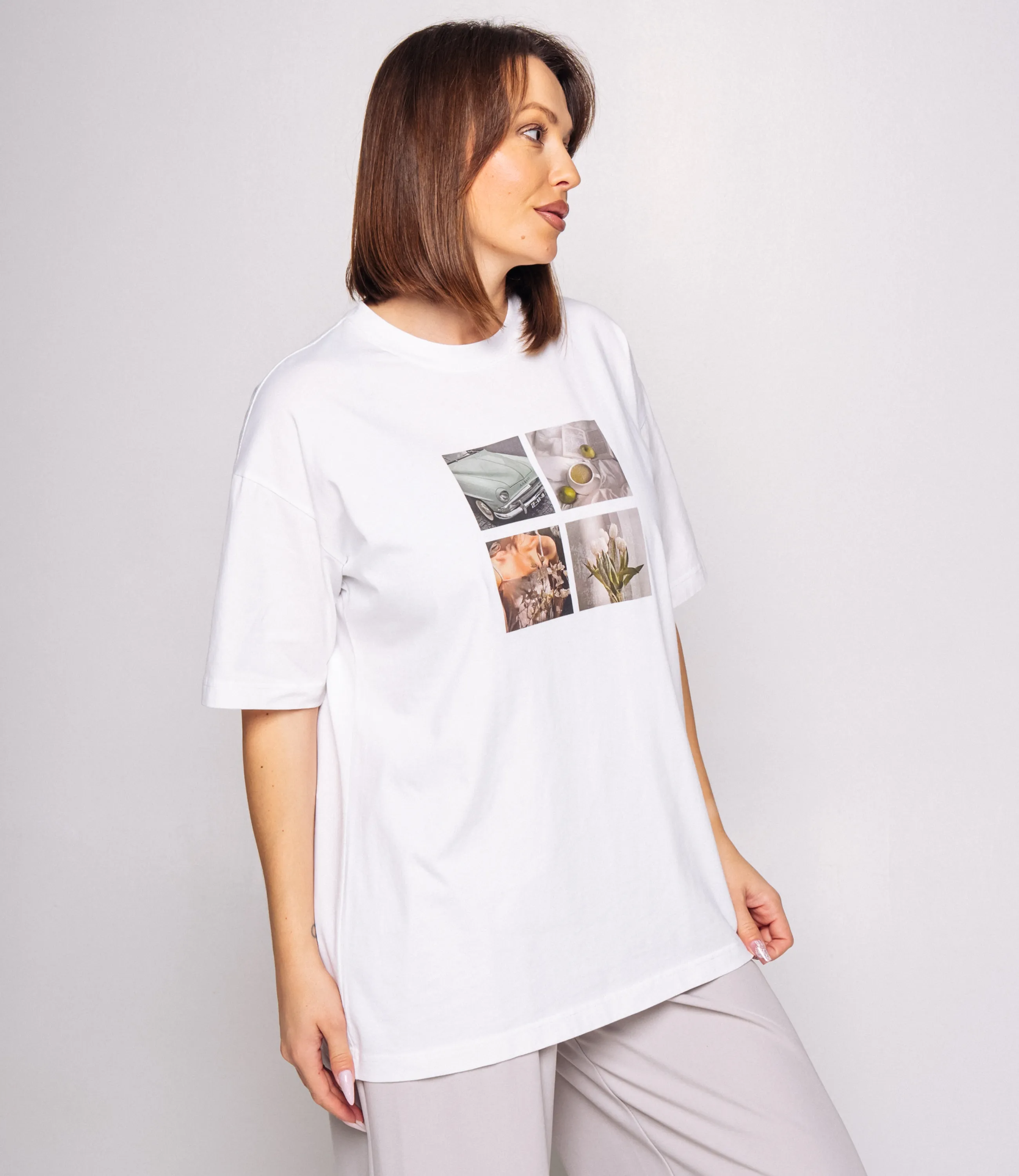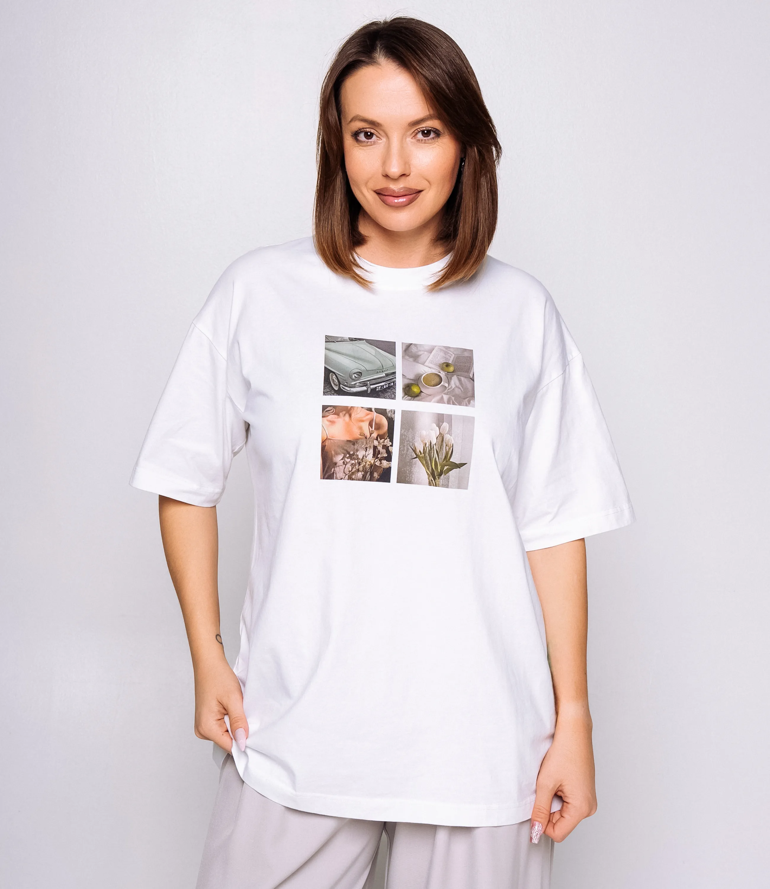 Эта футболка — пребелый выбор для вашего магазина, предлагая стильный и универсальный дизайн, который станет отличным дополнением к гардеробу ваших клиентов. Свободный оверсайз-фасон с прямым силуэтом и длиной до середины бёдер, опущенные плечевые швы и рукава чуть выше локтя прямого кроя; круглая горловина с узкой мягкой планкой, плотно и комфортно прилегающая. На груди крупный графический блок, разбитый на четыре равных квадрата с фотоподобными изображениями Выполненная из ткани с 80% хлопка, 20% полиэстера, футболка обеспечивает отличное качество и приятные тактильные ощущения. Независимо от сезона, она станет любимым элементом в гардеробе ваших клиентов. На странице сайта доступна таблица размеров, что позволит вашим покупателям легко найти подходящий вариант. Установленная цена делает эту футболку доступной для широкой аудитории, что обеспечит вам высокий уровень продаж.