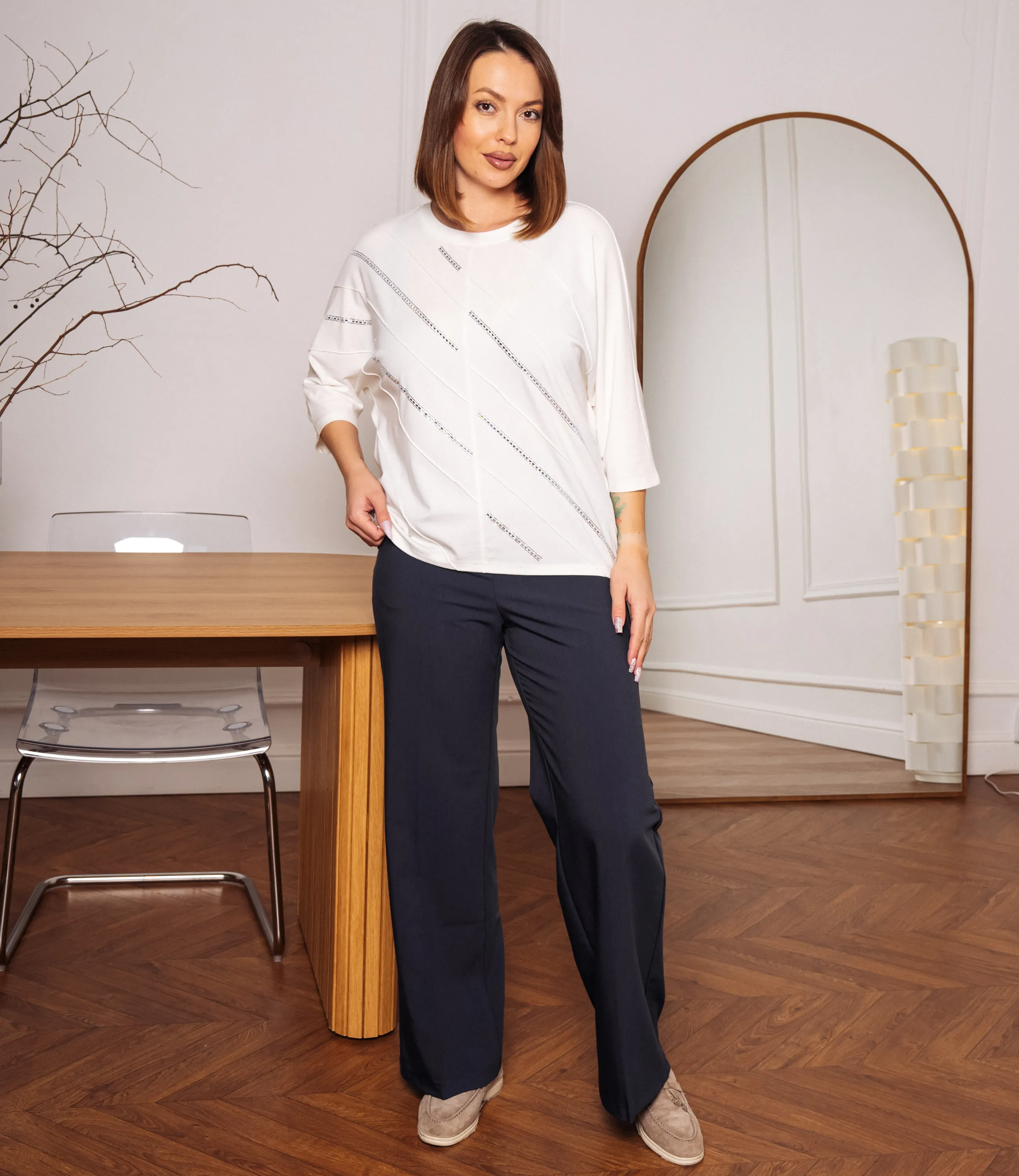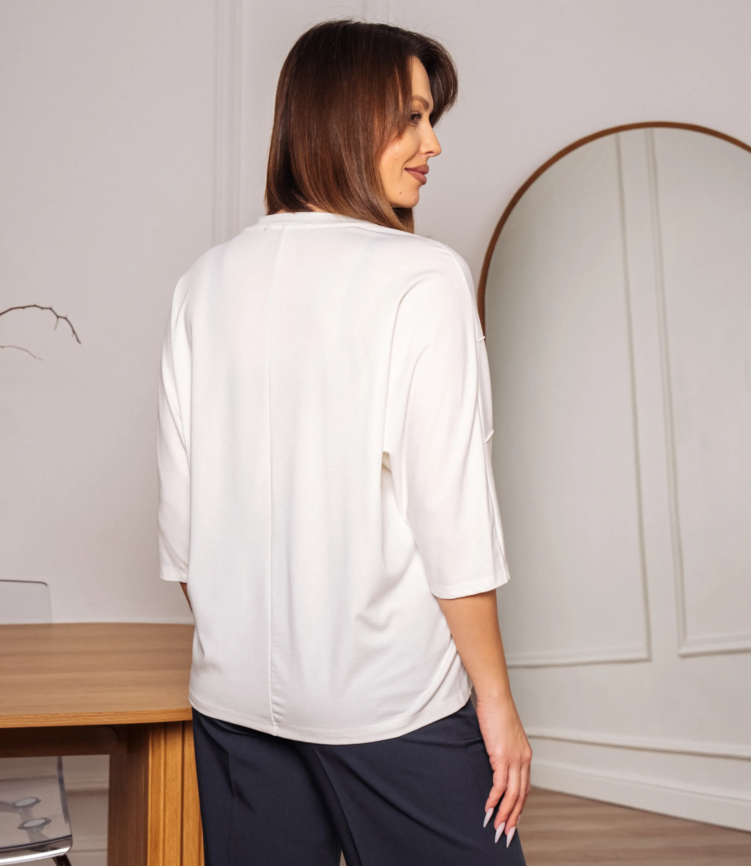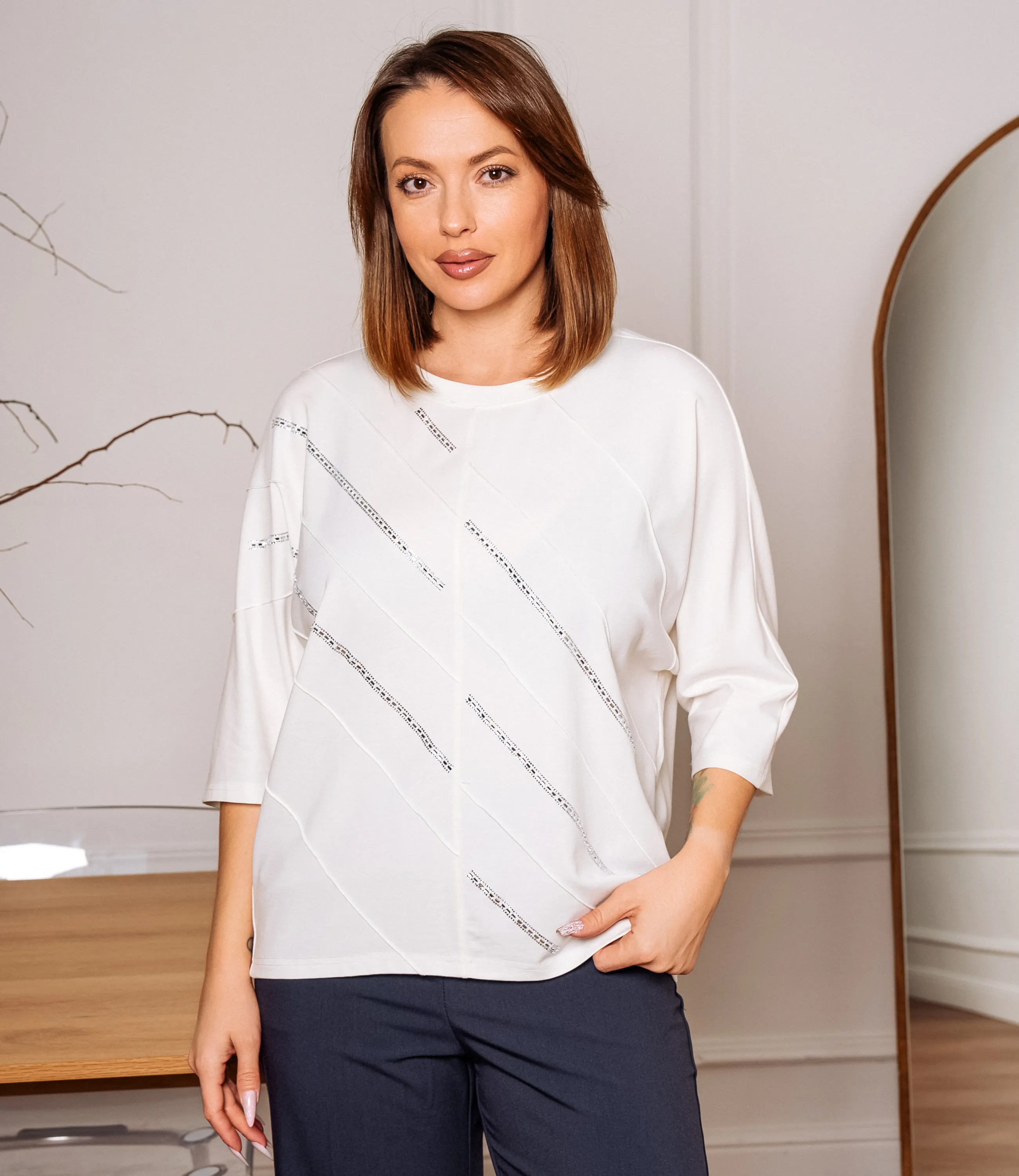 Эта футболка — прекрасный выбор для вашего магазина, предлагая стильный и универсальный дизайн, который станет отличным дополнением к гардеробу ваших клиентов. Футболка свободного полуоверсайз кроя из мягкого тянущегося трикотажа средней плотности, с круглым аккуратным вырезом горловины и опущенной линией плеча; длина чуть ниже талии, нижний край обработан узким подгибом и ровный; рукава свободные длиной до локтя или чуть выше, обеспечивают лёгкую драпировку в области плеч; передняя часть украшена асимметричными диагональными полосами. Выполненная из ткани с 95% хлопка, 5% спандекс, футболка обеспечивает отличное качество и приятные тактильные ощущения. Независимо от сезона, она станет любимым элементом в гардеробе ваших клиентов. На странице сайта доступна таблица размеров, что позволит вашим покупателям легко найти подходящий вариант. Установленная цена делает эту футболку доступной для широкой аудитории, что обеспечит вам высокий уровень продаж.