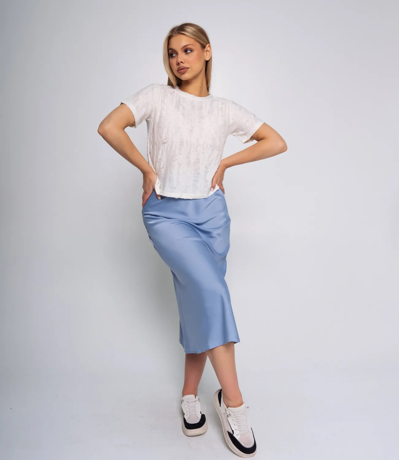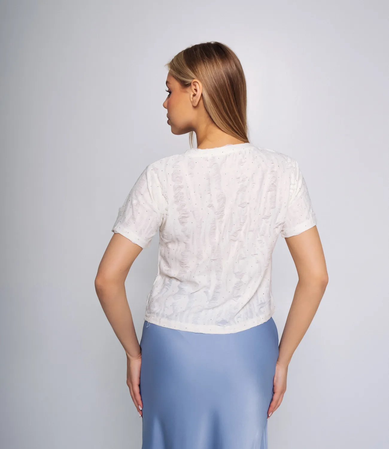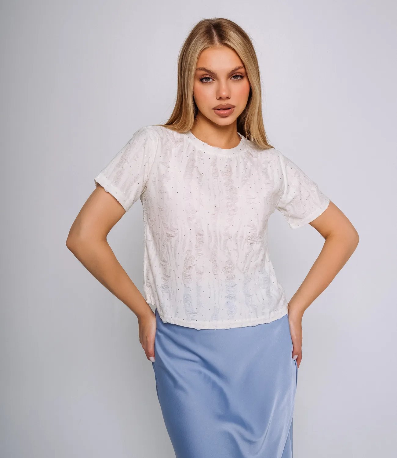 Футболка – это часть гардероба, которая подчеркивает женственность каждой женщины. Данная модель футболки с коротким рукавом отлично подойдет для летнего сезона. Ее выбирают женщины, которые ценят сочетание качества и цены. Силуэт подчеркивает красоту фигуры. Производитель умеет находить эффектные и модные решения. Для изготовления использована ткань 80% хлопок, 20% полиэстер, которая характеризуется отличным качеством. Даже после многих стирок футболка не потеряет изначальной привлекательности. Вы обязательно будете ее носить с радостью. Обращайте внимание на декоративные разрезы и стразы, которые добавляют изюминку в ваш образ. Цвет футболки также соответствует картинке на сайте. Чтобы быть уверенными в размере, обратитесь к таблице на сайте. Установленная нами цена является приемлемой. Не откажите себе в удовольствии быть стильной и неповторимой! Параметры модели: рост 168, 89-63-90.