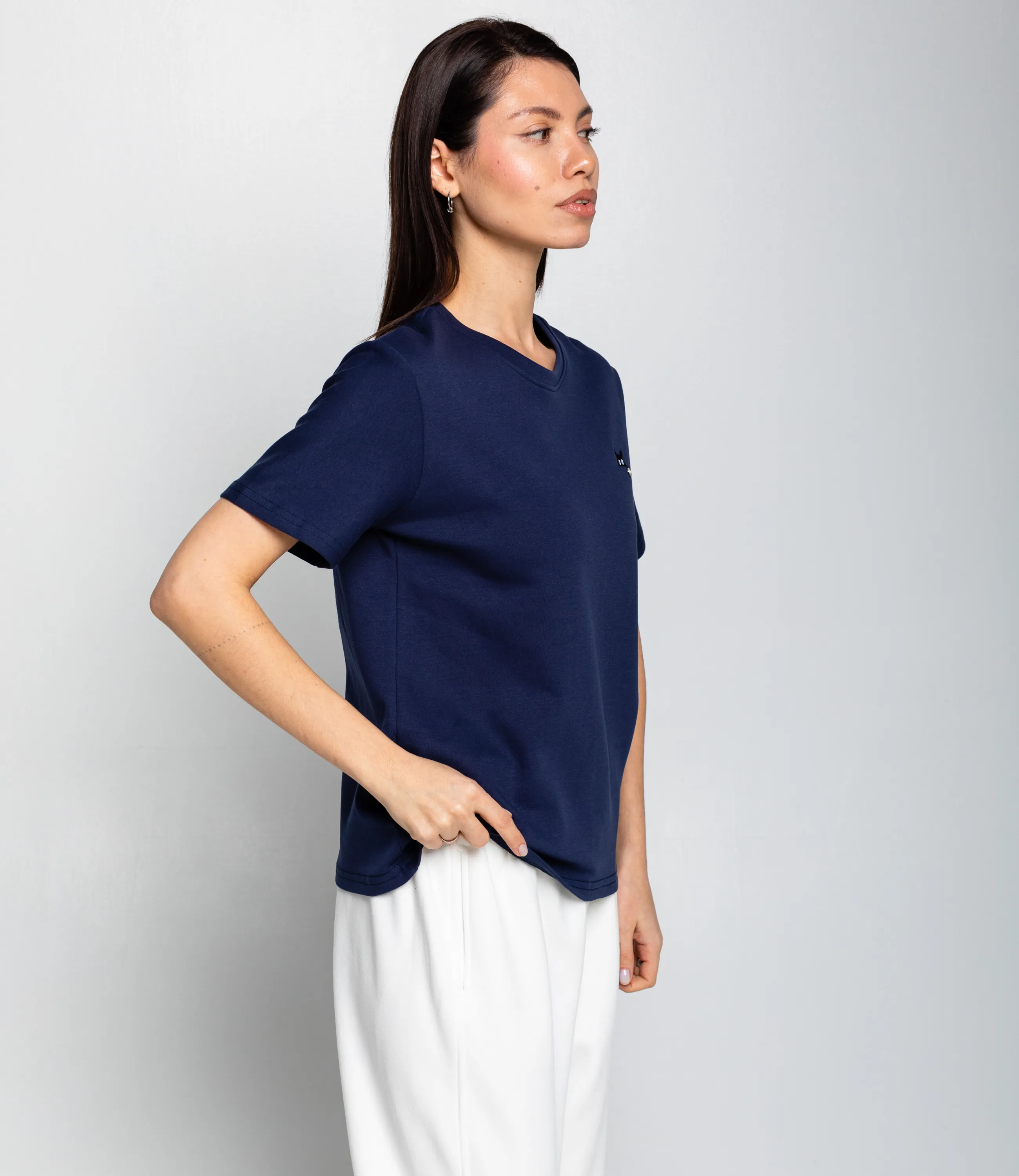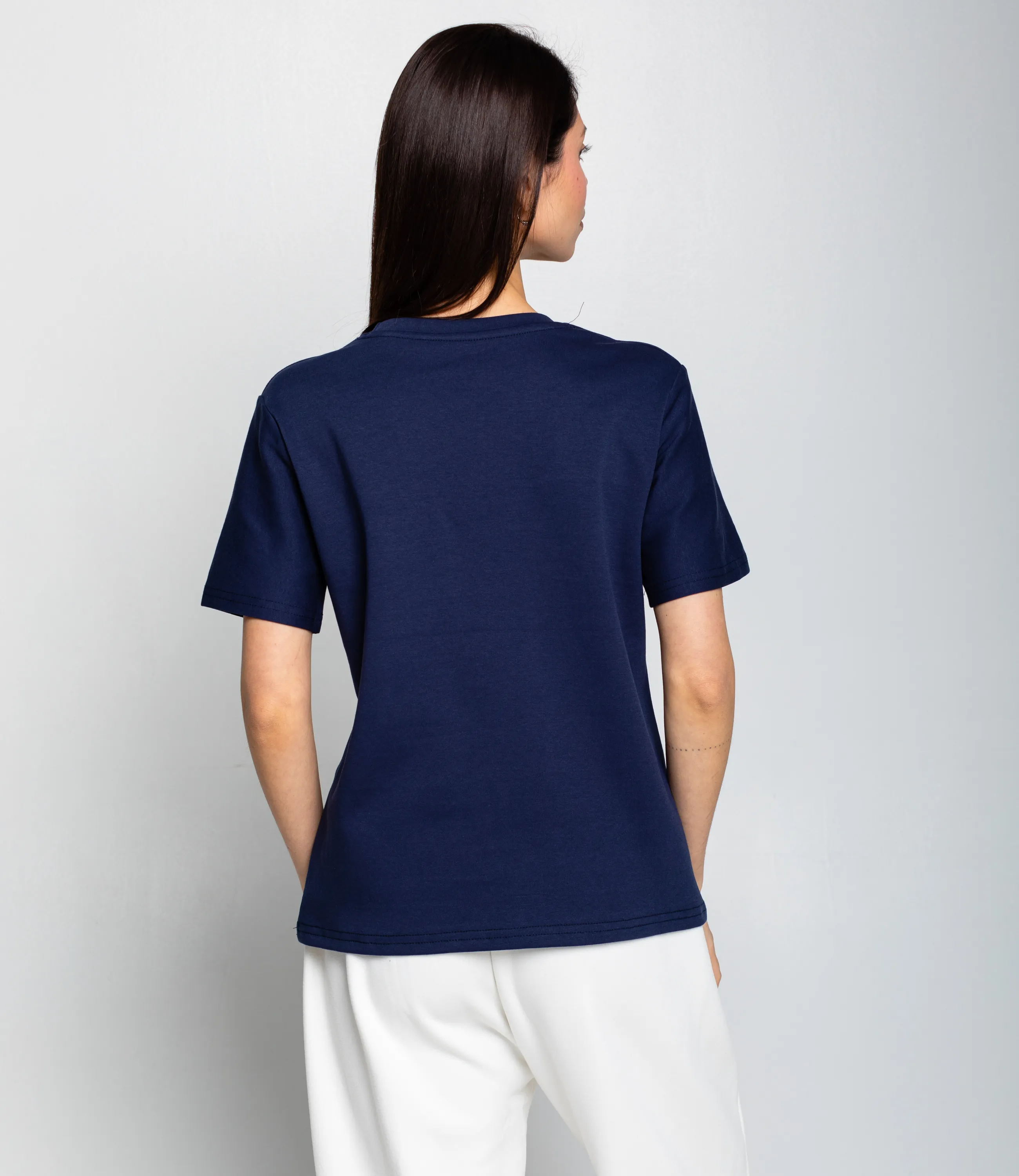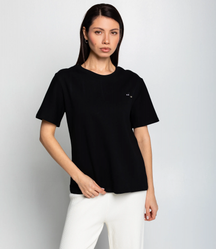 Эта футболка — прекрасный выбор для вашего магазина, предлагая стильный и универсальный дизайн, который станет отличным дополнением к гардеробу ваших клиентов. Футболка — прямого свободного кроя с круглым втачным вырезом горловины и укороченными рукавами, длиной до линии бедер; плечевые швы смещены в естественное положение, облегание свободное по туловищу, подол ровный. Ткань однотонная, плотная трикотажная гладкая с умеренной драпировкой и четкой структурой полотна, без дополнительной текстуры или узора. На левой части груди небольшая аппликация или нашивка в виде миниатюрного декоративного элемента; горловина оформлена двойной подгибкой с прочной строчкой, манжеты рукавов также подшиты узкой подгибкой. Швы боковые и плечевые выполнены стандартной прямой строчкой, отсутствие карманов и декоративных швов, кромка обработана аккуратно, изделие рассчитано на повседневную носку. Выполненная из ткани с 80% хлопка, 15% полиэстер и 5% спандекс, футболка обеспечивает отличное качество и приятные тактильные ощущения. Независимо от сезона, она станет любимым элементом в гардеробе ваших клиентов. На странице сайта доступна таблица размеров, что позволит вашим покупателям легко найти подходящий вариант. Установленная цена делает эту футболку доступной для широкой аудитории, что обеспечит вам высокий уровень продаж. Рост модели: 164, параметры: 83-61-89.