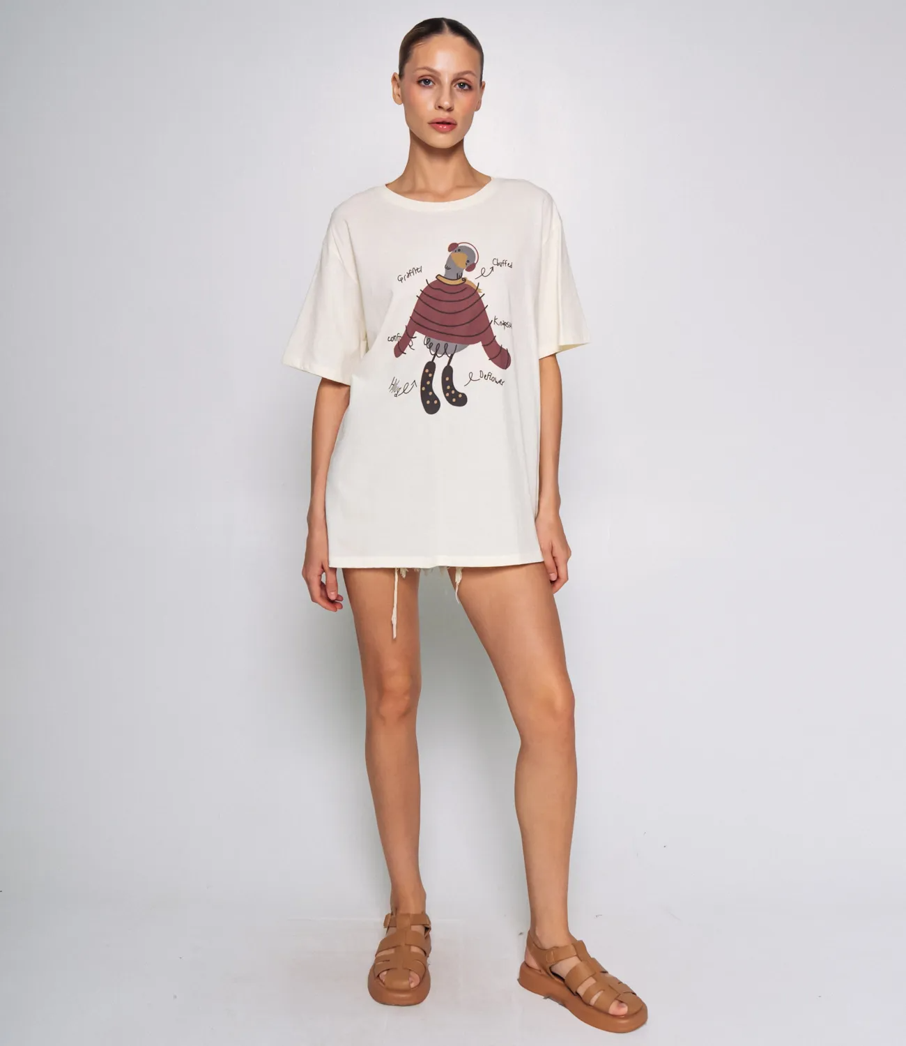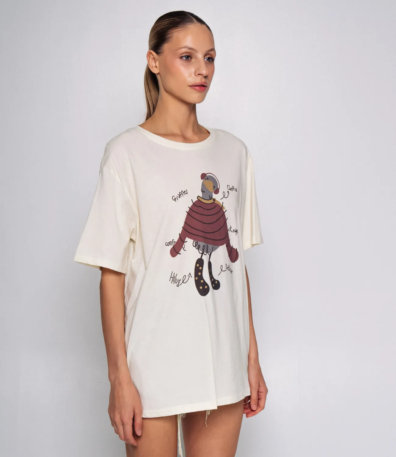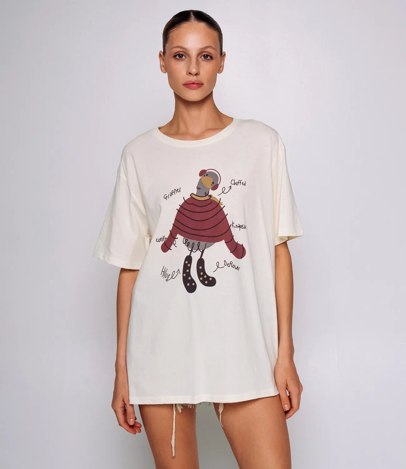 Футболка — это незаменимая часть гардероба, которая идеально подойдет для создания стильных и комфортных образов. Эта модель свободного кроя с короткими рукавами и круглым вырезом горловины станет отличным выбором для вашего магазина. Изготовленная из 85% хлопка и 15% спандекса, она обеспечивает отличную воздухопроницаемость и удобство при носке, что особенно актуально в теплую погоду. На передней части футболки изображён яркий мультяшный рисунок птицы в наушниках и полосатой одежде, что придаёт модели игривый и оригинальный вид. Удобный дизайн с надписями и стрелками, указывающими на детали рисунка, делает эту футболку не только массивным, но и интересным элементом гардероба, который привлечет внимание вашей целевой аудитории. Данная модель футболки популярен среди женщин и молодежи, которые ценят комфорт и стиль в повседневной одежде. Обратите внимание на разнообразие доступных цветов и декоративных элементов, которые полностью соответствуют фотографиям на сайте. Это даст вашим клиентам уверенность в их выборе и поможет им быстро определиться с покупкой. Для удобства мы также подготовили таблицу размеров, чтобы каждая покупательница смогла легко подобрать нужный размер и быть уверенной в соответствии изделия своим параметрам. Установленная нами цена является доступной и приемлемой для оптовых покупателей, что позволит вам легко расширить ассортимент вашего магазина. Не упустите возможность предложить своим клиентам эту замечательную футболку, которая будет радовать их своим стилем и качеством! Позвольте им наслаждаться комфортом и выразить свою индивидуальность с этой стильной футболкой!