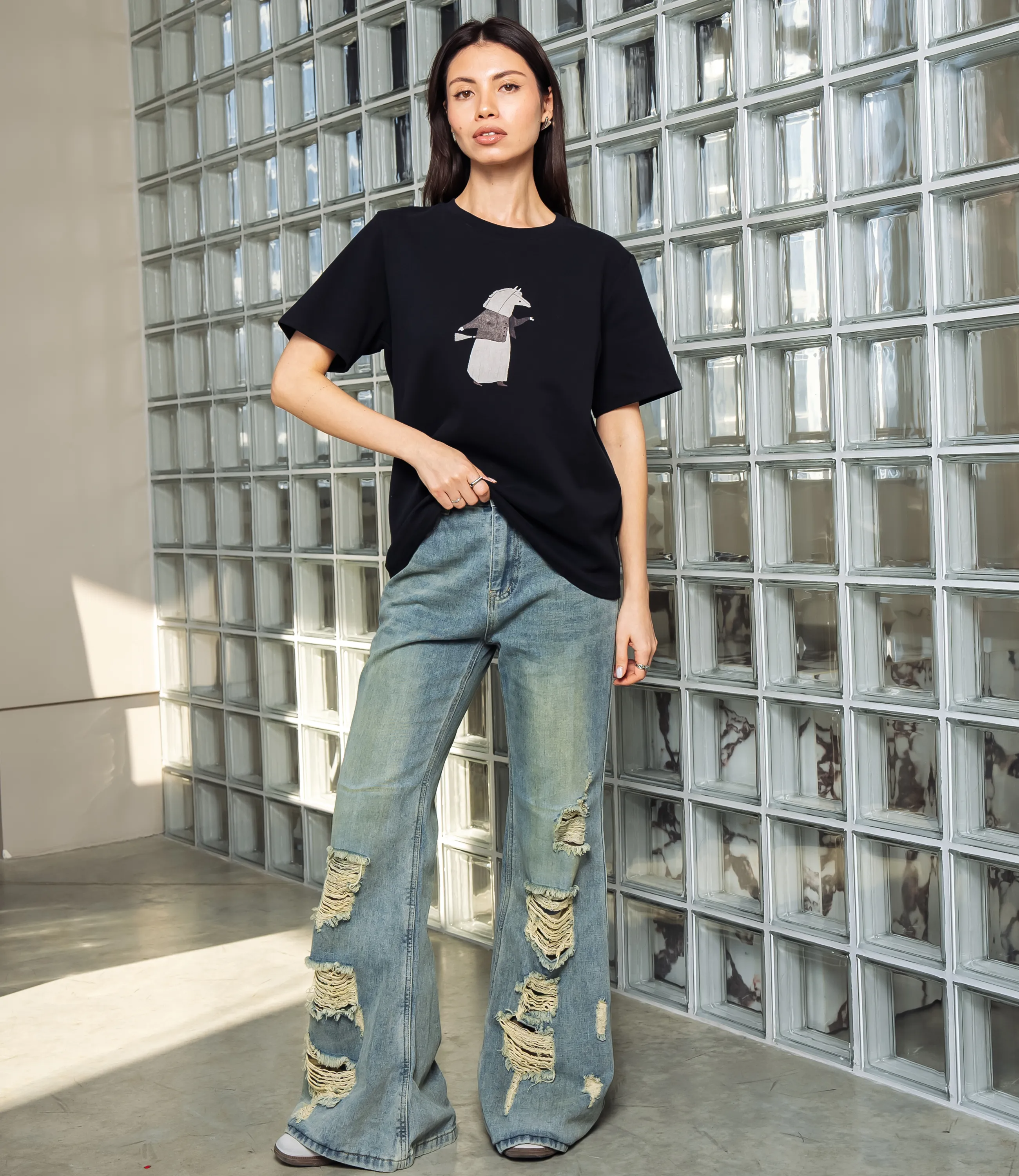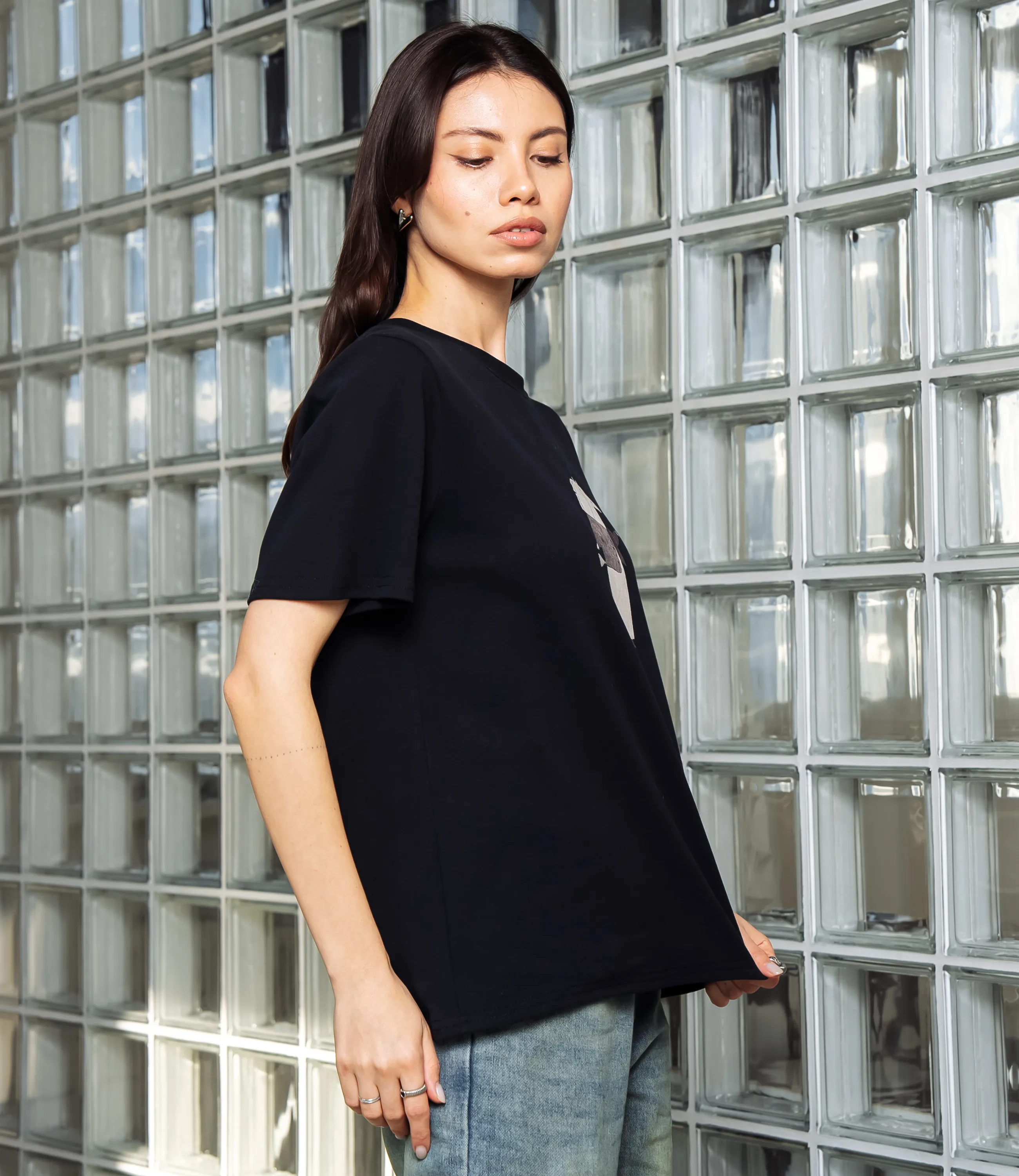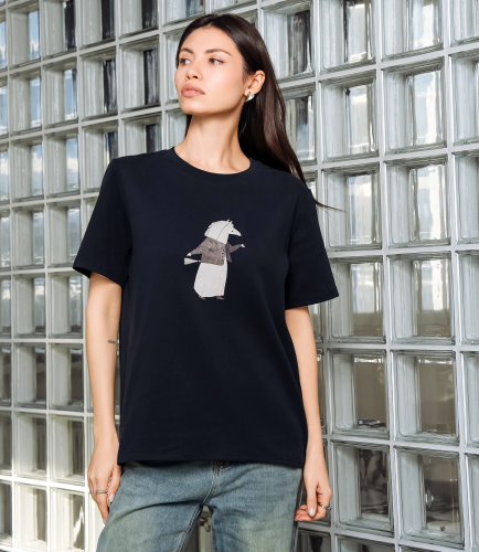 Эта футболка — прекрасный выбор для вашего магазина, предлагая стильный и универсальный дизайн, который станет отличным дополнением к гардеробу ваших клиентов. Футболка свободного прямого силуэта с классическим круглым вырезом горловины, выполнена из плотного трикотажного полотна с ровной, слегка матовой фактурой; плечевые швы смещены по линии плеч, рукава короткие, чуть расширенные к низу, без отворотов и с аккуратной подгибкой по краю; передняя часть украшена небольшым принтом в центре груди — схематичное изображение персонажа в простых графических формах с тонкой контурной прорисовкой и фактурной заливкой внутри фигуры. Выполненная из ткани с 95% хлопка, 5% спандекс, футболка обеспечивает отличное качество и приятные тактильные ощущения. Независимо от сезона, она станет любимым элементом в гардеробе ваших клиентов. На странице сайта доступна таблица размеров, что позволит вашим покупателям легко найти подходящий вариант. Установленная цена делает эту футболку доступной для широкой аудитории, что обеспечит вам высокий уровень продаж. Рост модели: 164, параметры: 83-61-89.