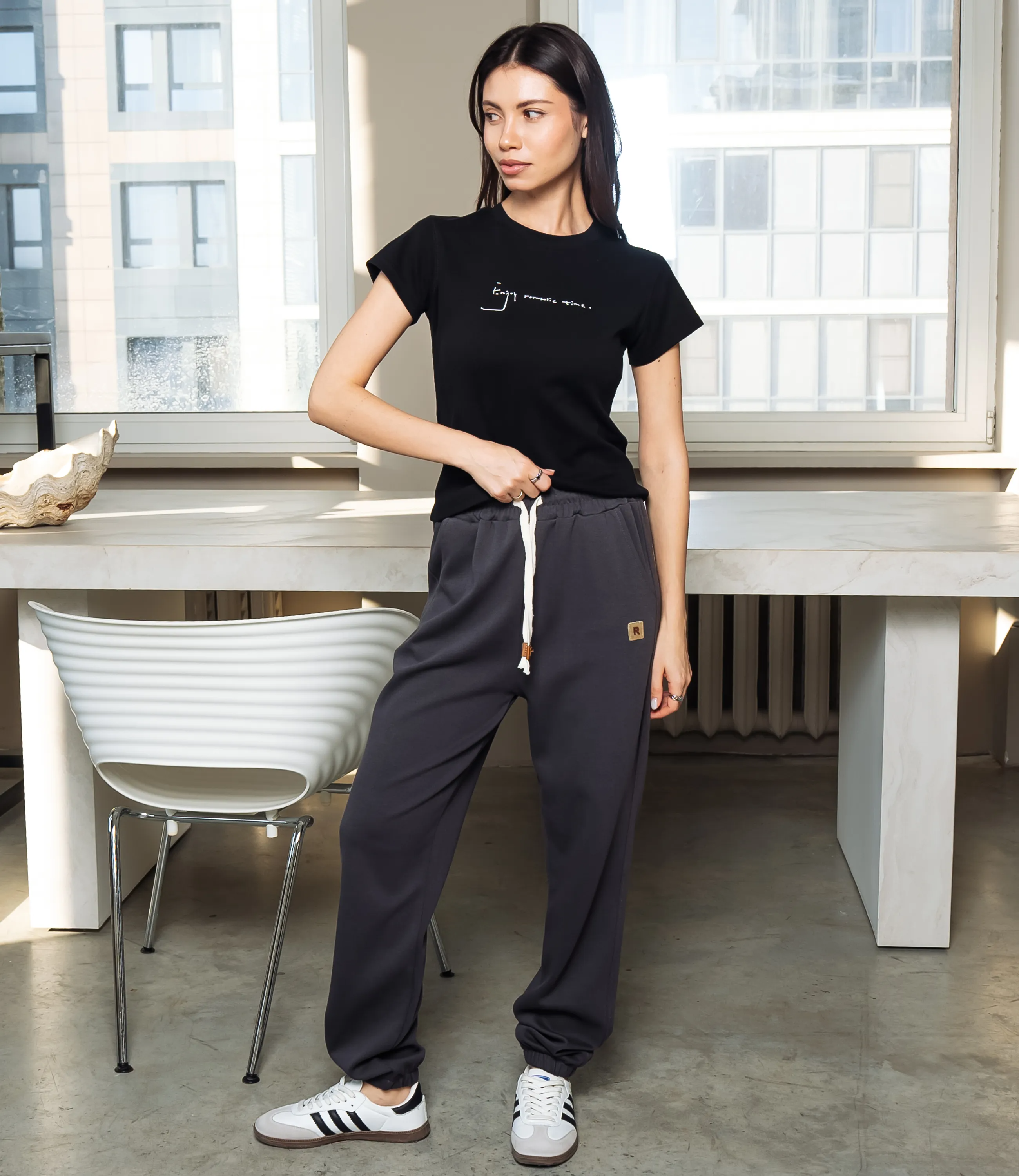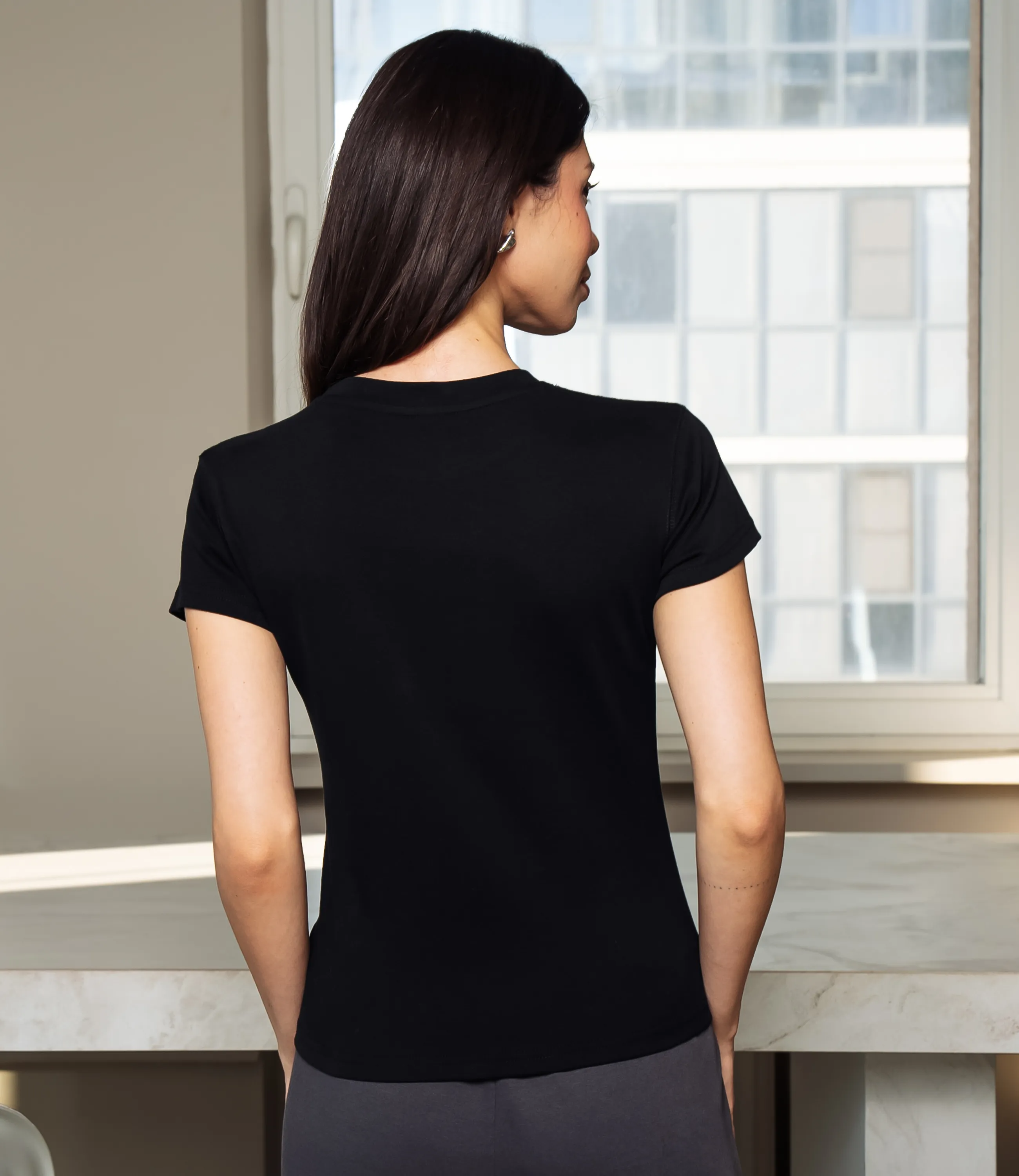 Эта футболка — прекрасный выбор для вашего магазина, предлагая стильный и универсальный дизайн, который станет отличным дополнением к гардеробу ваших клиентов. Футболка приталенного кроя с классическим круглым вырезом горловины, выполненная из тонкого, мягкого трикотажного полотна с небольшим стрейчем; плечевые швы слегка скошены для аккуратной посадки, короткие рукава средней длины, плотно прилегающие по руке. Передняя часть гладкая, на уровне груди расположен небольшой тонкий принт рукописного стиля. Выполненная из ткани с 95% хлопка, 5% спандекс, футболка обеспечивает отличное качество и приятные тактильные ощущения. Независимо от сезона, она станет любимым элементом в гардеробе ваших клиентов. На странице сайта доступна таблица размеров, что позволит вашим покупателям легко найти подходящий вариант. Установленная цена делает эту футболку доступной для широкой аудитории, что обеспечит вам высокий уровень продаж. Рост модели: 164, параметры: 83-61-89.