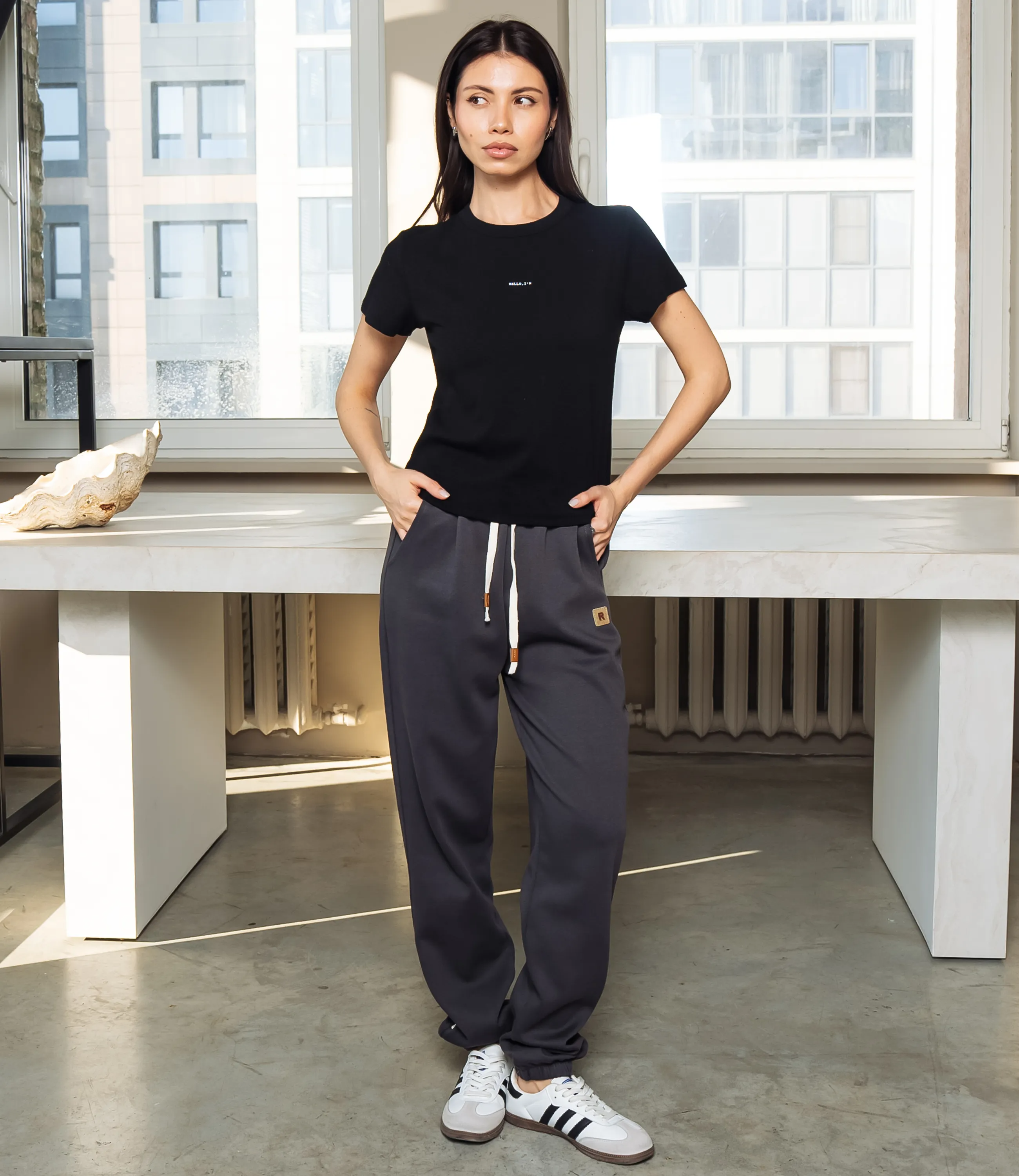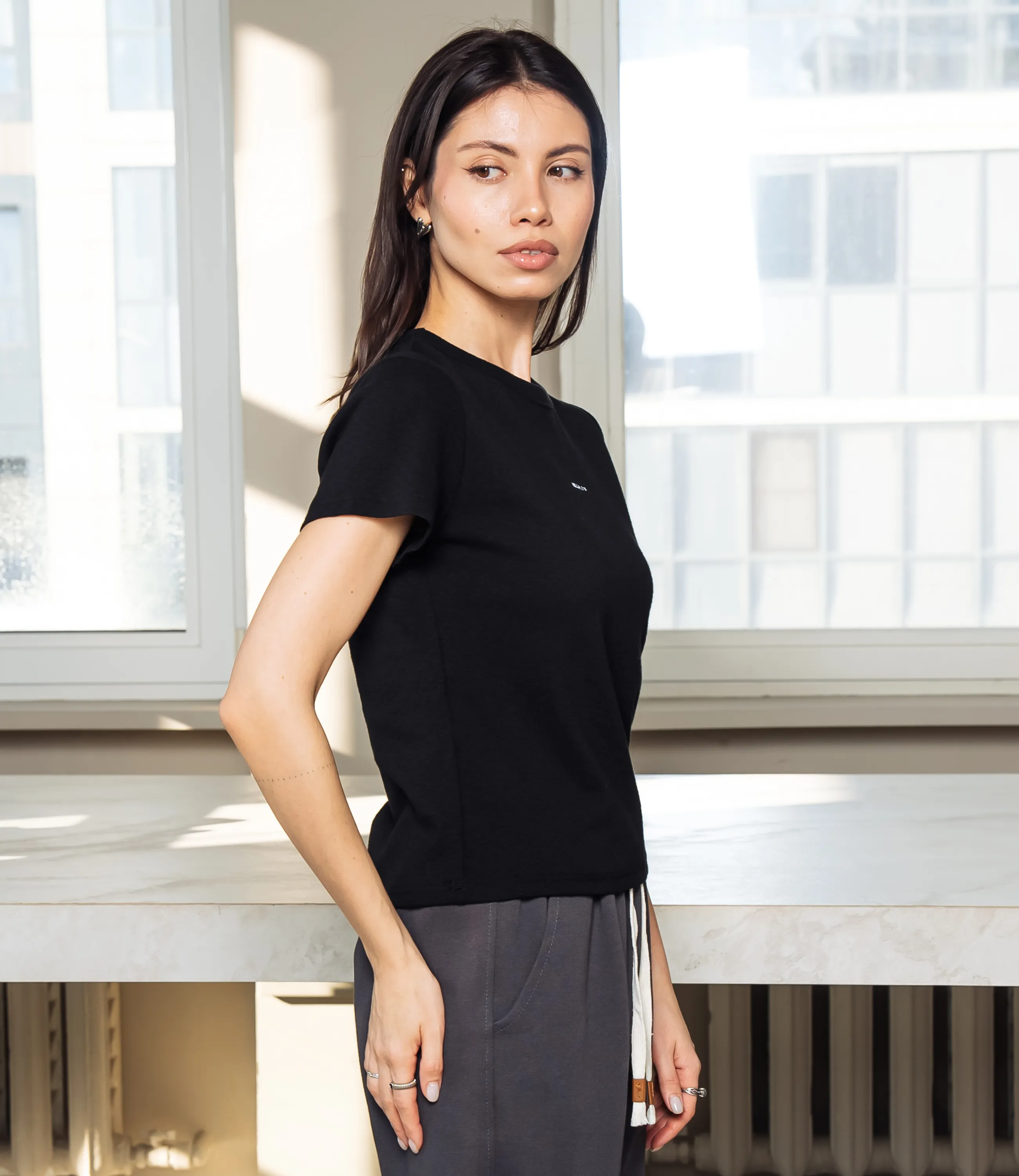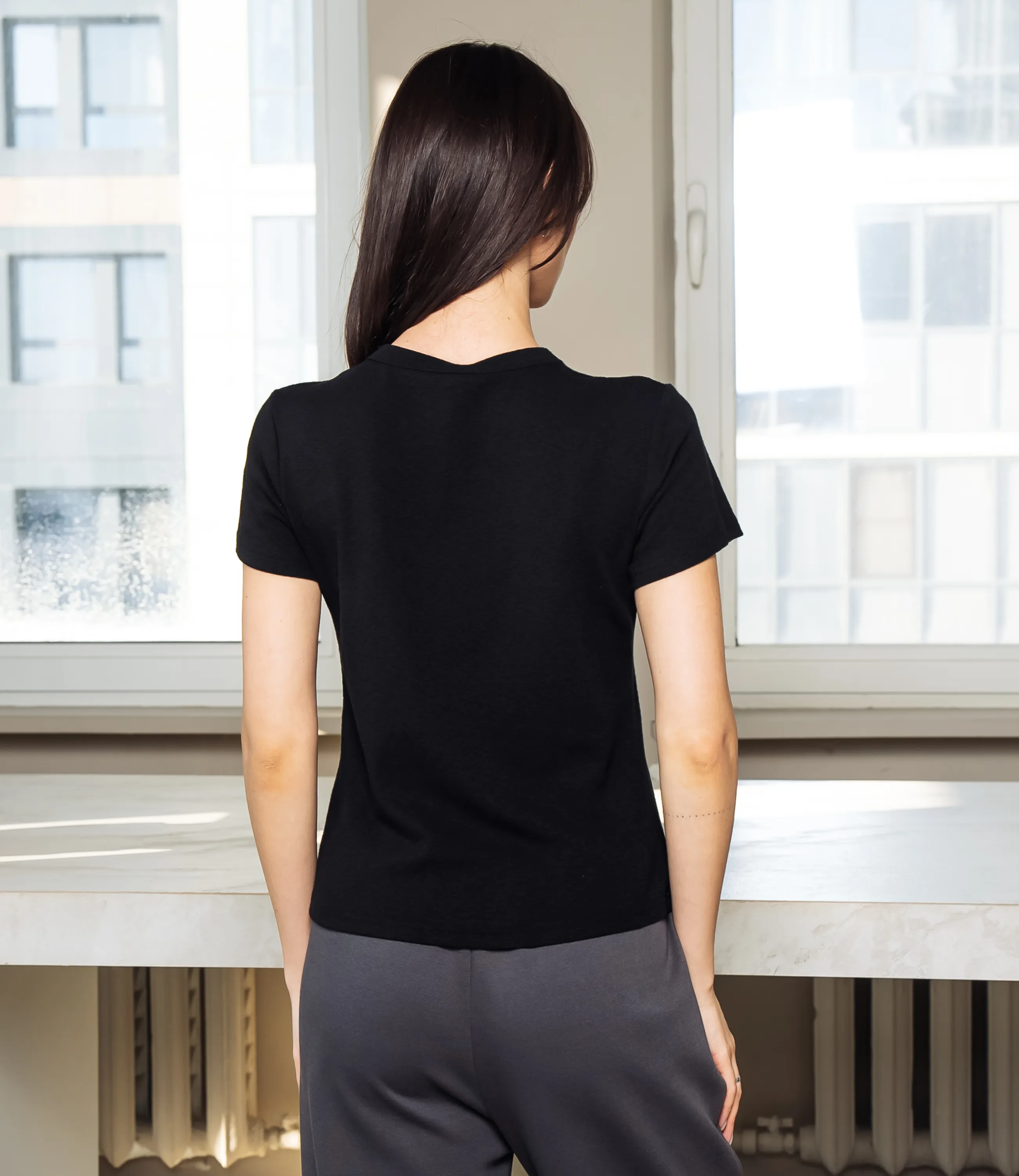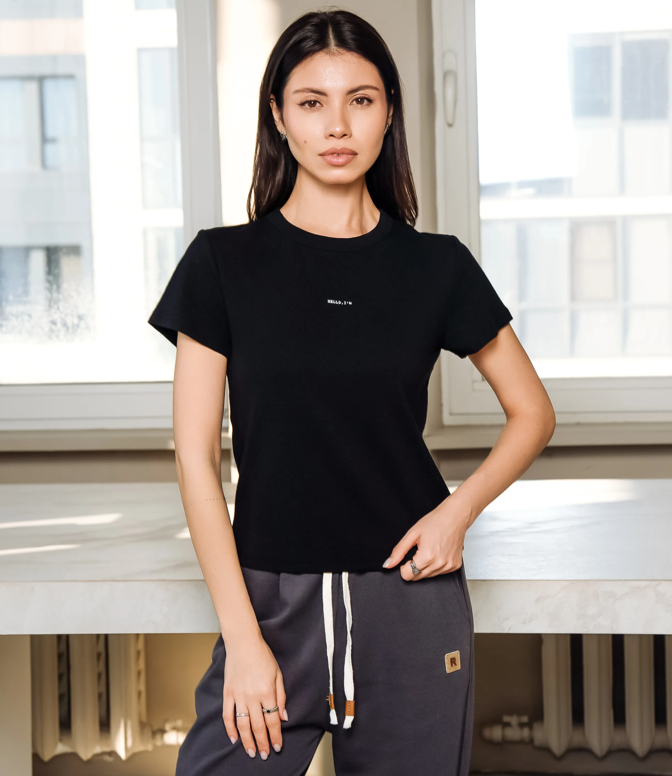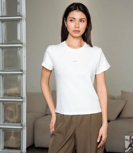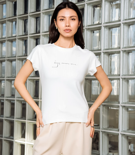 Эта футболка — прекрасный выбор для вашего магазина, предлагая стильный и универсальный дизайн, который станет отличным дополнением к гардеробу ваших клиентов. Футболка приталенного кроя с классическим круглым вырезом горловины, выполненная из тонкого, мягкого трикотажного полотна с небольшим стрейчем; плечевые швы слегка скошены для аккуратной посадки, короткие рукава средней длины, плотно прилегающие по руке. Передняя часть гладкая, на уровне груди расположен небольшой тонкий принт рукописного стиля. Выполненная из ткани с 95% хлопка, 5% спандекс, футболка обеспечивает отличное качество и приятные тактильные ощущения. Независимо от сезона, она станет любимым элементом в гардеробе ваших клиентов. На странице сайта доступна таблица размеров, что позволит вашим покупателям легко найти подходящий вариант. Установленная цена делает эту футболку доступной для широкой аудитории, что обеспечит вам высокий уровень продаж. Рост модели: 164, параметры: 83-61-89.