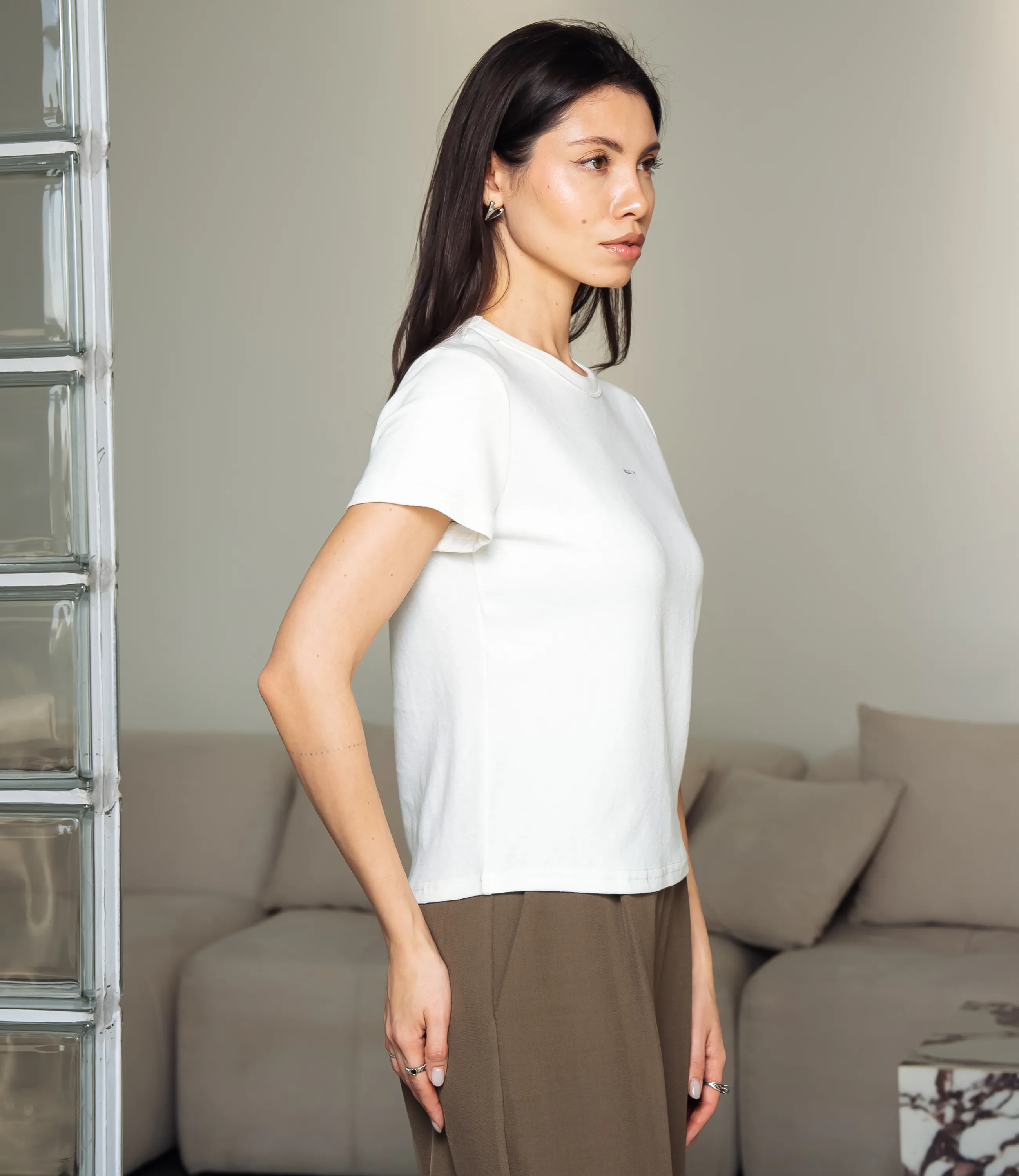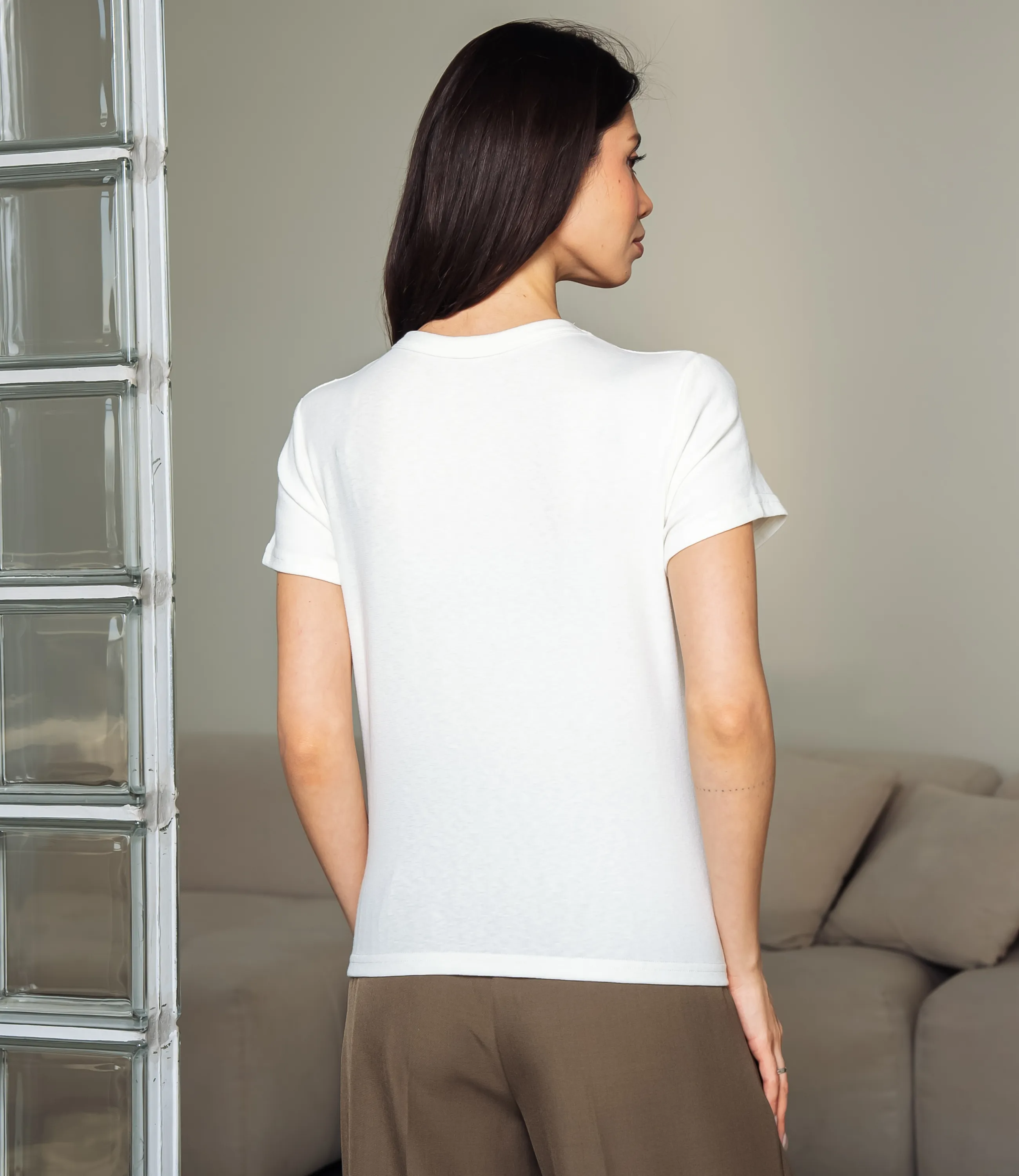 Эта футболка — прекрасный выбор для вашего магазина, предлагая стильный и универсальный дизайн, который станет отличным дополнением к гардеробу ваших клиентов. Футболка приталенного кроя с классическим круглым вырезом горловины, выполненная из тонкого, мягкого трикотажного полотна с небольшим стрейчем; плечевые швы слегка скошены для аккуратной посадки, короткие рукава средней длины, плотно прилегающие по руке. Передняя часть гладкая, на уровне груди расположен небольшой тонкий принт рукописного стиля. Выполненная из ткани с 95% хлопка, 5% спандекс, футболка обеспечивает отличное качество и приятные тактильные ощущения. Независимо от сезона, она станет любимым элементом в гардеробе ваших клиентов. На странице сайта доступна таблица размеров, что позволит вашим покупателям легко найти подходящий вариант. Установленная цена делает эту футболку доступной для широкой аудитории, что обеспечит вам высокий уровень продаж. Рост модели: 164, параметры: 83-61-89.