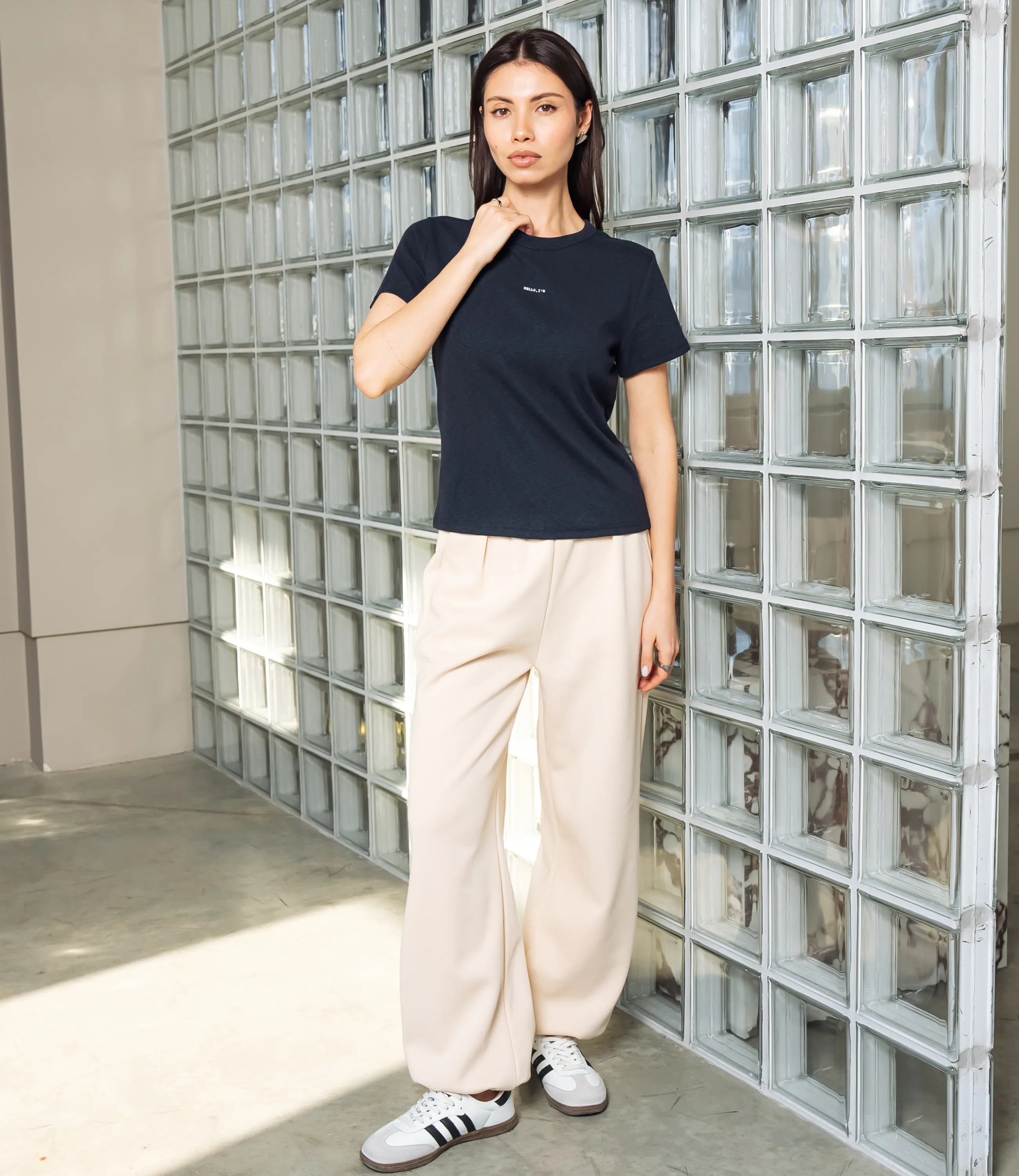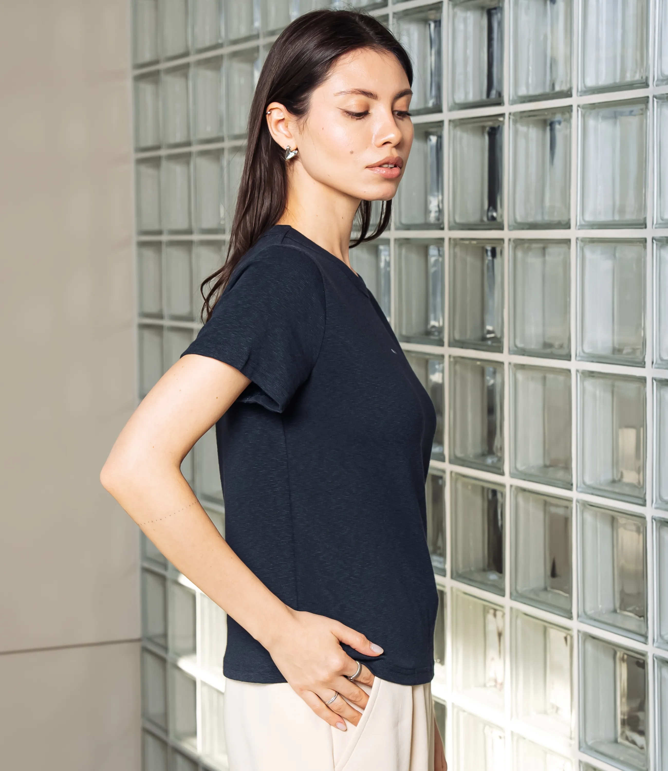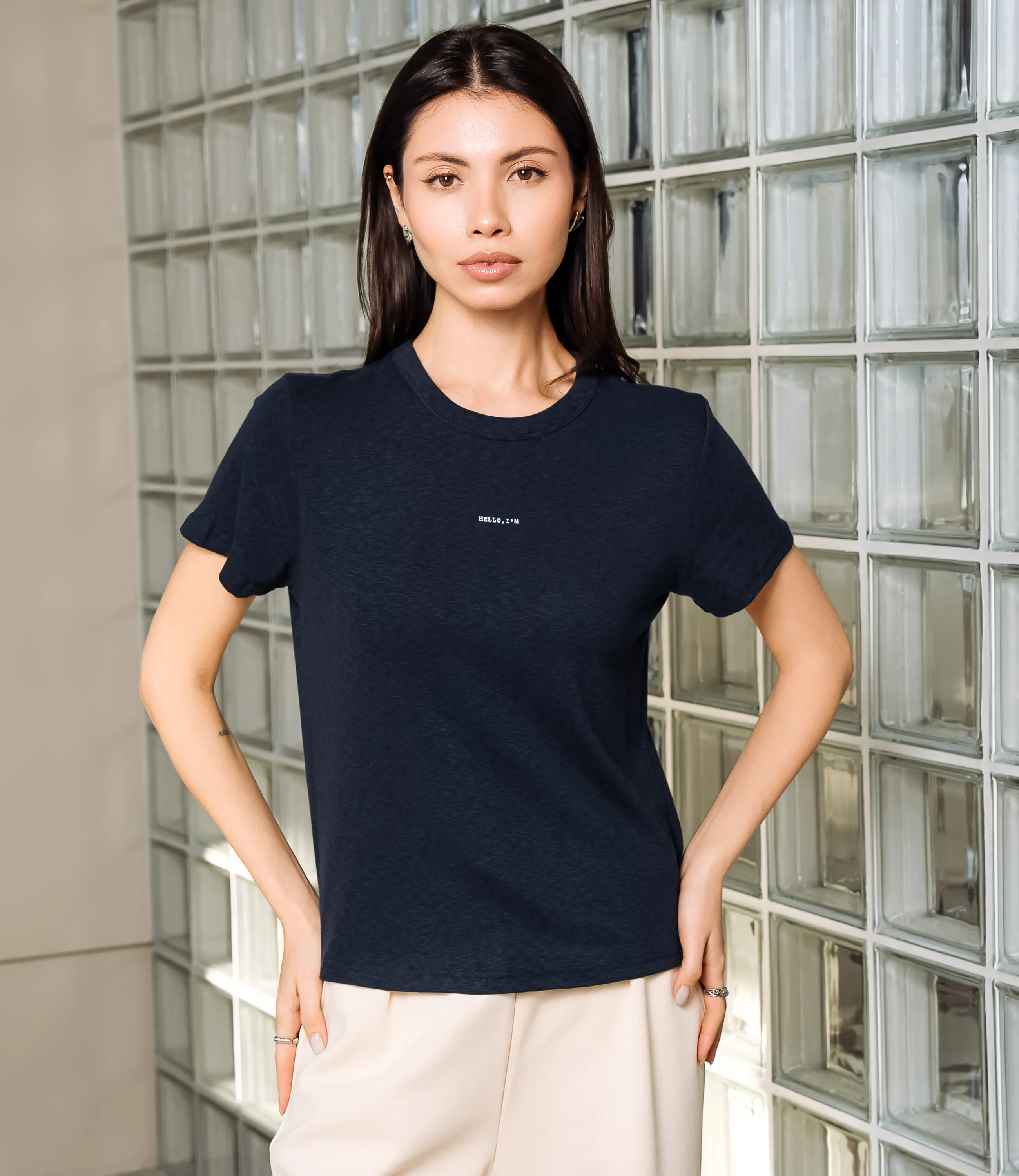 Эта футболка — прекрасный выбор для вашего магазина, предлагая стильный и универсальный дизайн, который станет отличным дополнением к гардеробу ваших клиентов. Футболка приталенного кроя с классическим круглым вырезом горловины, выполненная из тонкого, мягкого трикотажного полотна с небольшим стрейчем; плечевые швы слегка скошены для аккуратной посадки, короткие рукава средней длины, плотно прилегающие по руке. Передняя часть гладкая, на уровне груди расположен небольшой тонкий принт рукописного стиля. Выполненная из ткани с 95% хлопка, 5% спандекс, футболка обеспечивает отличное качество и приятные тактильные ощущения. Независимо от сезона, она станет любимым элементом в гардеробе ваших клиентов. На странице сайта доступна таблица размеров, что позволит вашим покупателям легко найти подходящий вариант. Установленная цена делает эту футболку доступной для широкой аудитории, что обеспечит вам высокий уровень продаж. Рост модели: 164, параметры: 83-61-89.