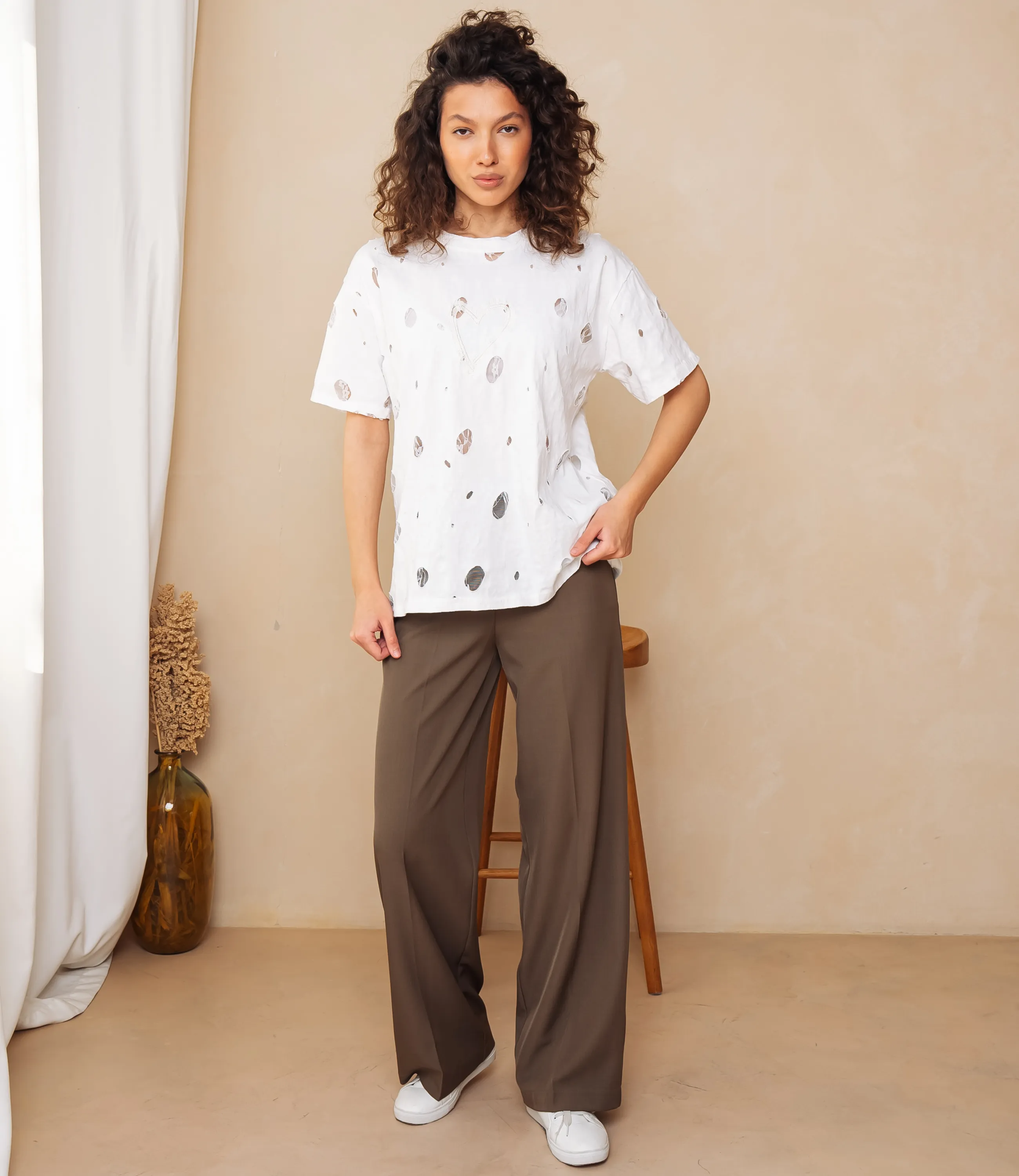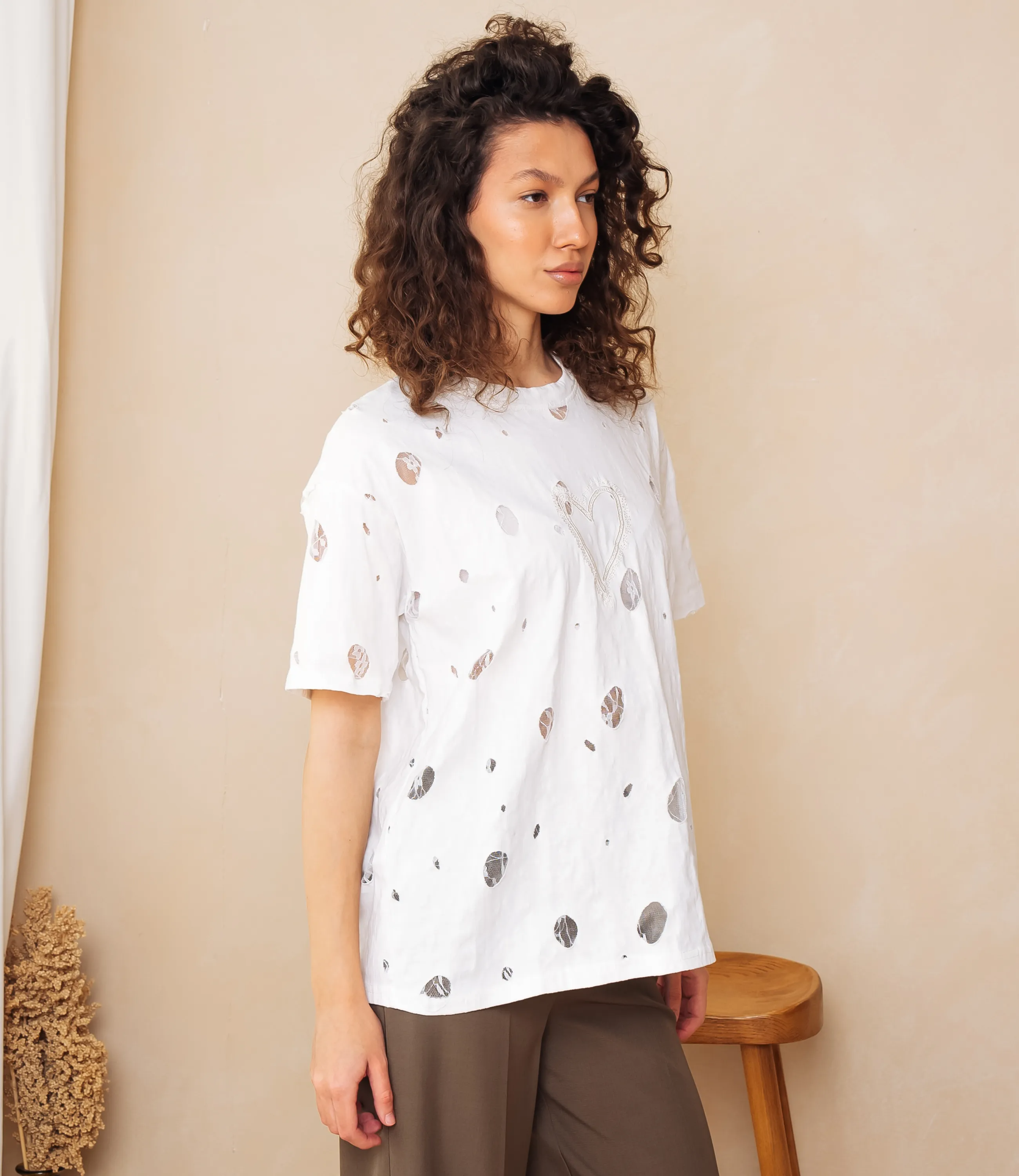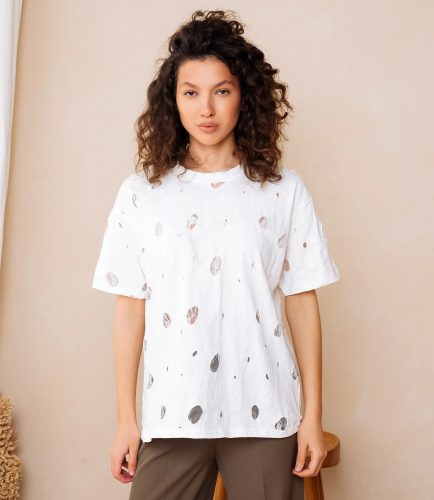 Футболка – это одежда, которая подчеркивает женственность каждой представительницы прекрасного пола. Футболка свободного кроя с классическим круглым вырезом горловины; короткие рукава средней длины, немного расширенные и с подшитым краем, не прилегают плотно к руке; длина корпуса доходящая до верхней части бёдер, прямой низ с подогнутым и простроченным подолом; поверхность украшена разбросанными мелкими абстрактными пятнами разной формы и центральным графическим мотивом в виде условного сердца на груди. Для изготовления использована ткань 65% хлопка и 35% полиэстер, которая характеризуется отличным качеством. Даже после большого количества стирок изделие не утратит первоначальной привлекательности. Вы будете носить его с радостью. Обратите внимание на цвет. Он является насыщенным и полностью соответствует фотографии на сайте. Чтобы вы были уверены в размере, мы представили на странице таблицу. Воспользовавшись ею, вы сможете сами обмерить себя и удостовериться. Установленная нами цена является доступной. Не откажите себе в удовольствии быть элегантной!