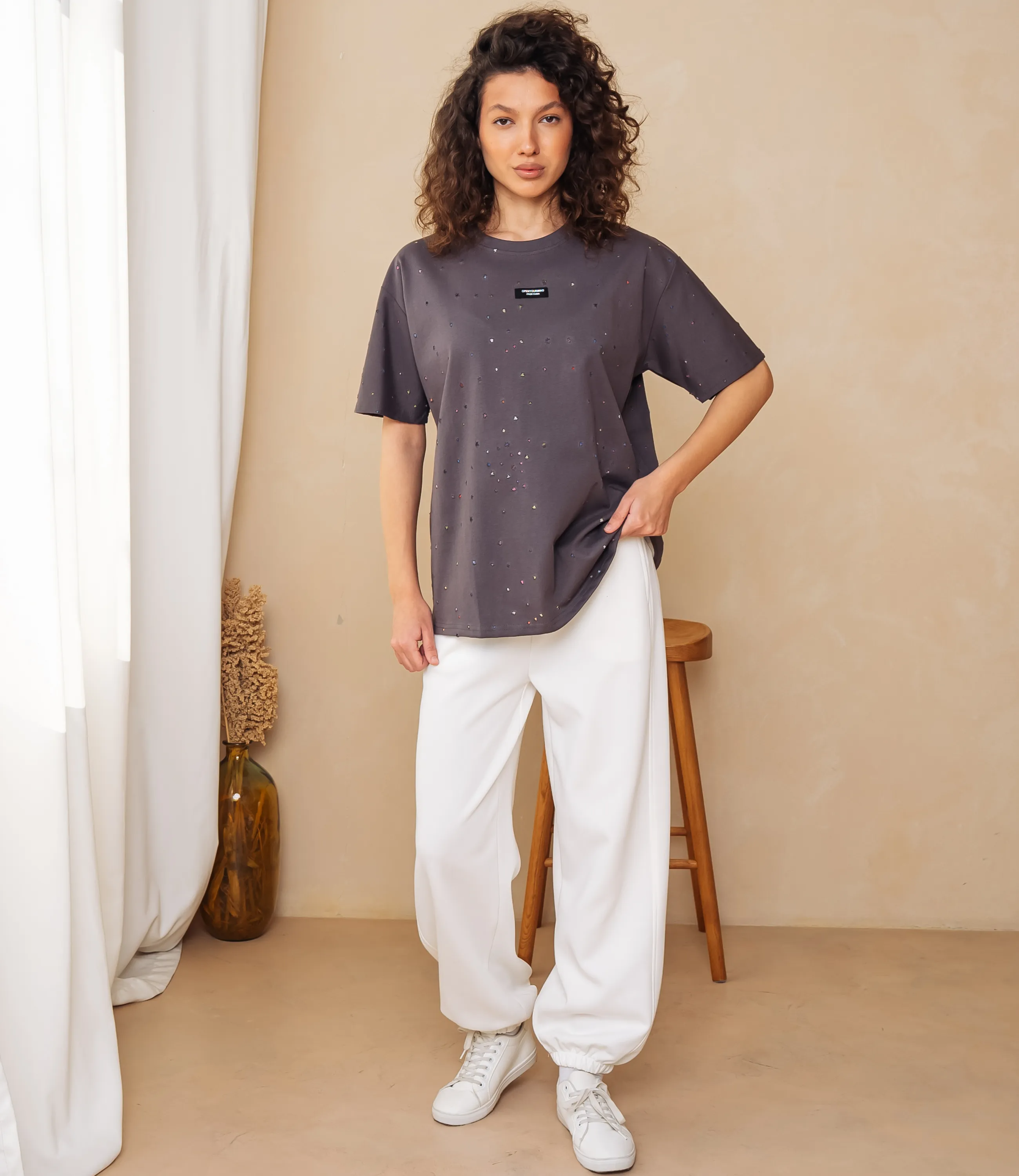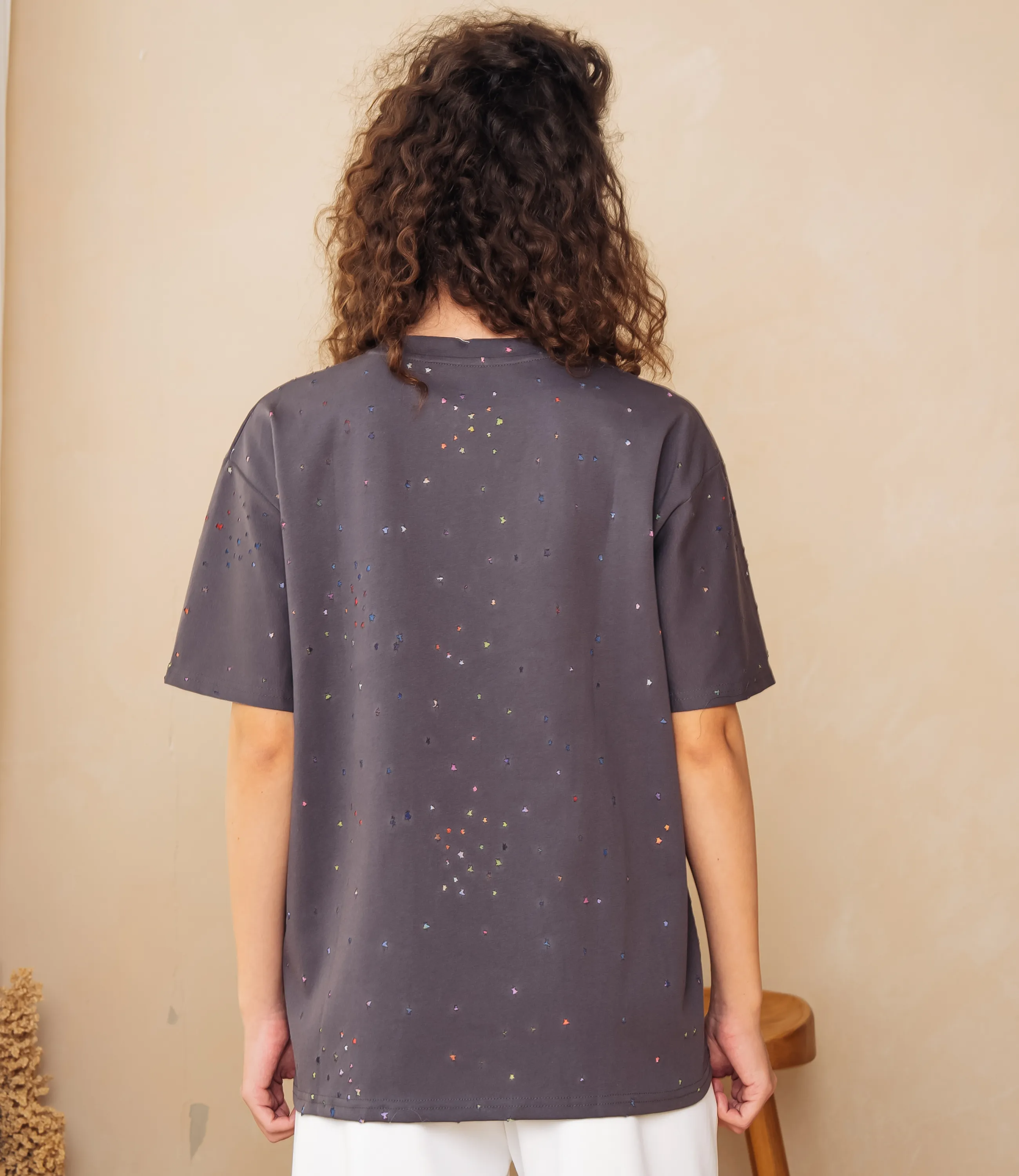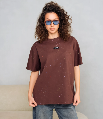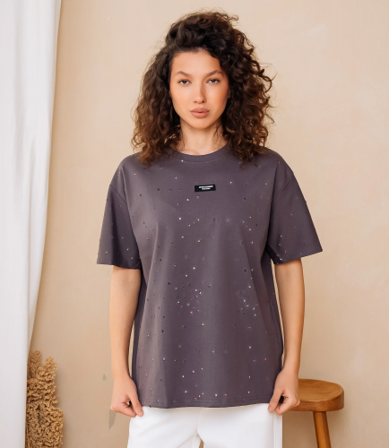 Футболка – это одежда, которая подчеркивает женственность каждой представительницы прекрасного пола. Футболка свободного кроя с классическим круглым вырезом горловины; короткие рукава средней длины, немного расширенные и с подшитым краем, не прилегают плотно к руке; длина корпуса доходящая до верхней части бёдер, прямой низ с подогнутым и простроченным подолом; поверхность украшена мелким разбросанным мотивом в виде точек разных размеров, на груди небольшая прямоугольная нашивка с текстовым элементом. Для изготовления использована ткань 65% хлопка и 35% полиэстер, которая характеризуется отличным качеством. Даже после большого количества стирок изделие не утратит первоначальной привлекательности. Вы будете носить его с радостью. Обратите внимание на цвет. Он является насыщенным и полностью соответствует фотографии на сайте. Чтобы вы были уверены в размере, мы представили на странице таблицу. Воспользовавшись ею, вы сможете сами обмерить себя и удостовериться. Установленная нами цена является доступной. Не откажите себе в удовольствии быть элегантной!