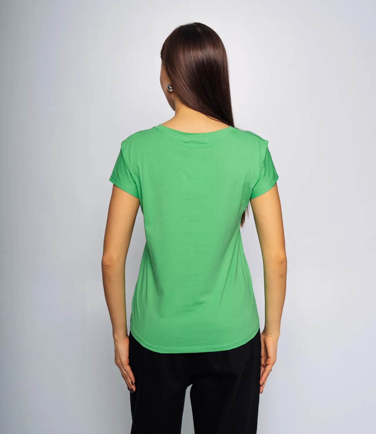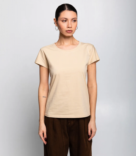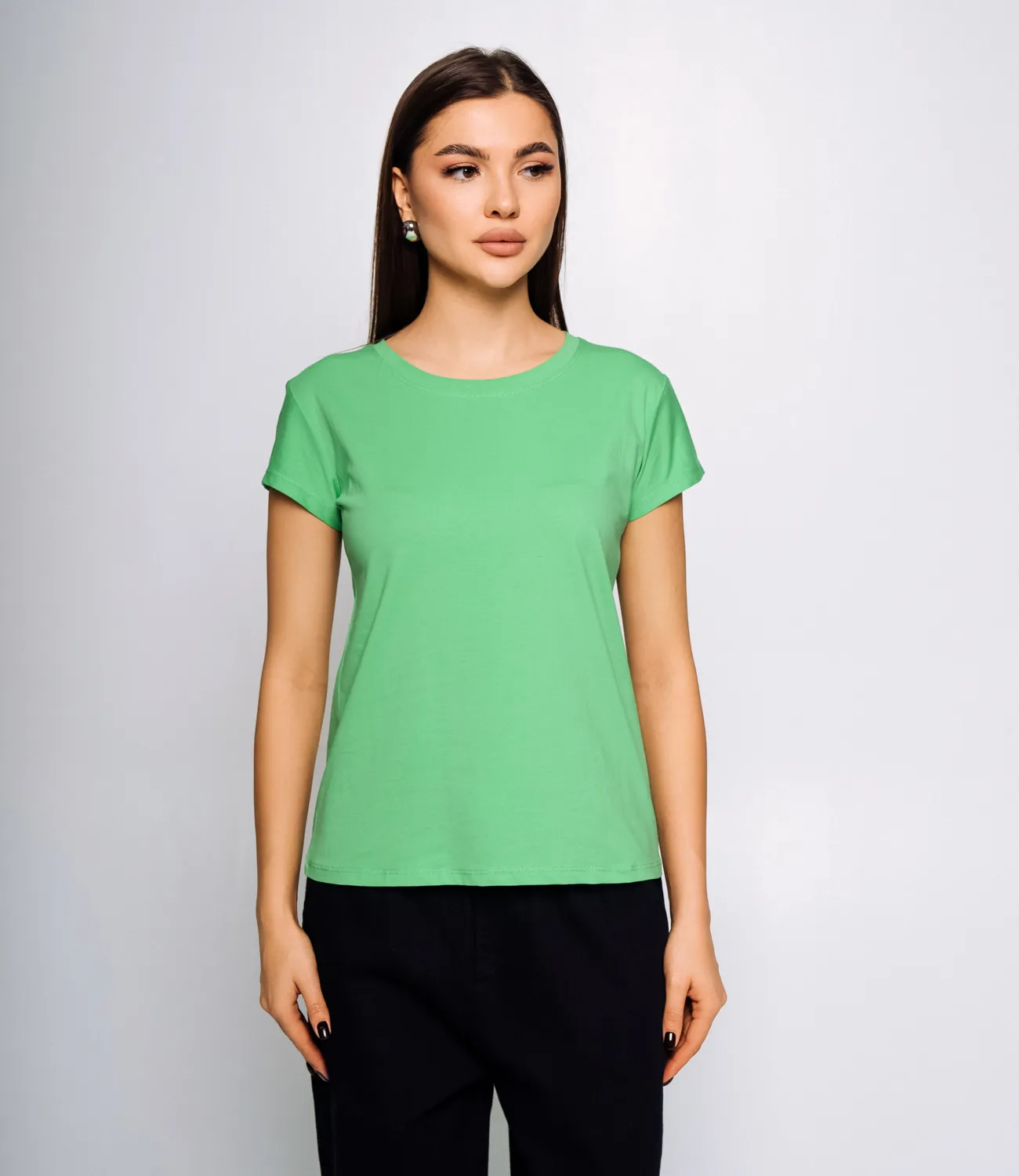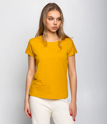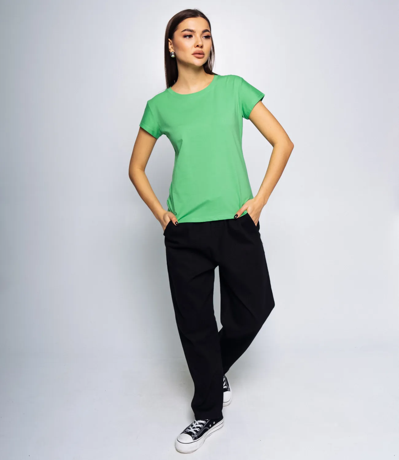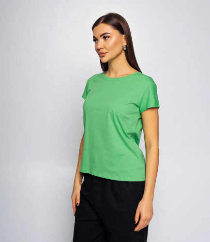 Базовая однотонная футболка с натуральным составом, идеальной длины. Универсальная модель прекрасно смотрится с джинсами, брюками, юбкой, также ее можно надевать в офис под пиджак или кардиган.