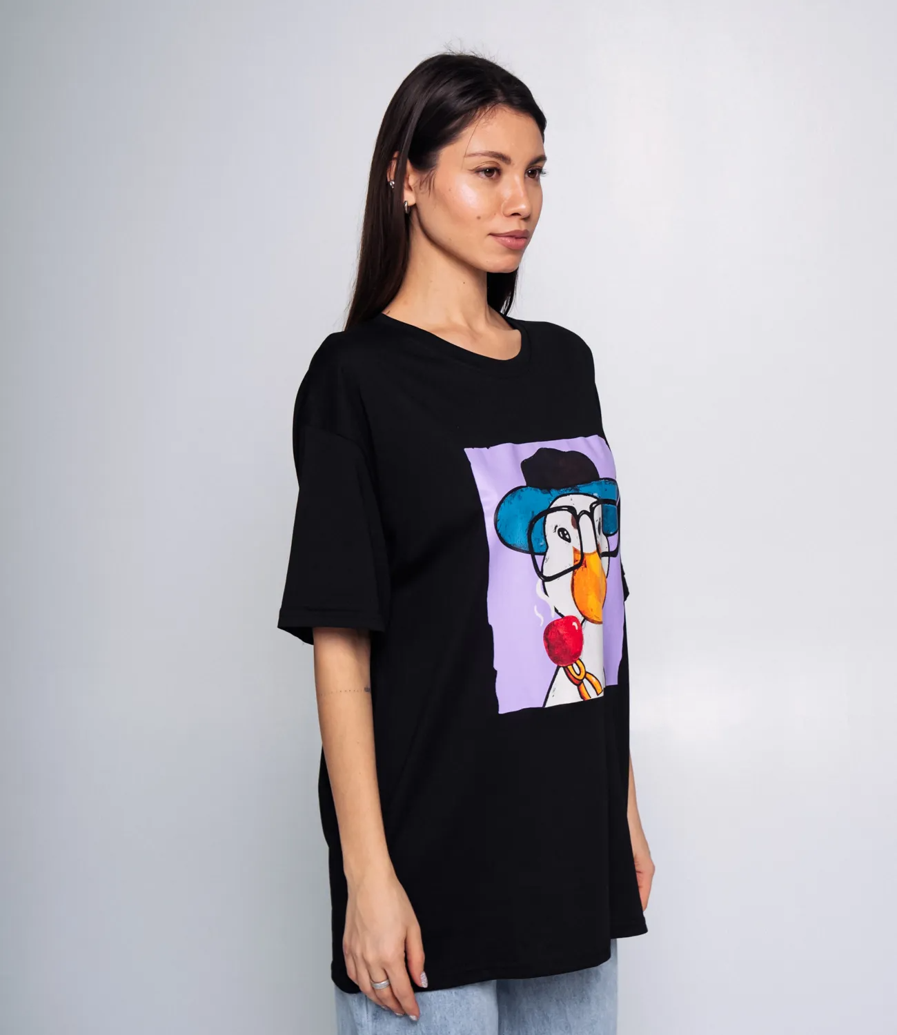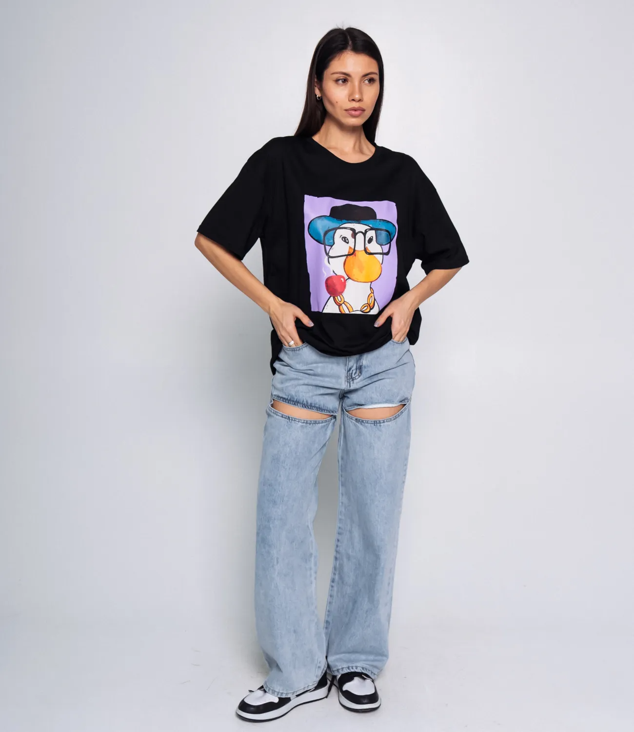 Эта футболка — прекрасный выбор для вашего магазина, предлагая стильный и универсальный дизайн, который станет отличным дополнением к гардеробу ваших клиентов. Свободный крой и объемные рукава обеспечивают максимальный комфорт, подчеркивая расслабленный уличный стиль. Яркий и оригинальный принт с изображением персонажа добавляет игривую нотку в образ, делая ее идеальной для тех, кто хочет выделиться на фоне стандартной одежды. Эта футболка отлично комбинируется с широкими джинсами, как показано на изображении, но также прекрасно смотрится в сочетании с шортами или юбками, создавая непринужденный и креативный лук. Она станет универсальной основой для повседневной носки и отлично подойдет для встреч с друзьями или прогулок по городу. Выполненная из ткани с 80% хлопка и 20% полиэстера, футболка обеспечивает отличное качество и приятные тактильные ощущения. Независимо от сезона, она станет любимым элементом в гардеробе ваших клиентов. На странице сайта доступна таблица размеров, что позволит вашим покупателям легко найти подходящий вариант. Установленная цена делает эту футболку доступной для широкой аудитории, что обеспечит вам высокий уровень продаж. Рост 164 см, 83-61-89.
