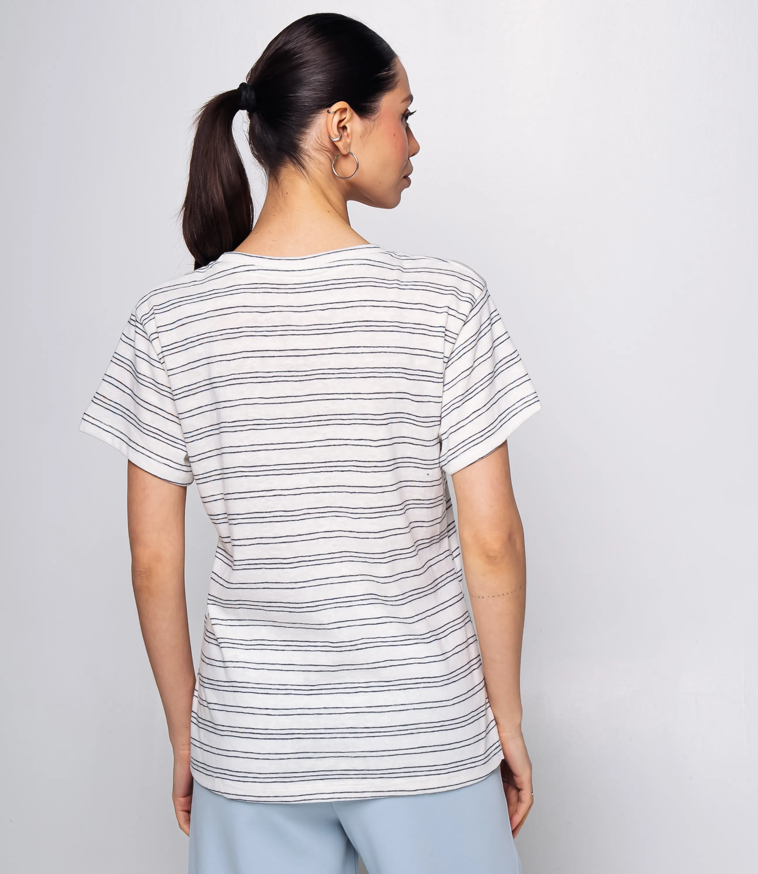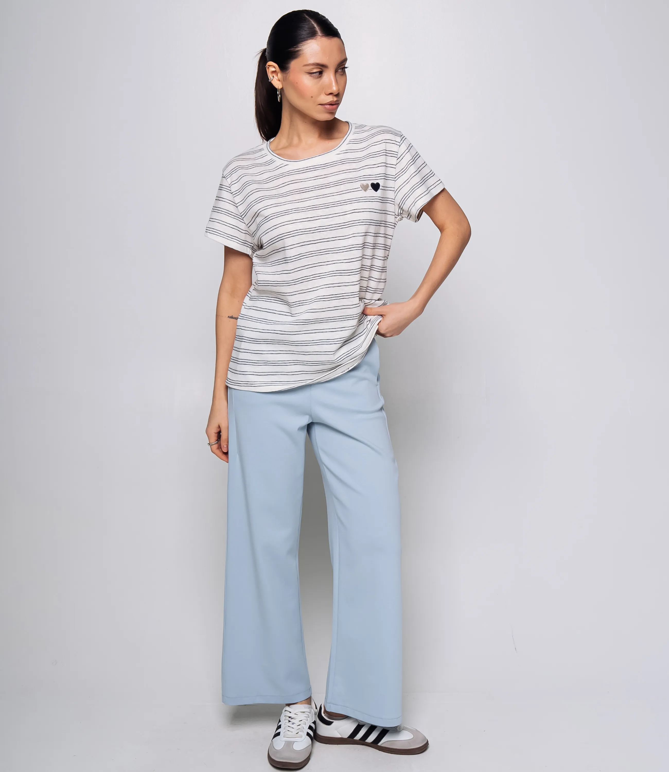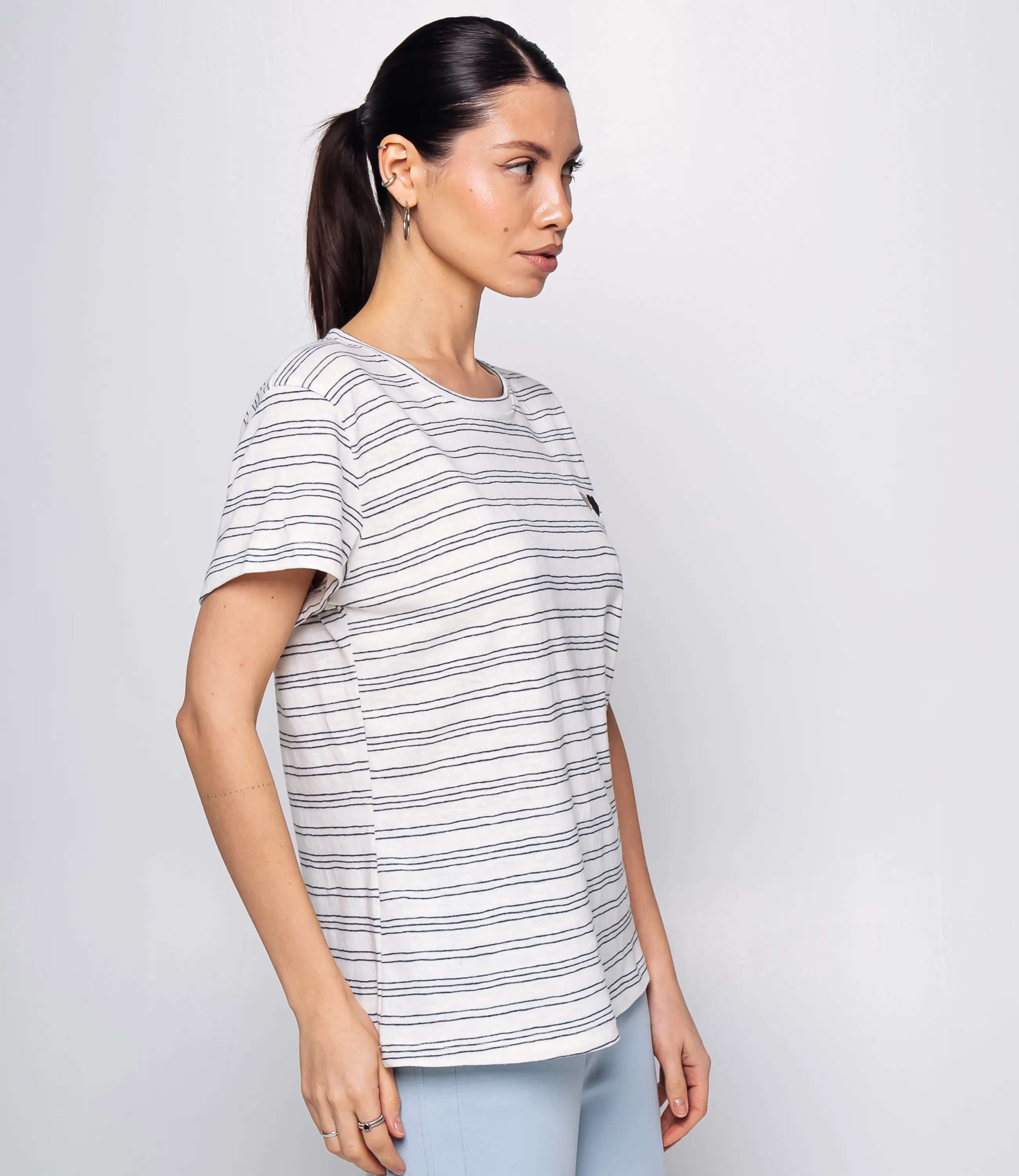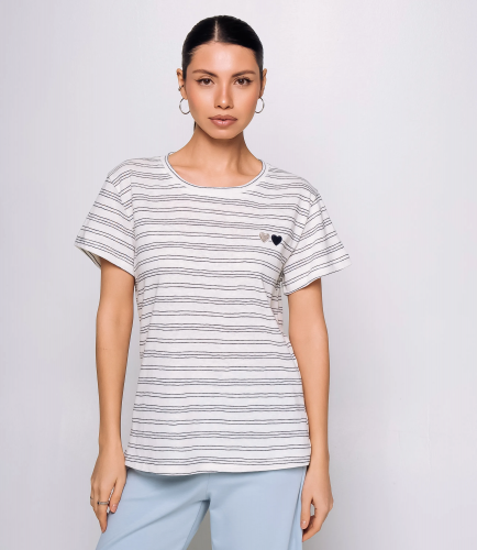 Футболка - это вещь, которая выделяет и подчеркивает уникальность каждой представительницы прекрасного пола. Футболка выполнена из мягкой однотонной основы с тонкими горизонтальными полосками, прямого свободного кроя, с круглым вырезом горловины. На левой стороне груди небольшая отделка в виде двух миниатюрных вышитых сердечек, расположенных рядом друг с другом; сердечки плоские, без объёма. Изделие из 65% хлопка и 35% полиэстера сохранит свою первоначальную привлекательность даже после многих стирок. Вы будете его носить с большим удовольствием. Обратите внимание на цвет - он является насыщенным и полностью соответствует фотографии на сайте. Чтобы вы не сомневались в размере, мы предоставили на странице таблицу. Воспользовавшись ею, вы сможете сами сделать мерки и убедиться. Установленная нами цена является доступной и адекватной. Подарите себе удовольствие быть элегантной и неповторимой с нашей футболкой!