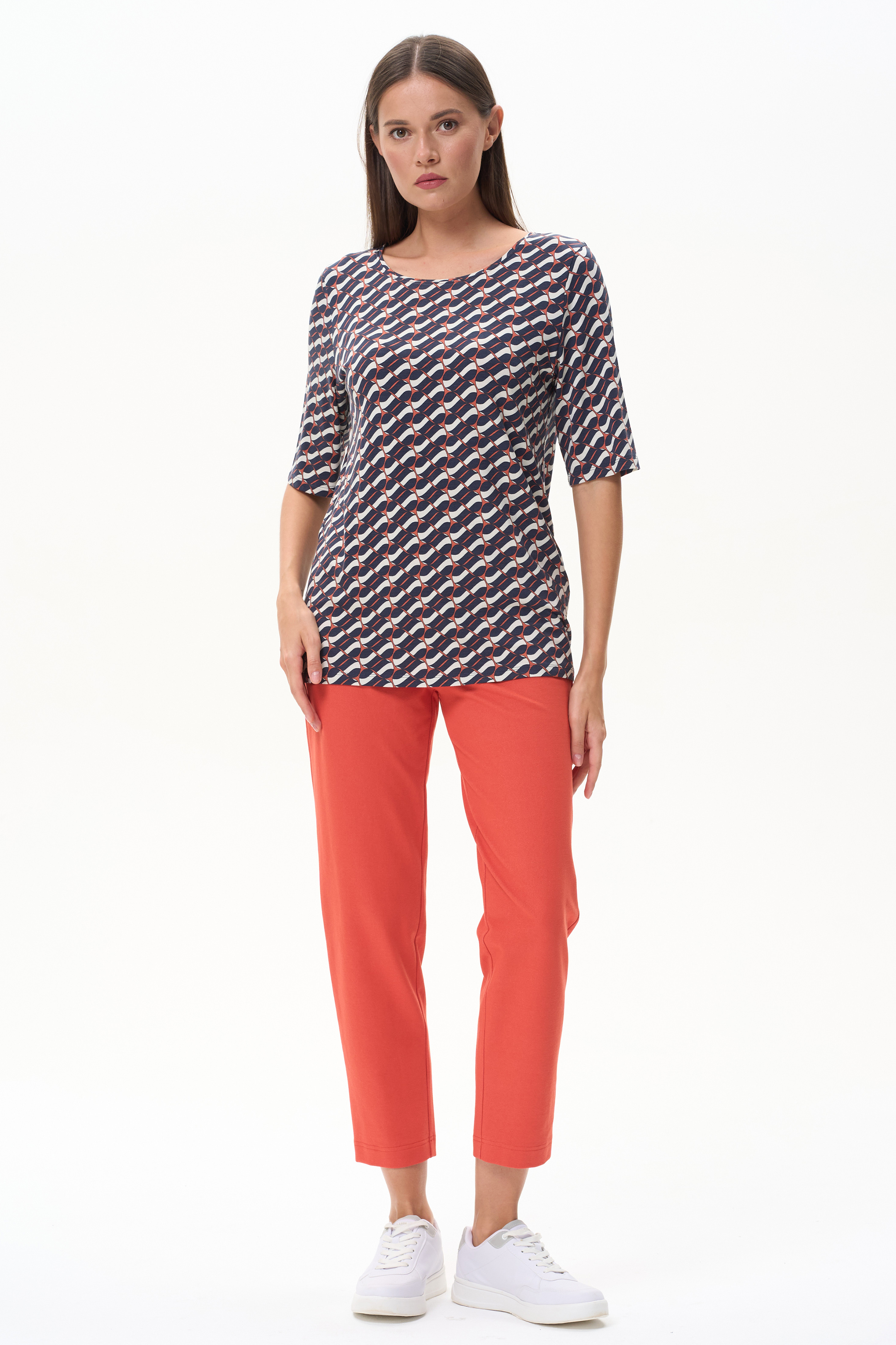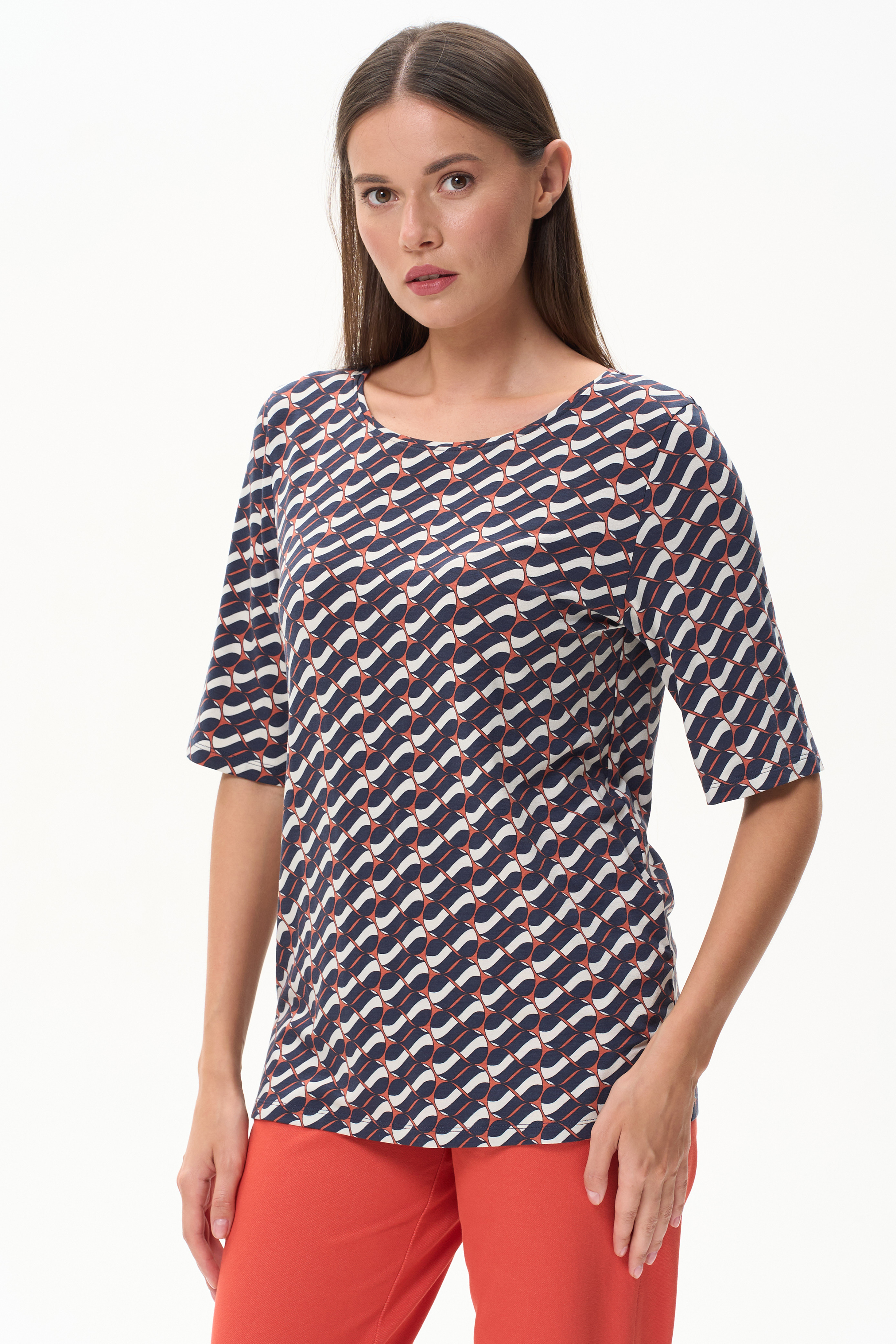 Базовая блузка из вискозы с Графическим рисунком в стиле Gucci. Втачные рукава до локтя, длина блузки закрывает паховую зону. Рост модели 175 см