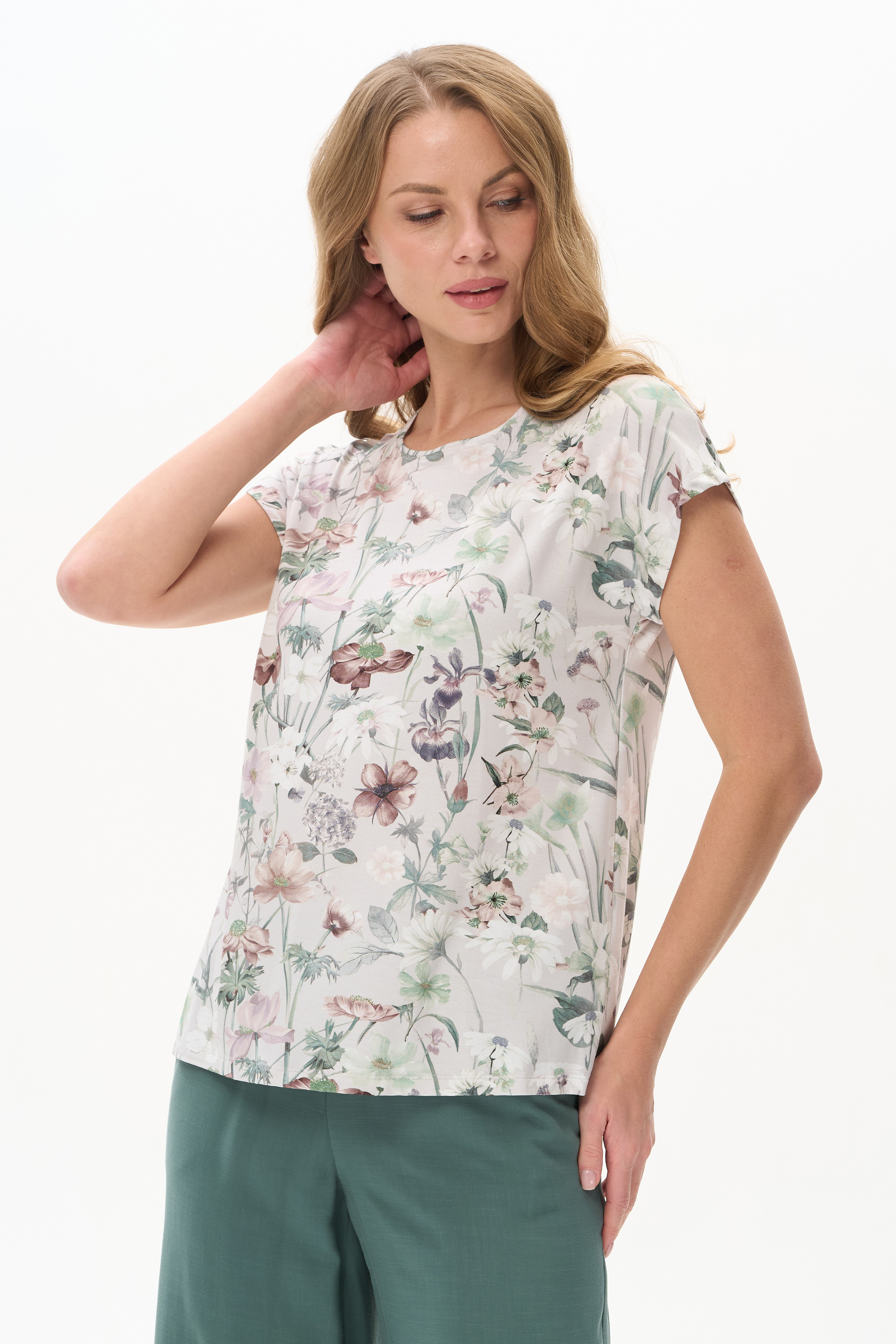Футболка прямого силуэта из вискозного полотна c дизайнерским Цветочным рисунком . Модель со спущенной линией плеча, цельнокроеные короткие рукава, круглый вырез горловины, длиной чуть ниже середины бедер. Универсальная, комфортная модель для лета в невероятно красивой расцветке. Рост модели 175 см