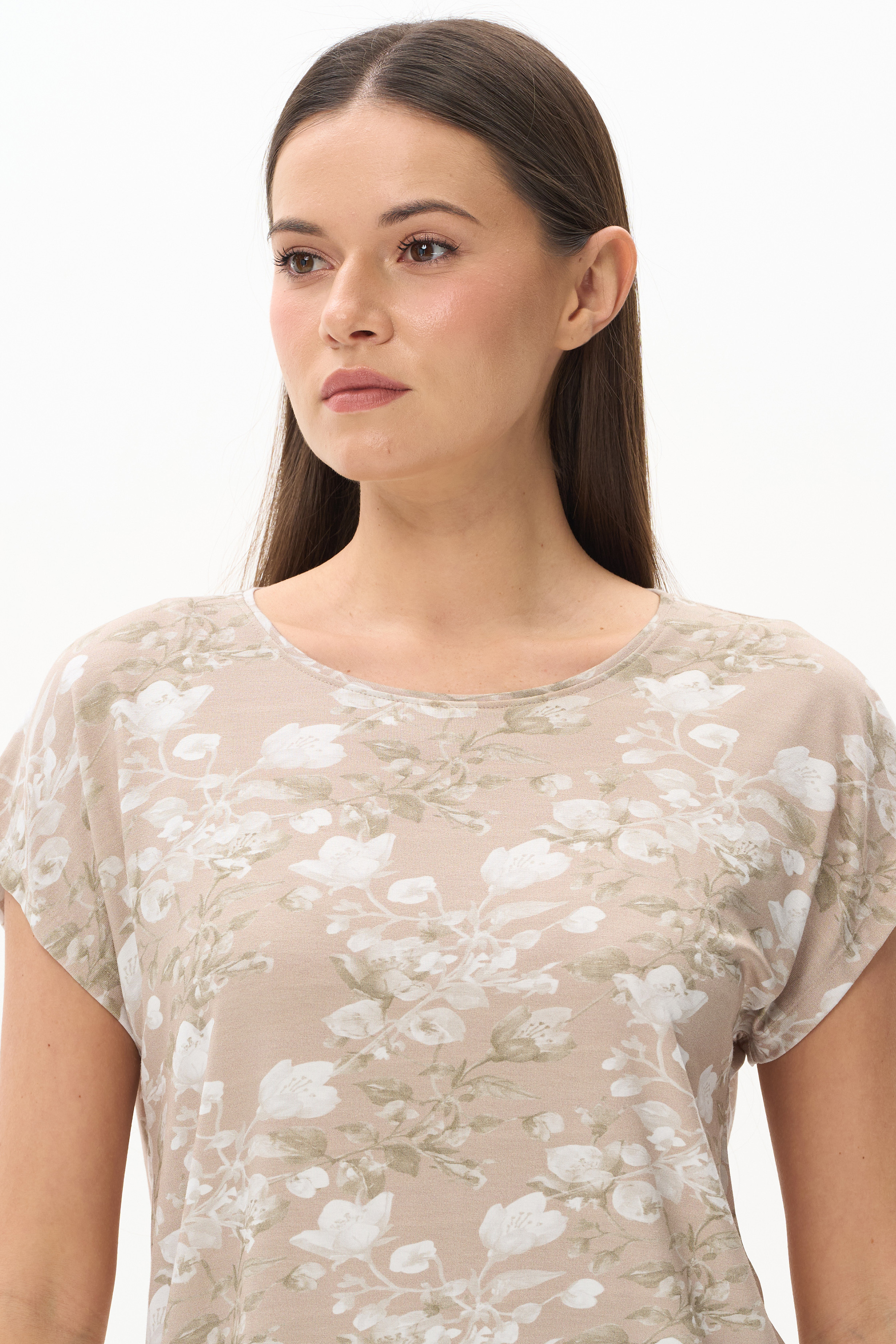 Футболка прямого силуэта из вискозного трикотажного полотна с эластаном. Круглый вырез горловины, цельнокроеные короткие рукава. Рост модели 175 см.