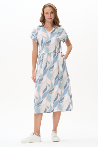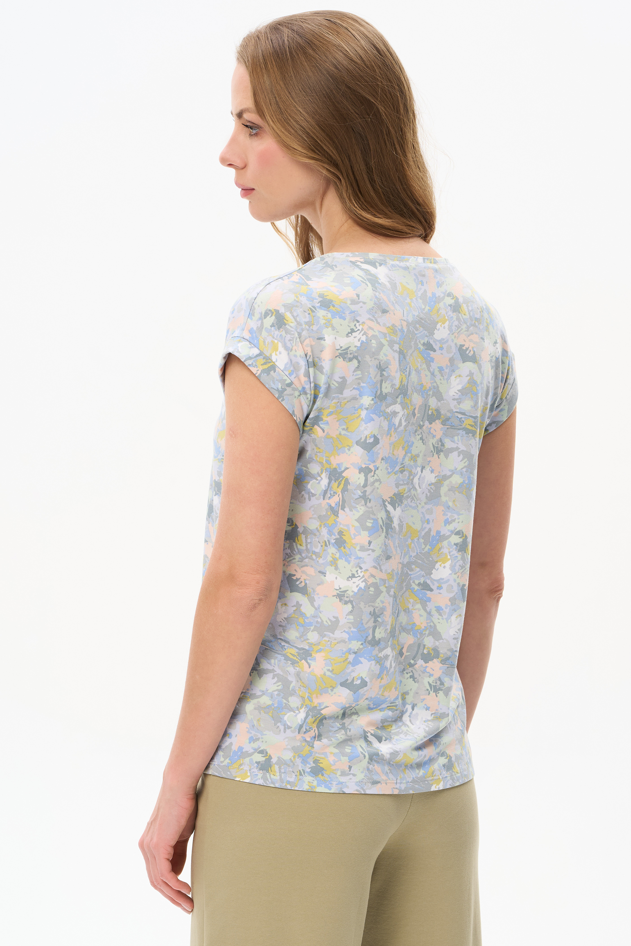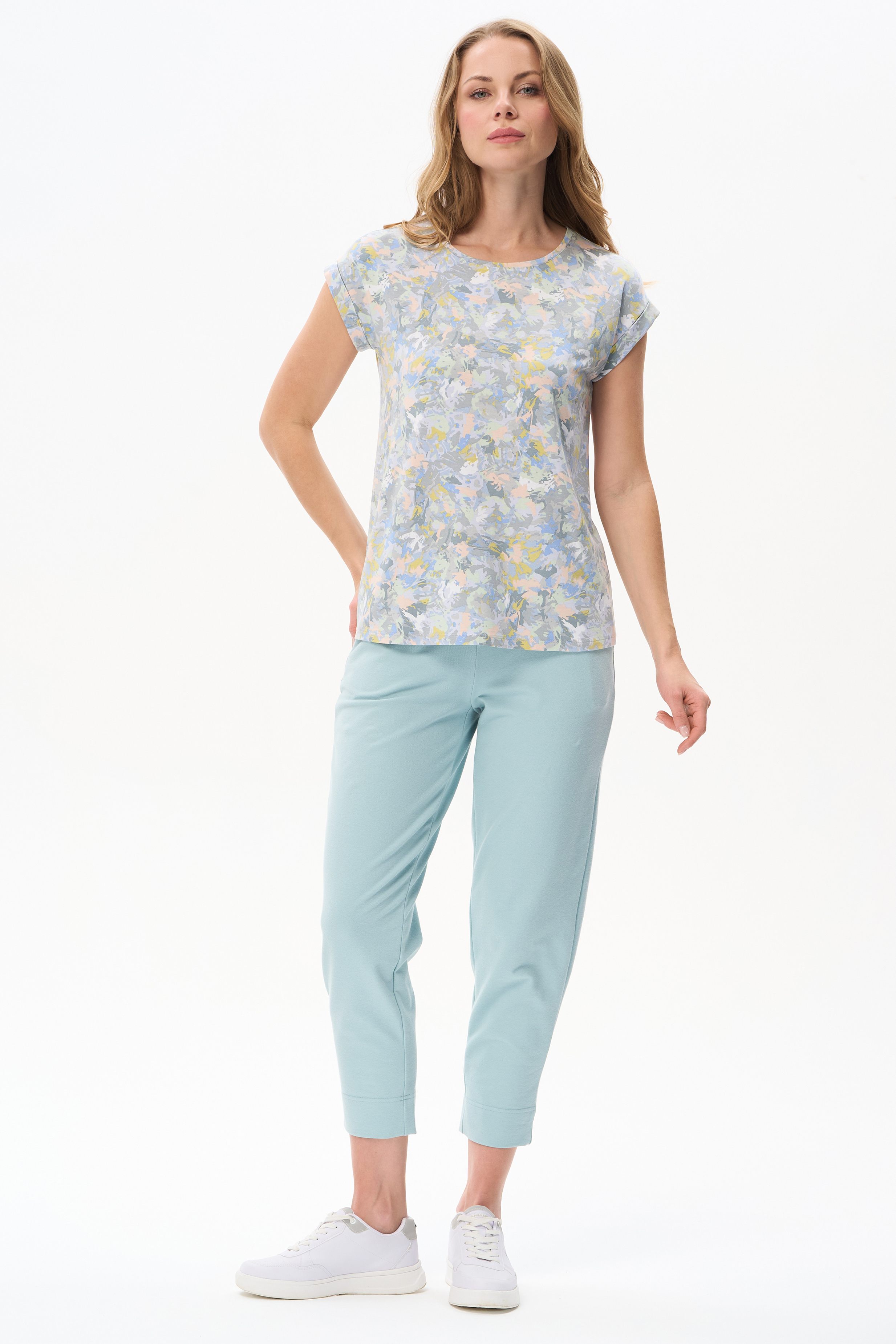 Футболка прямого силуэта из вискозного полотна с абстрактным принтом. Модель со спущеной линией плеча, цельнокроеные короткие рукава с зафиксированными подворотами, круглый вырез горловины, длиной чуть ниже середины бедер. Универсальная, комфортная модель на любой случай. Рост модели 175 см.