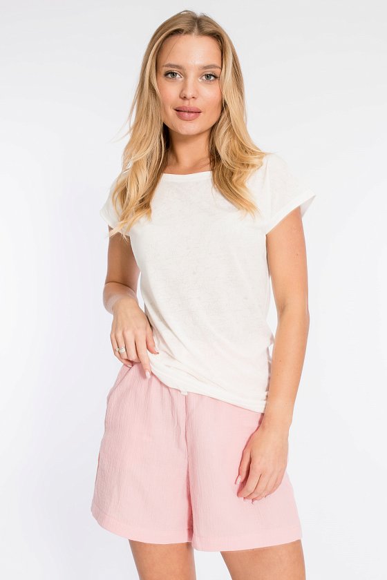 Футболка пошита из деворе - ткани, украшенной декоративным фактурным рисунком, напоминающим витраж. Горловина имеет круглый вырез, рукав короткий, цельнокроеный.